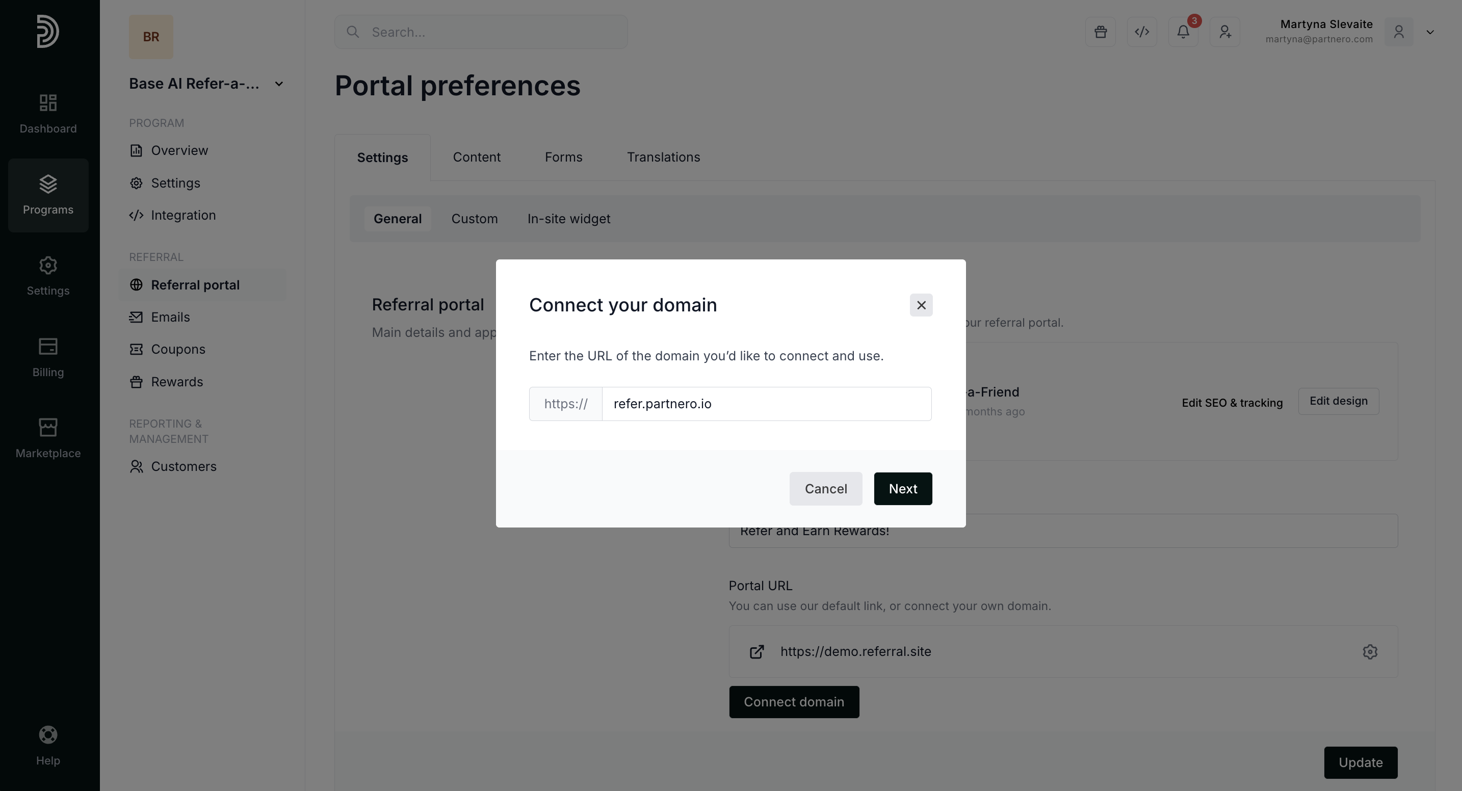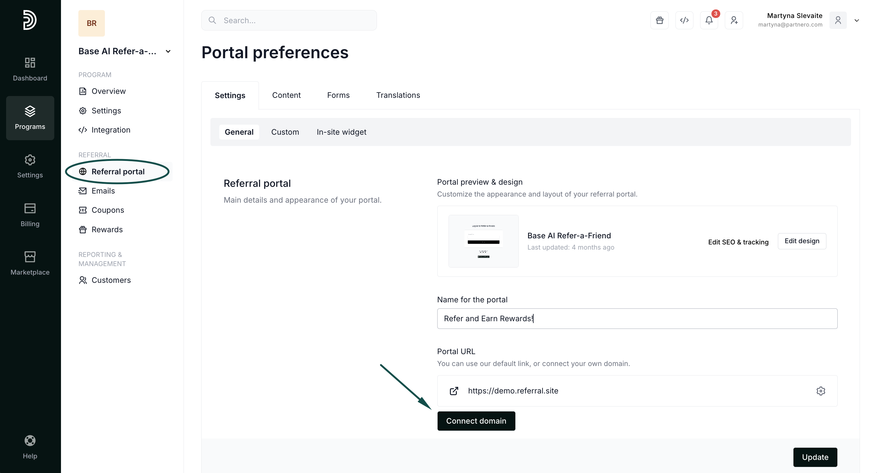 - In the Settings tab, click Connect domain next to the Referral portal URL: