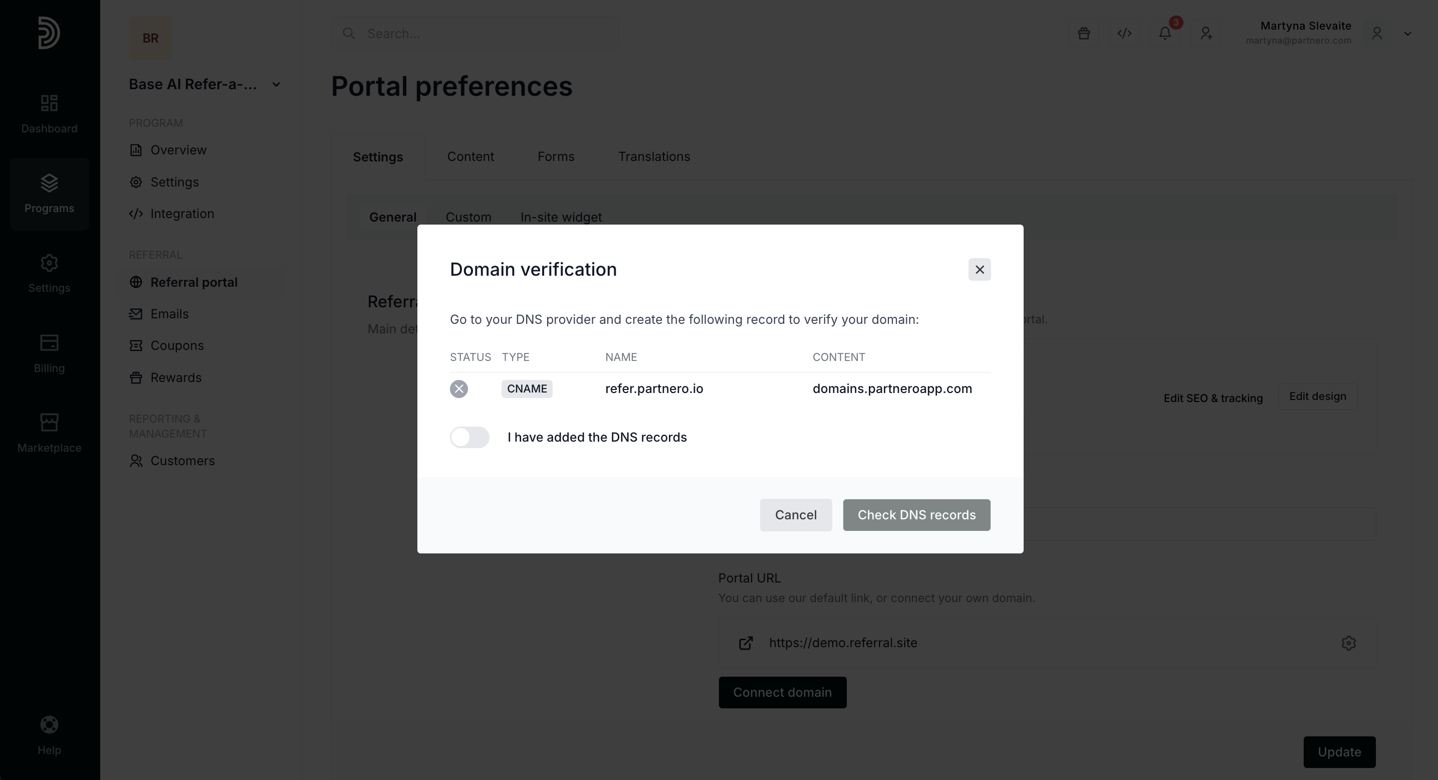 - Create a DNS record with CNAME type and fill out the Name and Value fields given to you on your Partnero account.