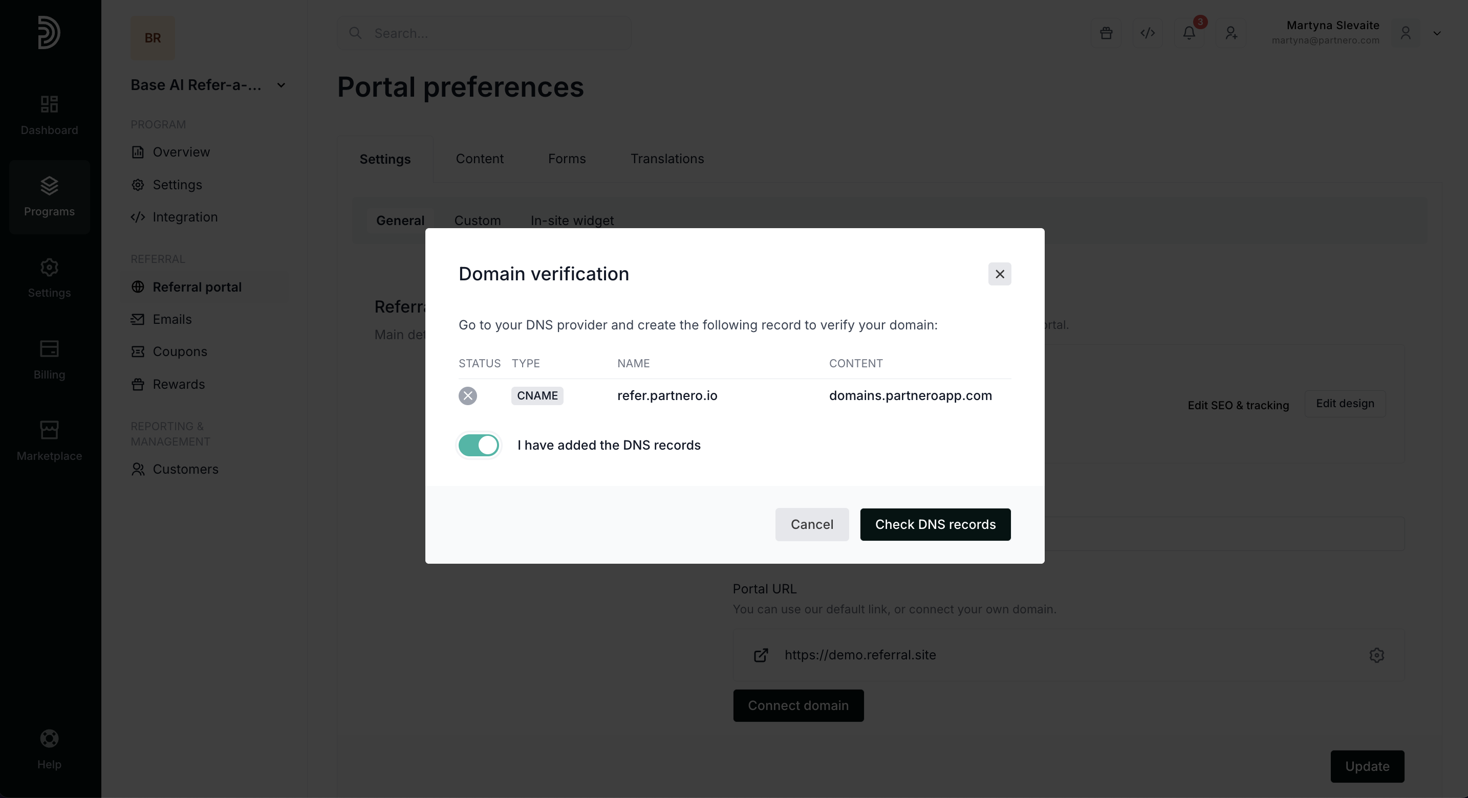 - Once you've created the record, toggle the "I have added the DNS record" setting and click Check DNS settings.