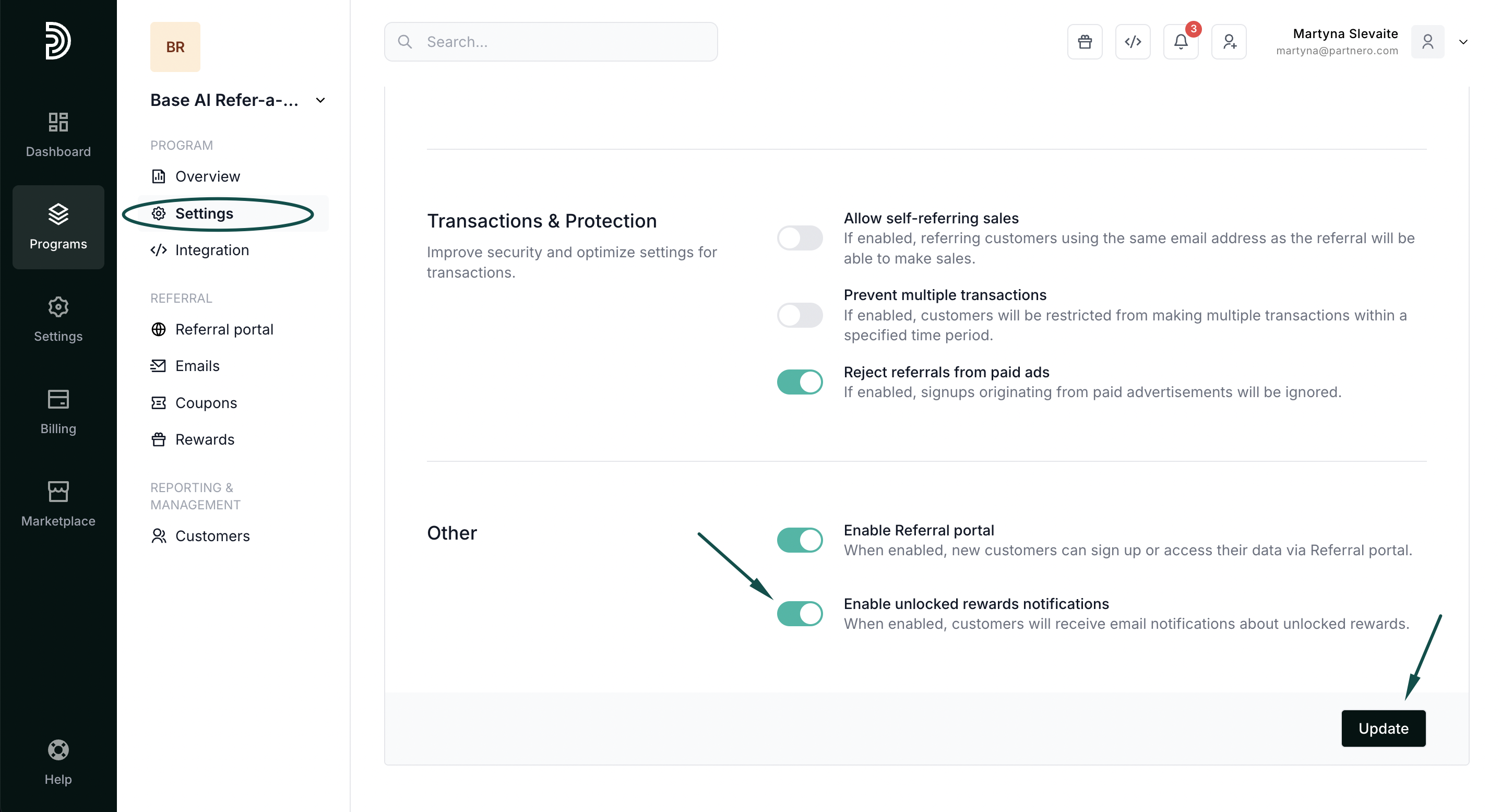 Additionally, you can opt in to receive notifications when your customers unlock a reward.