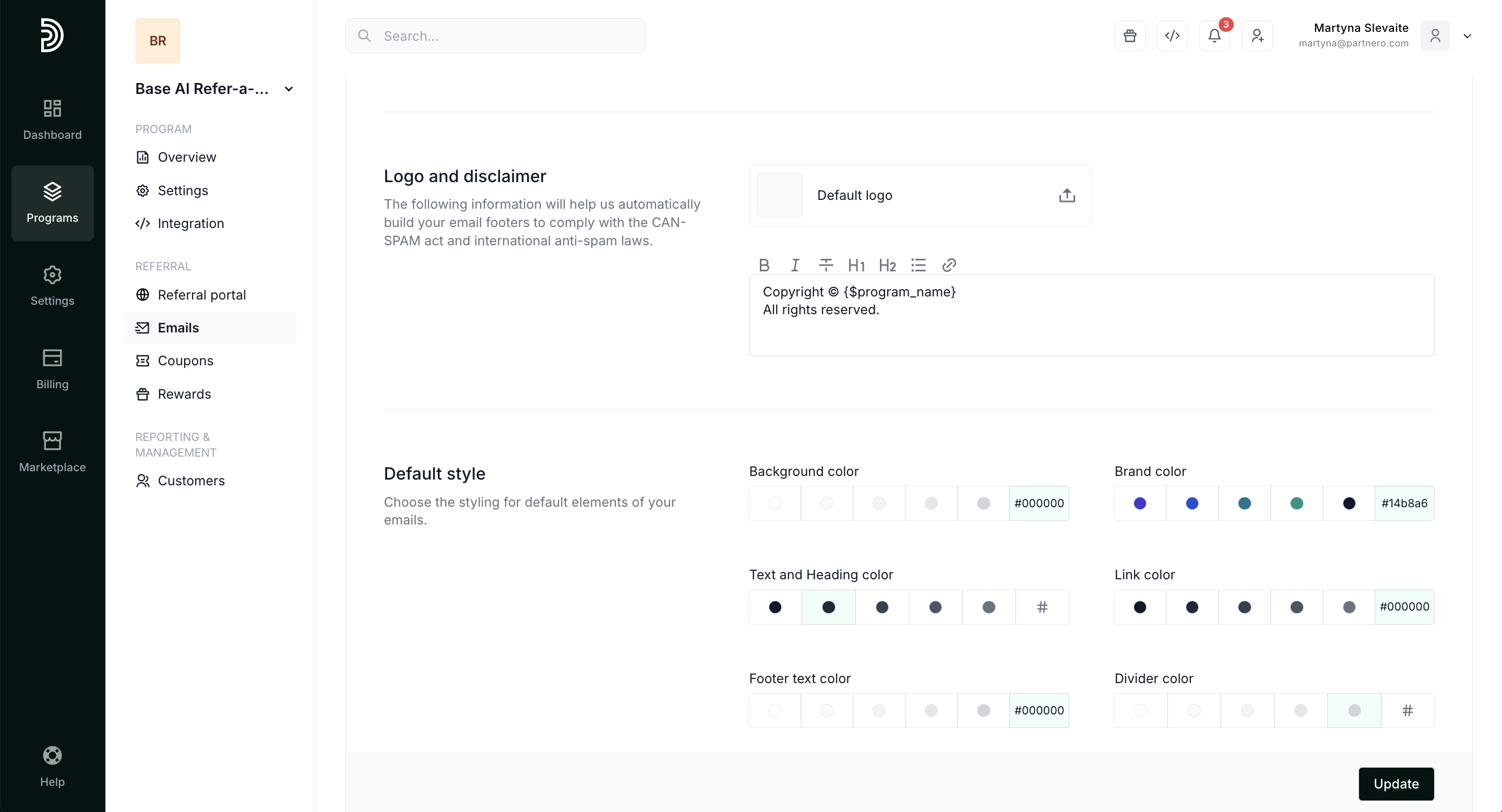 Lastly, you'll find the option to add a logo and disclaimer as well as styling options that will be used across all program emails.