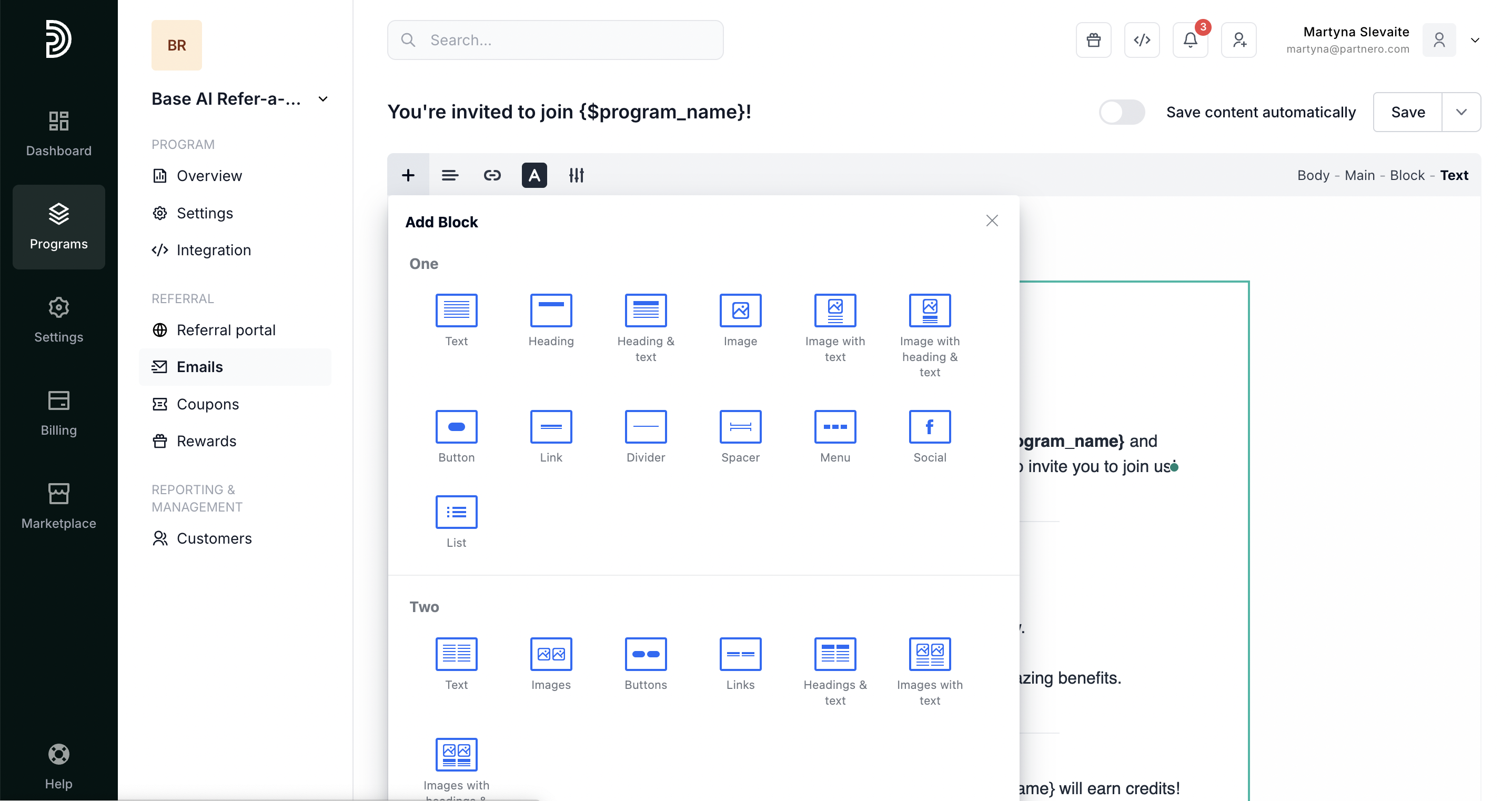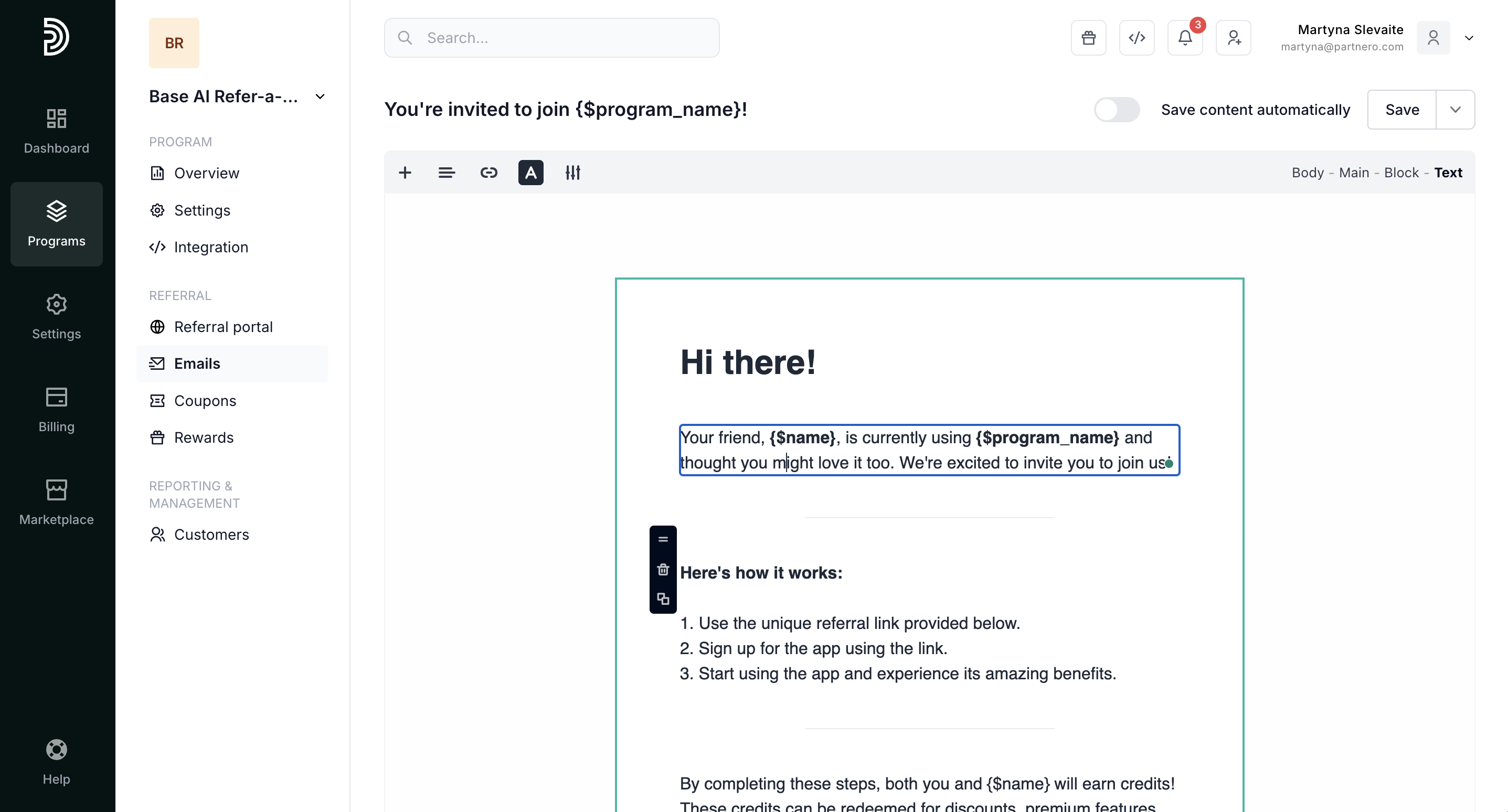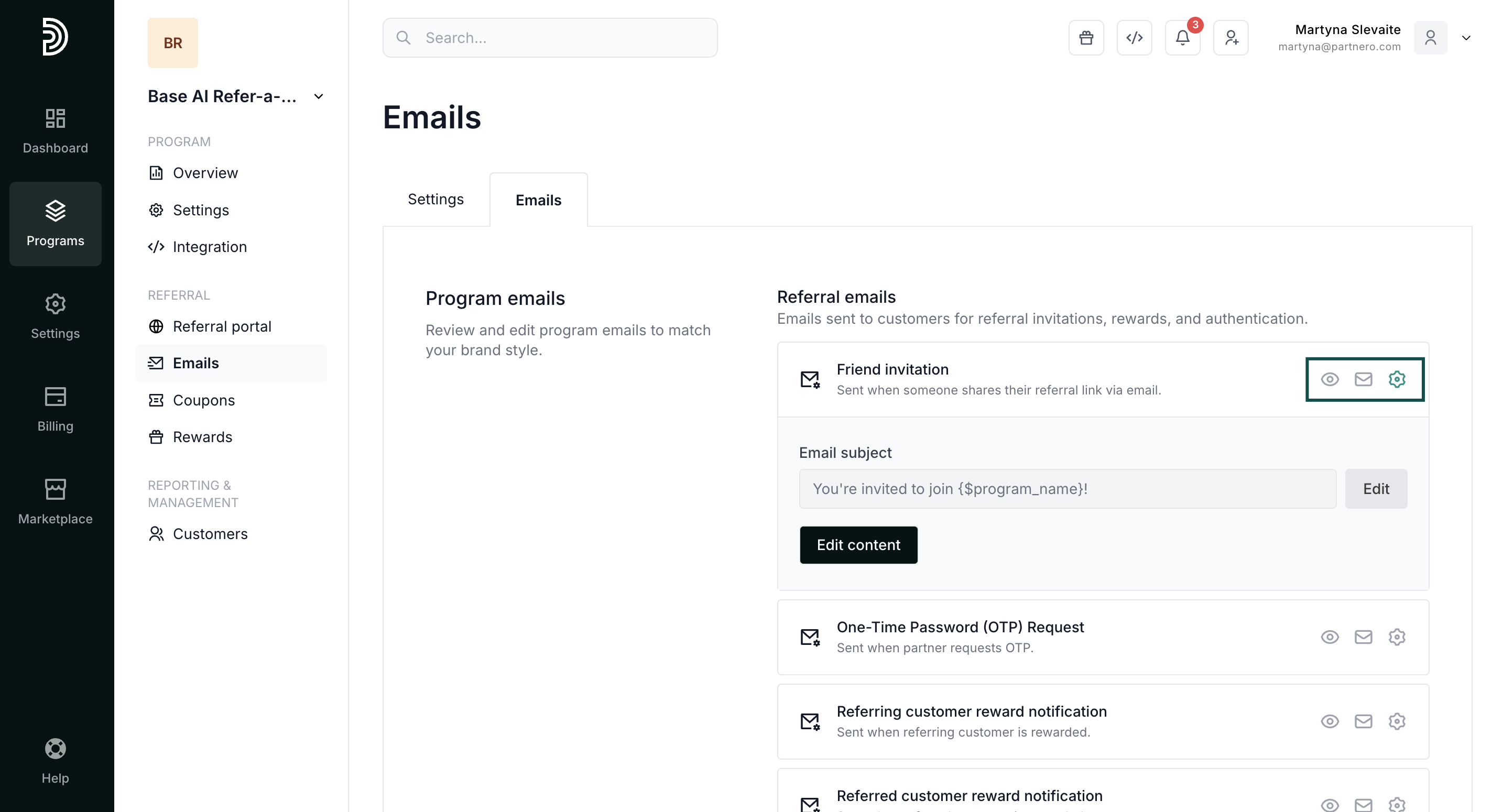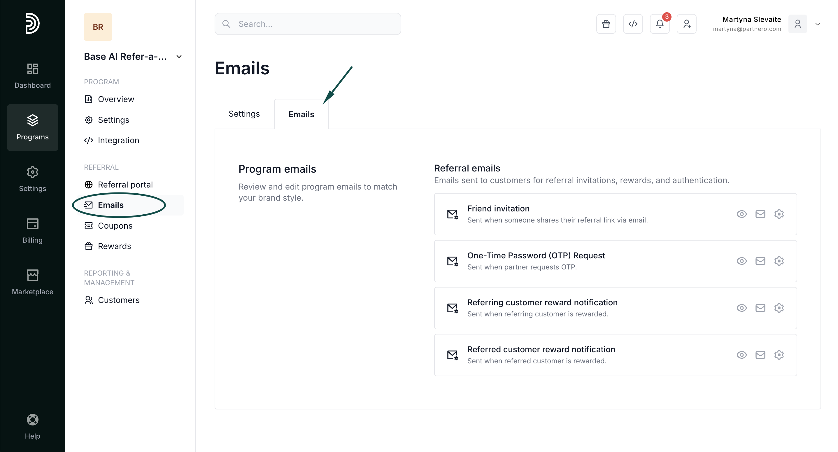 - In your program, go to Emails under Referral. Switch to the Emails tab: