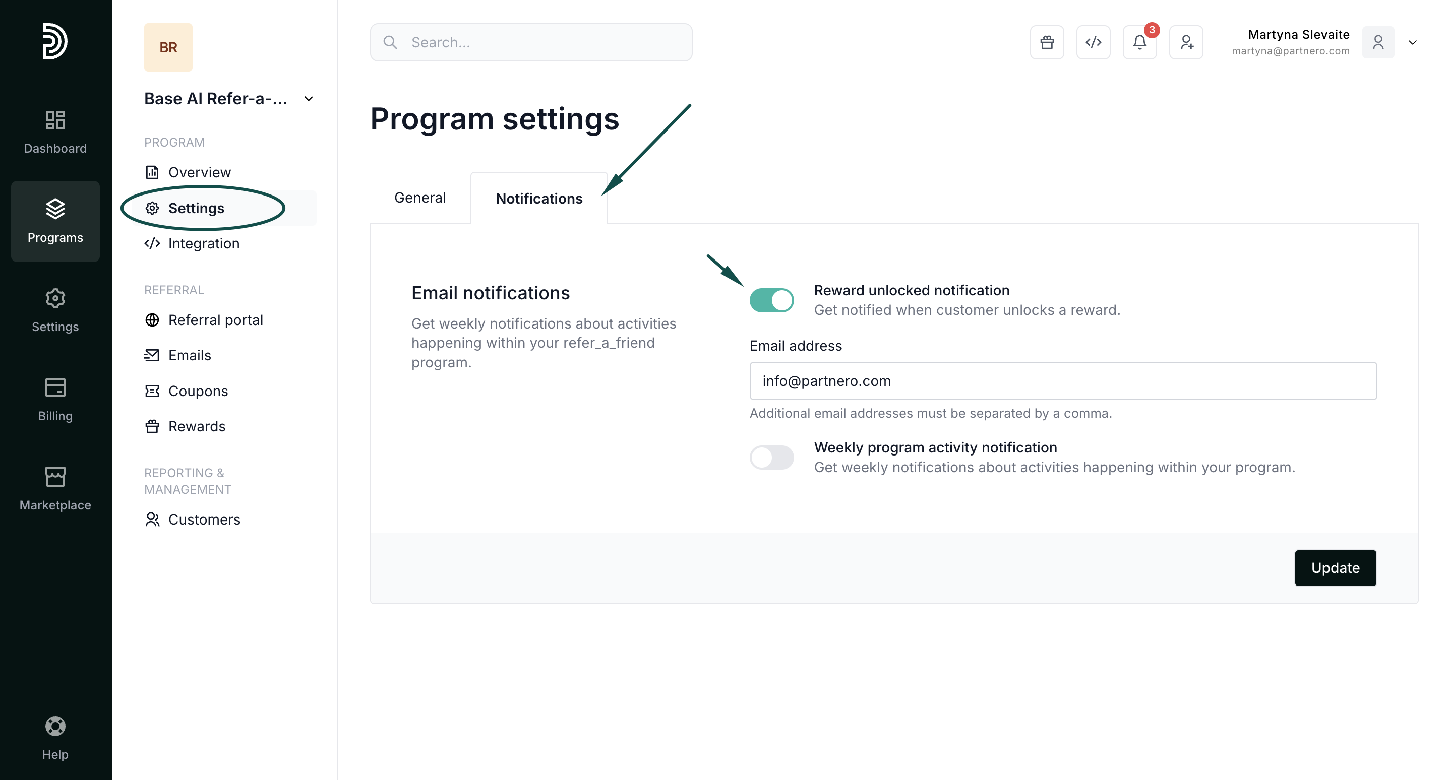 - Toggle "Rewards unlocked notification" and enter your email address.