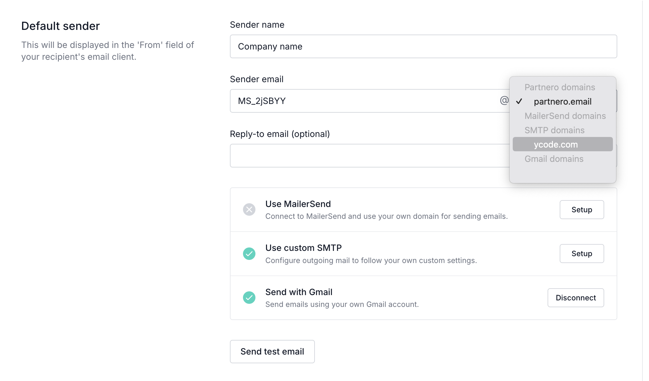 - Once your domain is successfully connected, you will see it listed as an option under the Sender email domain select: