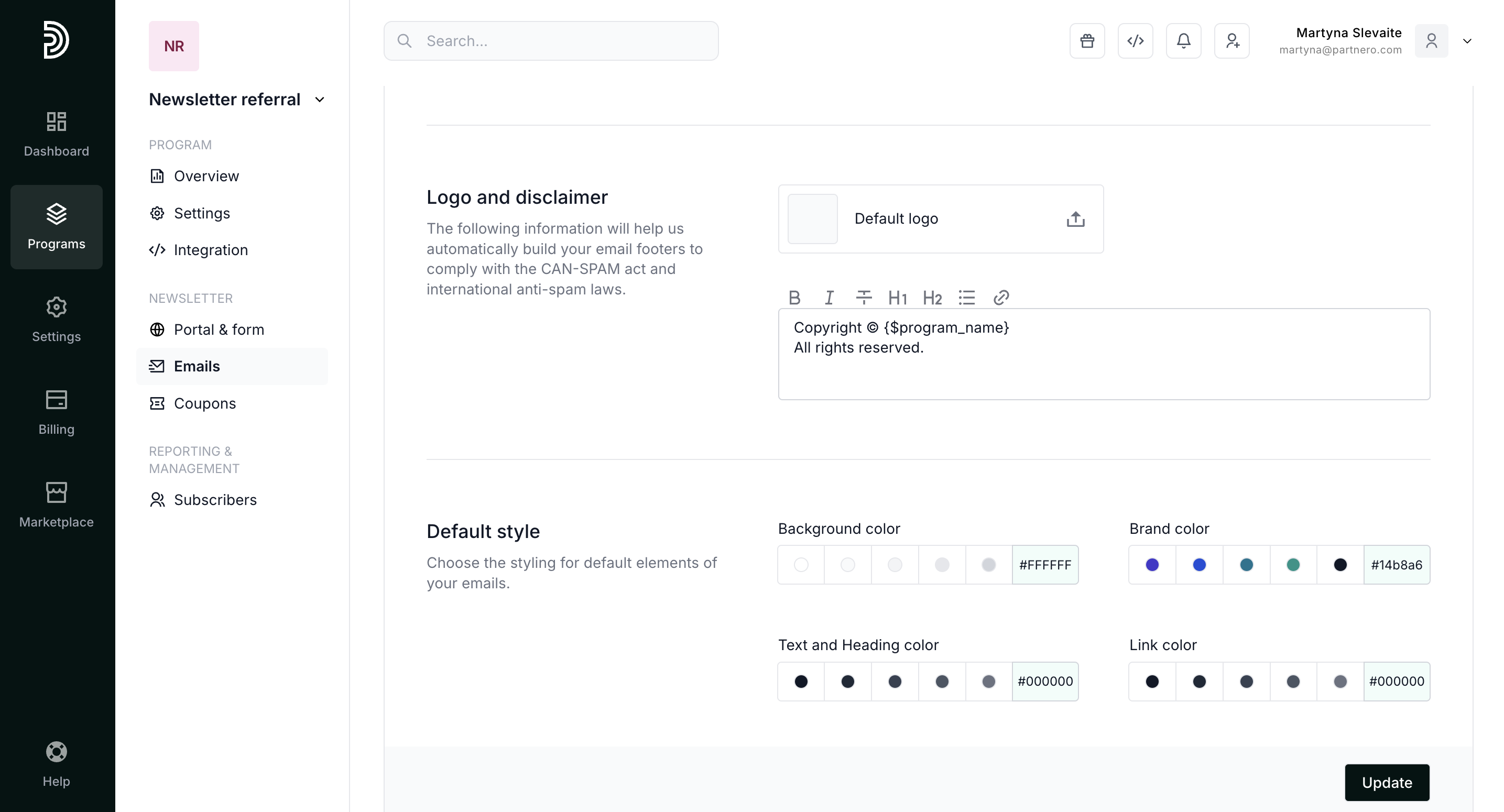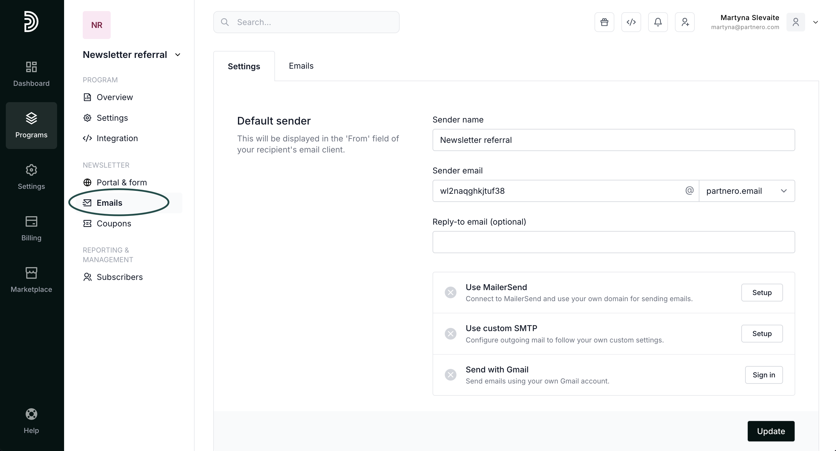 | Sender email | All emails are sent from a default domain @partnero.email. Here, you can enter your preferred email prefix (e.g., yourbrand@partnero.email). |