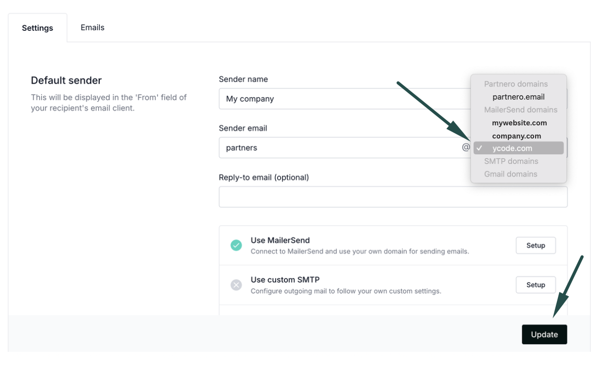 - Under Emails, Settings tab, click Setup next to MailerSend.
