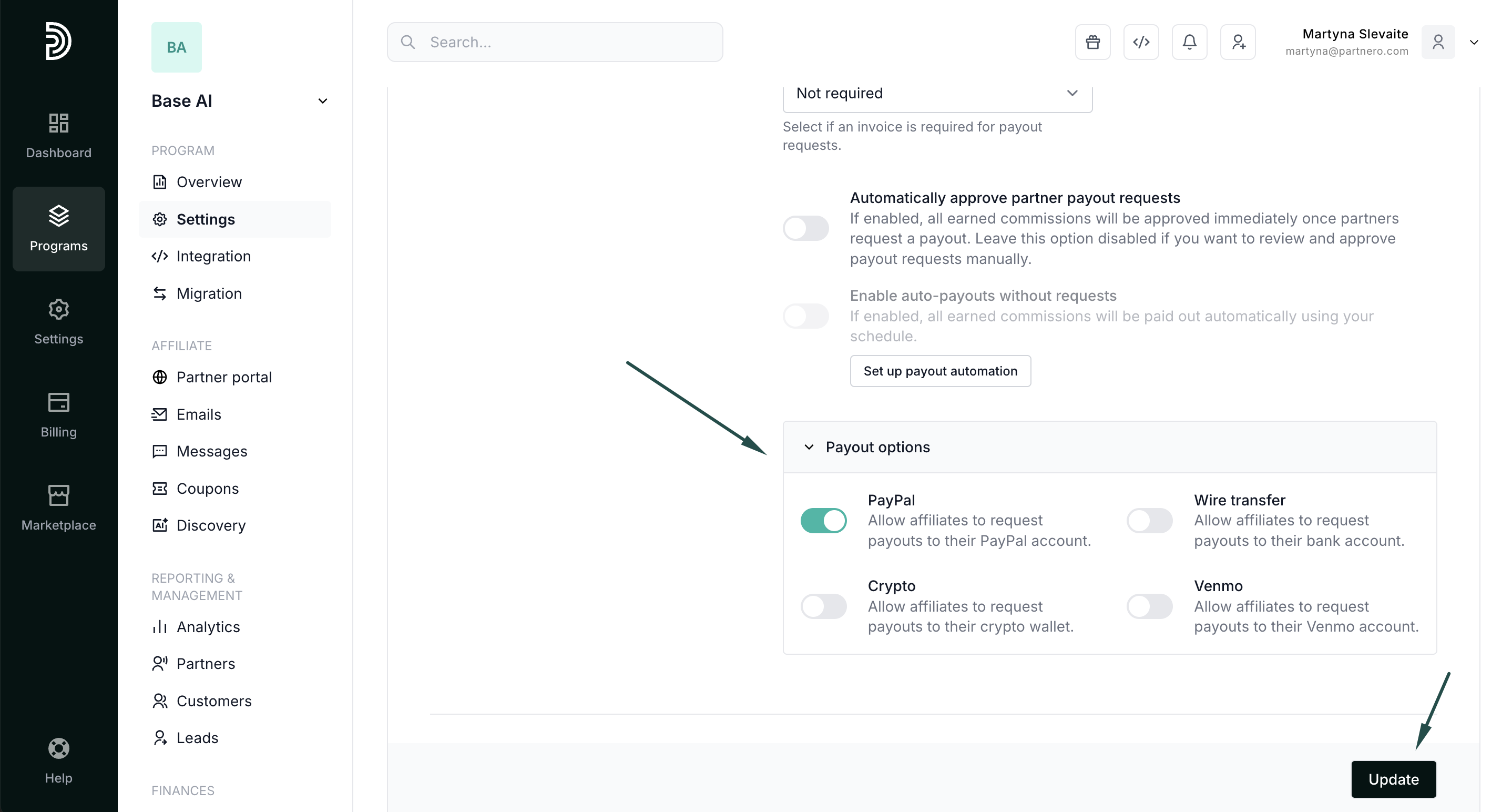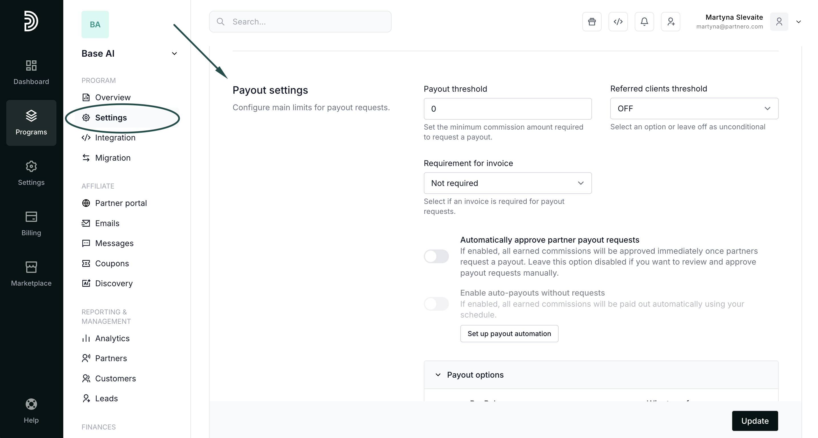 Payout settings let you configure how and when your affiliate partners can receive their earned commissions. This includes defining which payout methods partners can use, setting minimum thresholds before partners can request payouts, and additional conditions, such as referred client requirements or invoice rules.