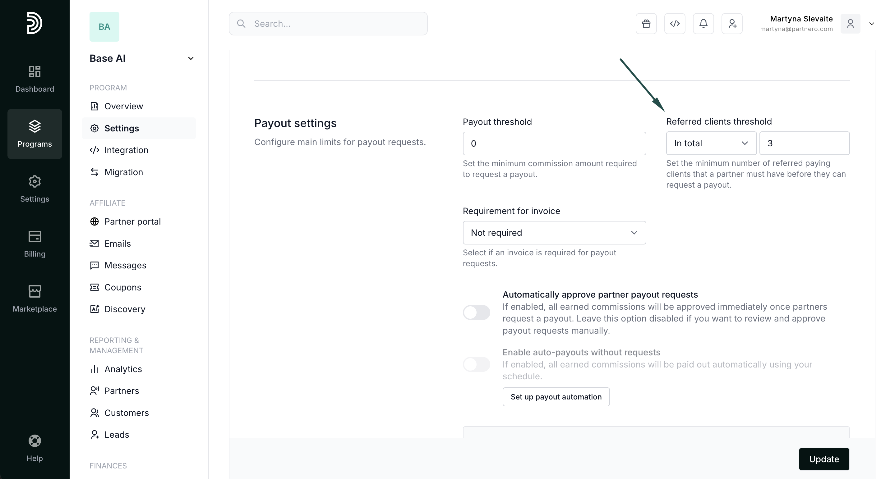 - Referred clients threshold: set the number of clients a partner must refer before they can request a payout. The number can be set as a total or per payout. For example, you can set a client to refer at least three clients before they can request a payout.
