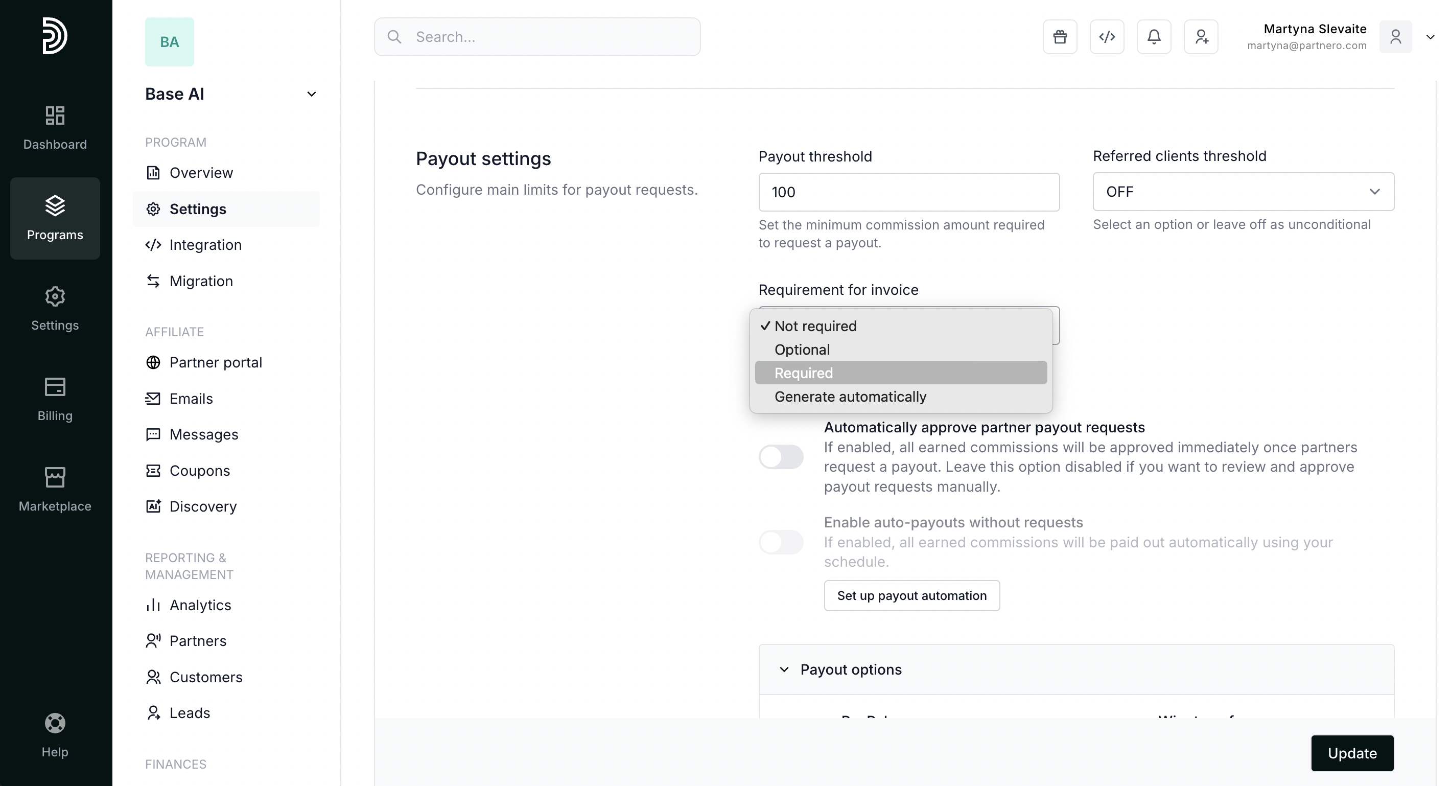- Requirement for invoice: ask your partners to upload an invoice when they submit a payout request or generate one automatically: