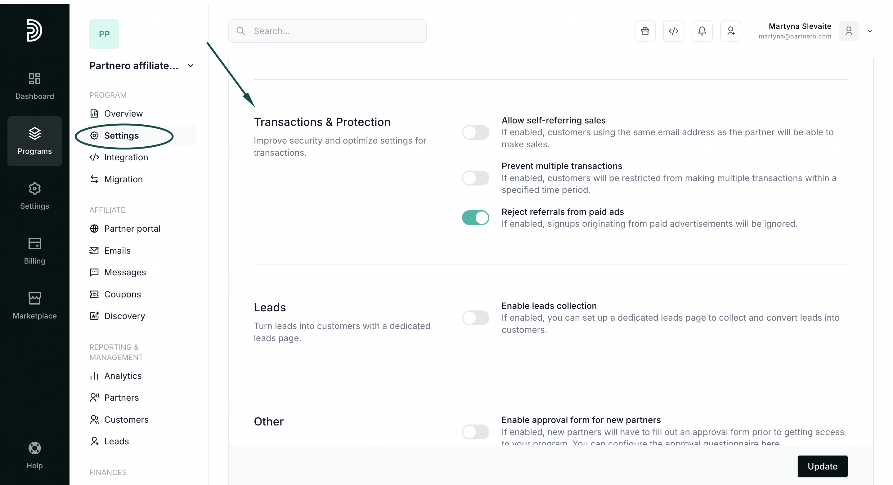 Partnero allows you to set rules for customer transactions (sales) to define what constitutes a fraudulent transaction. These settings are available for affiliate and refer-a-friend programs.