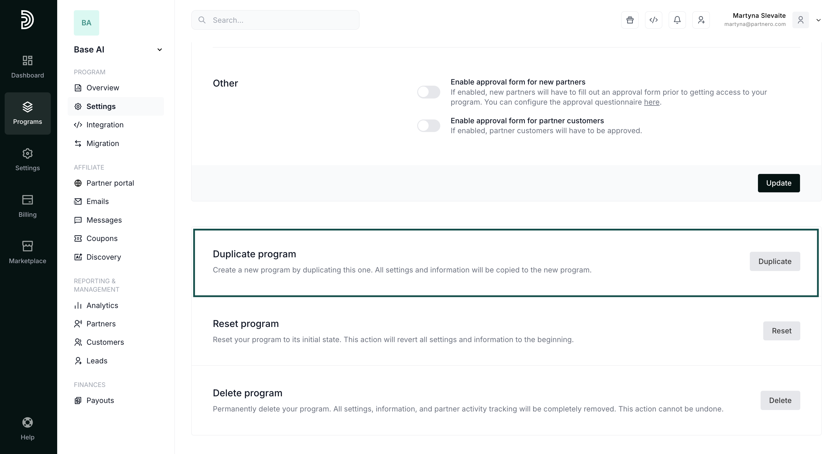 You can quickly create a copy of an existing program to use as a starting point for a new one. Duplicating a program saves time by carrying over settings, commission structures, content, and configurations so you don’t have to rebuild everything from scratch. This is useful when launching similar programs, testing variations, or creating seasonal campaigns.