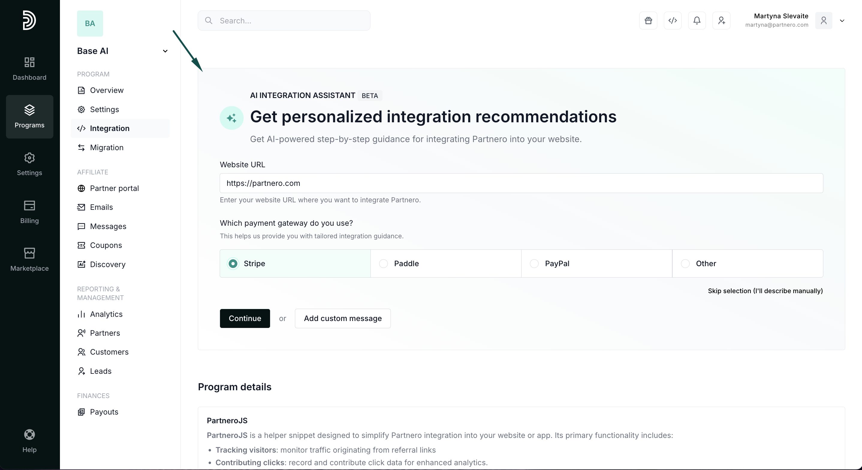 The integration assistant is an AI-powered tool that guides you through connecting Partnero to your website and other systems. Rather than just listing documentation, it analyses your setup and provides tailored steps, configuration instructions, and code examples to help you complete your integration more quickly and accurately.