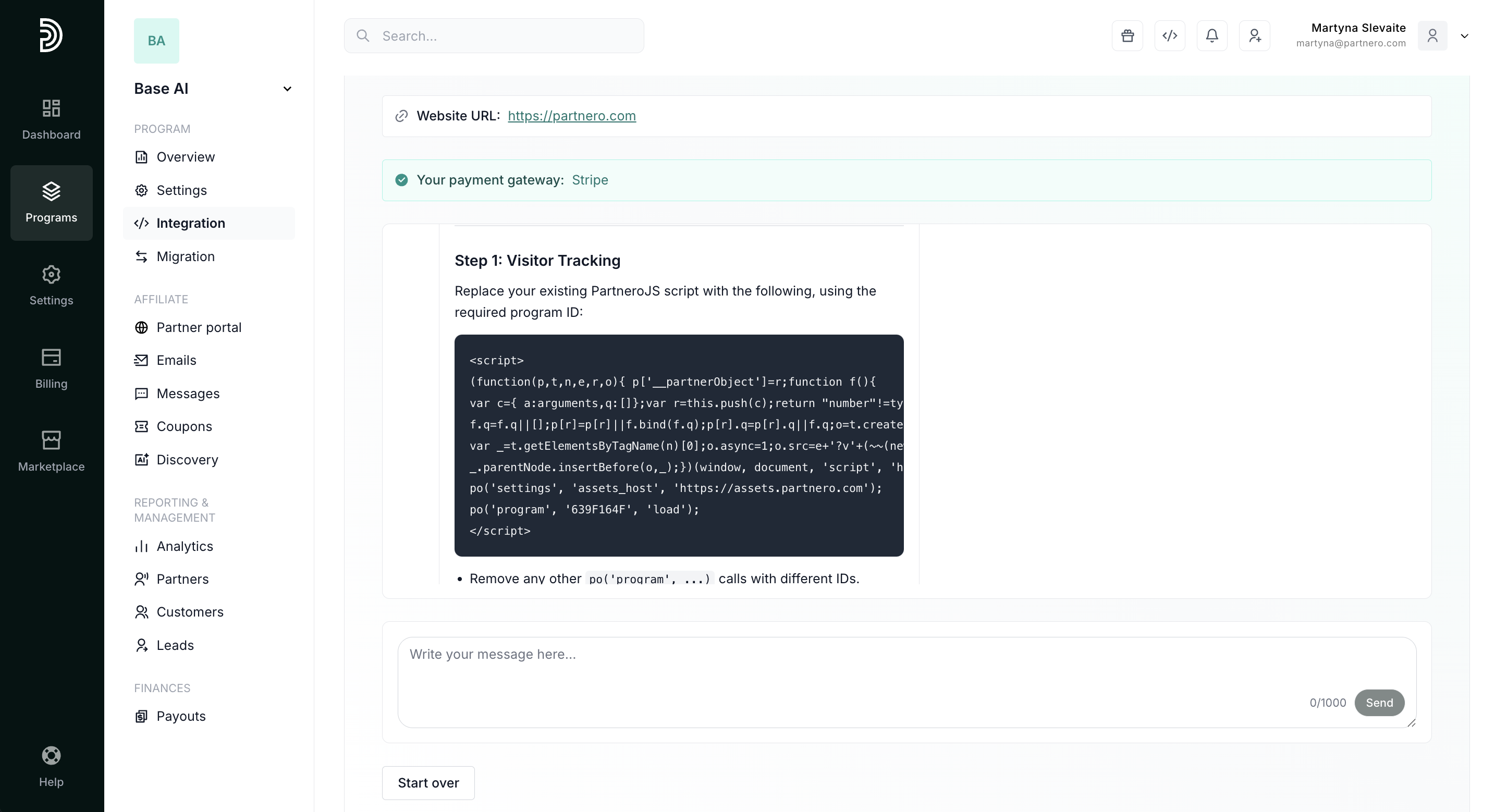 - The assistant will provide you with step-by-step instructions on how to best integrate Partnero into your website: