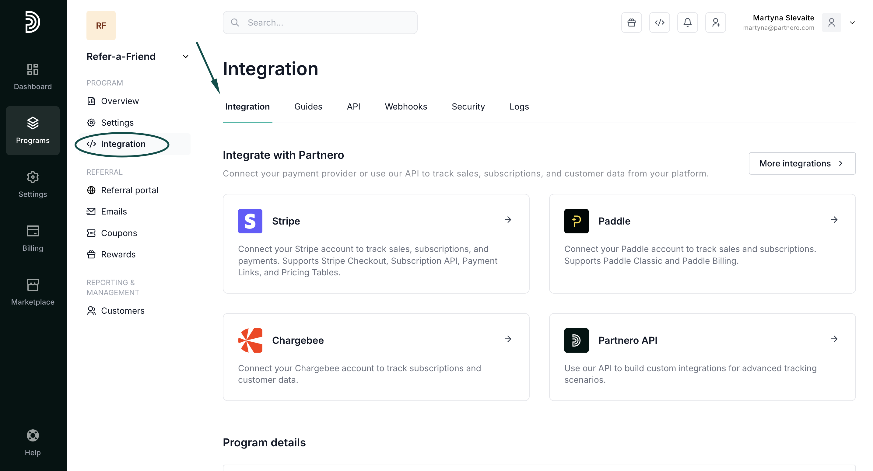 - Scroll down to the Program details section and copy the PartneroJS snippet: