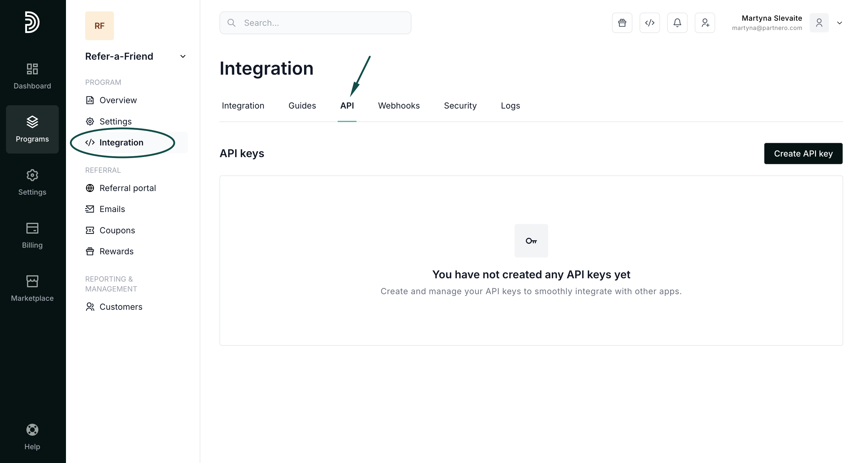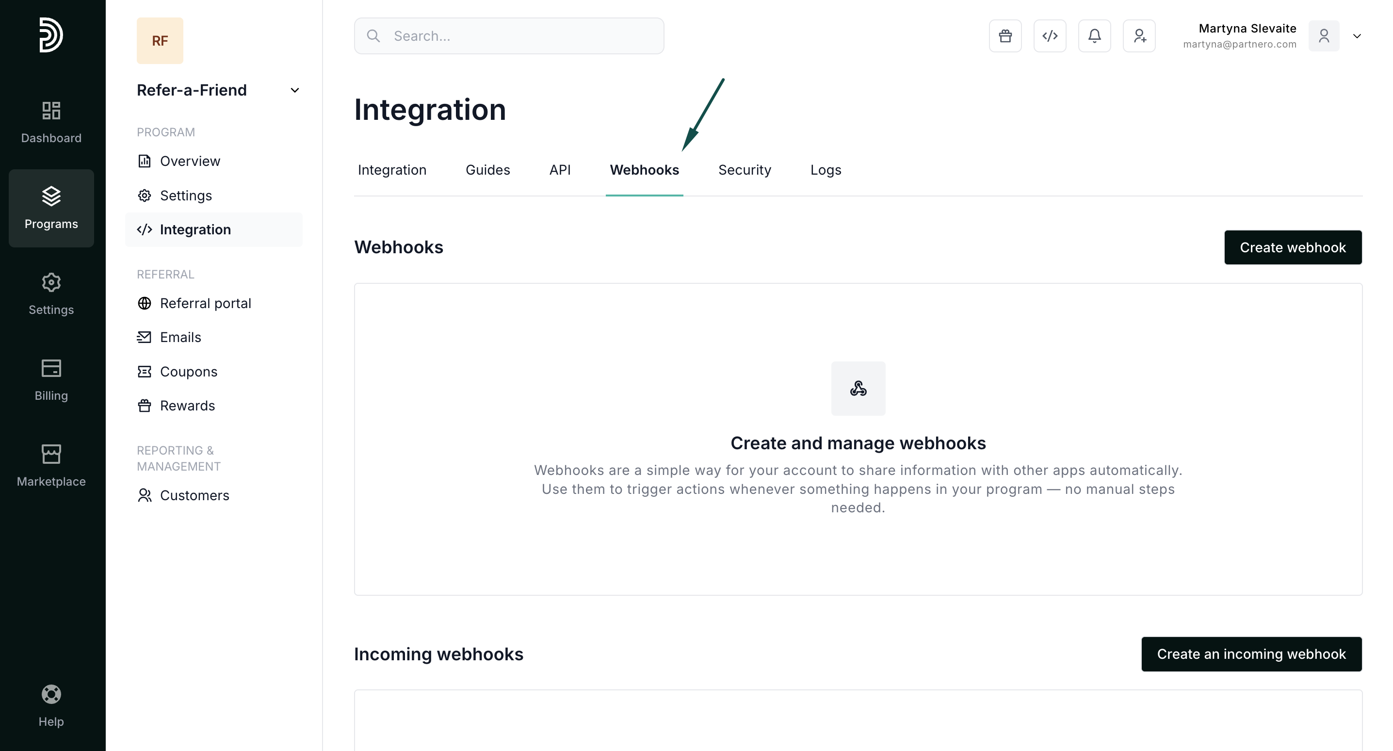 - Go to Integration under Program. Switch to the Webhooks tab.
