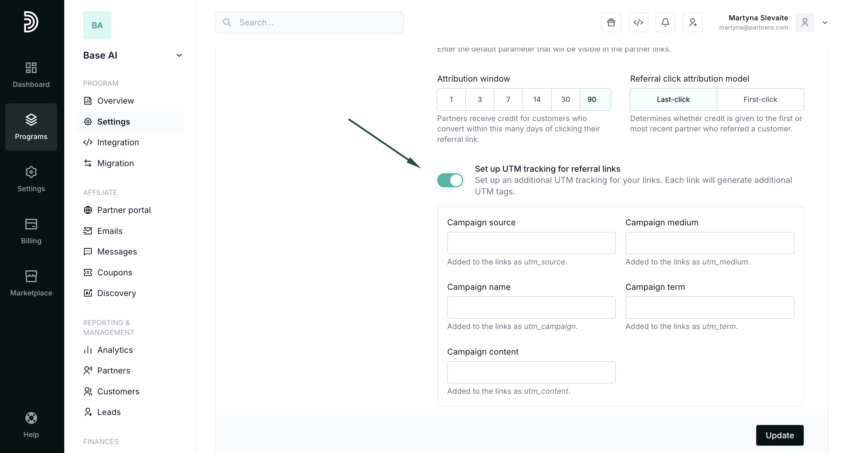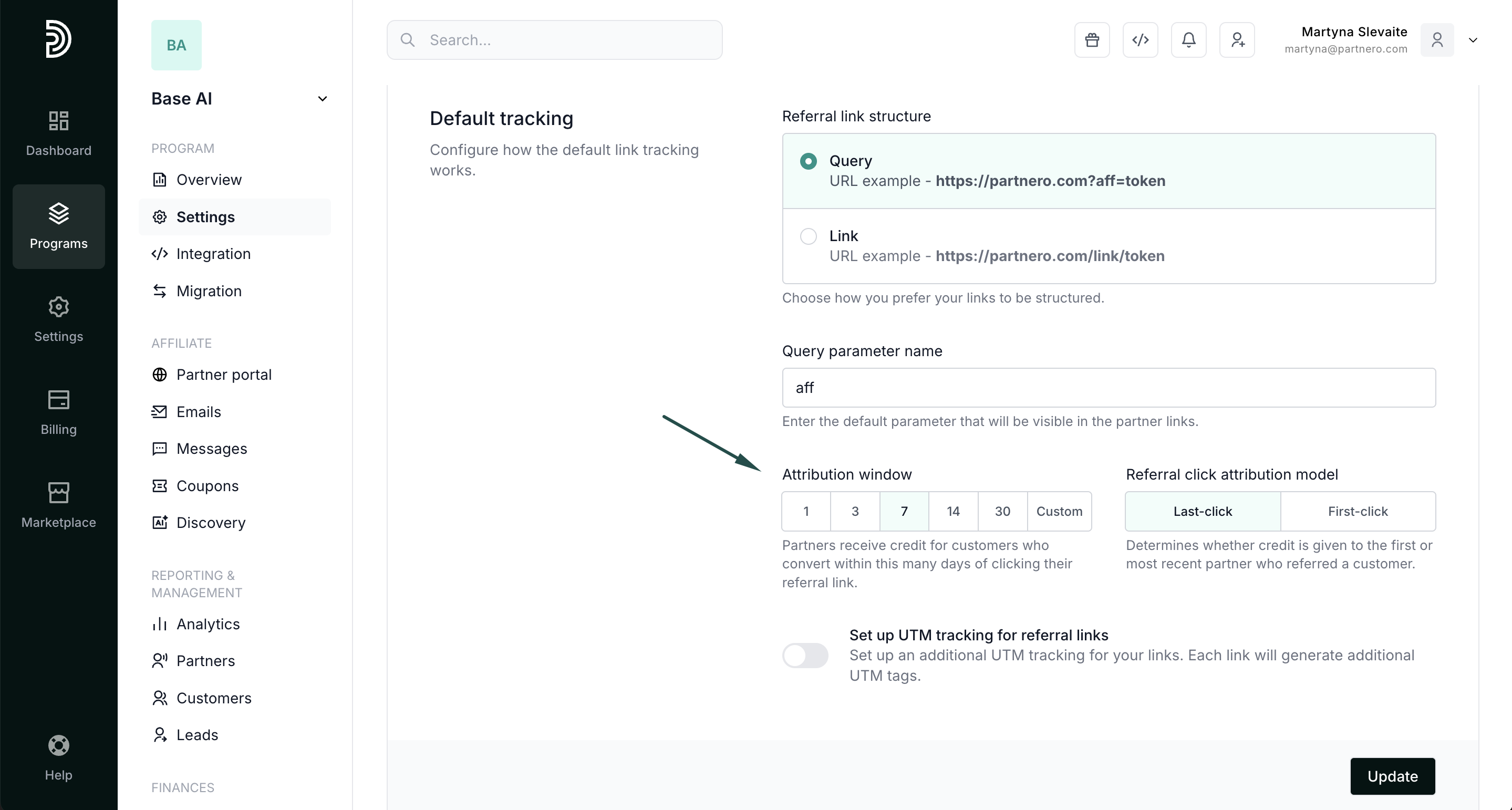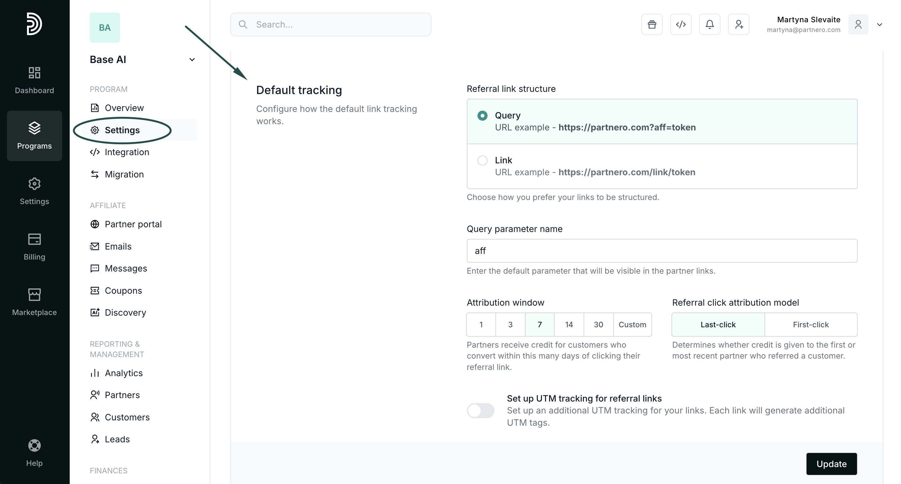 With Partnero, you can customize your program's link structure and query parameters. To do that: