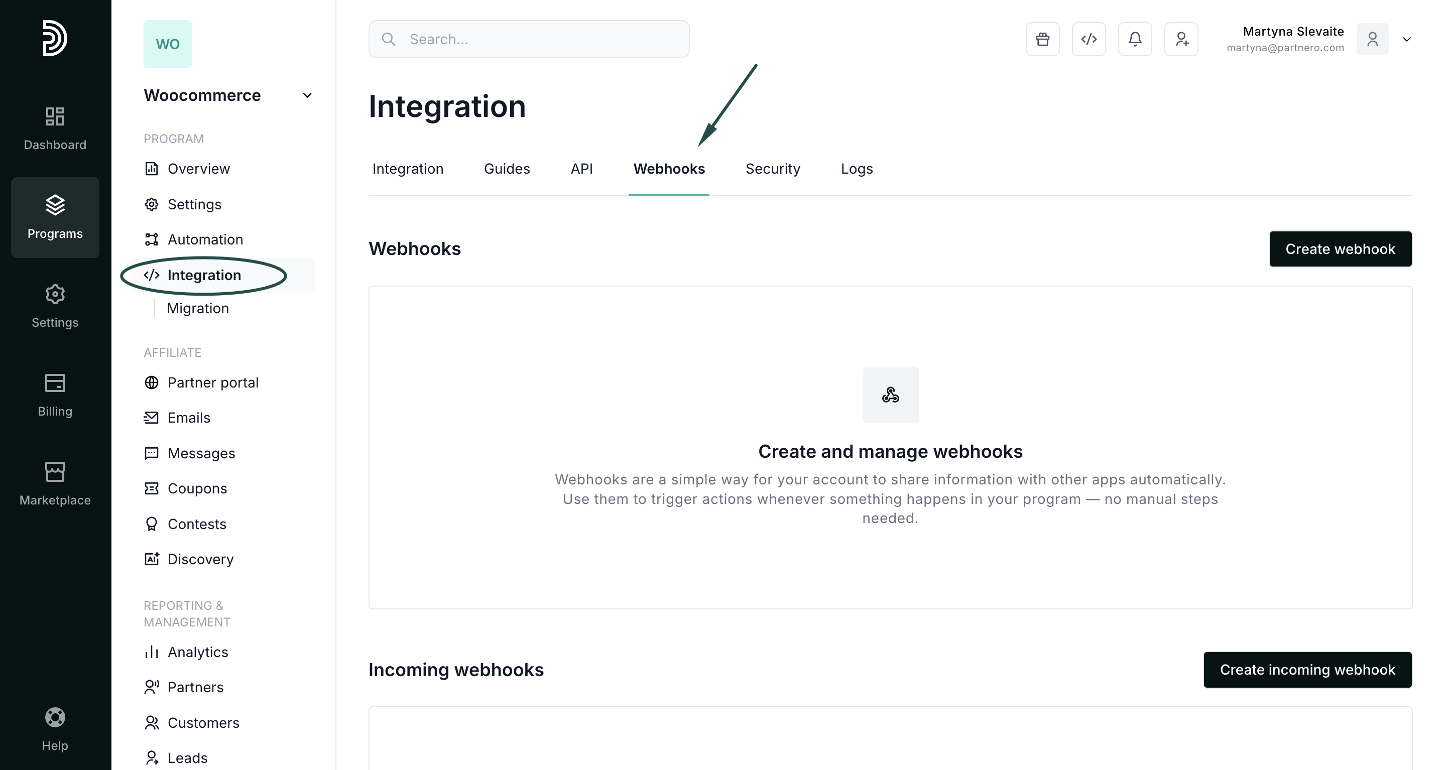 - In your program, go to Integration → Webhooks tab: