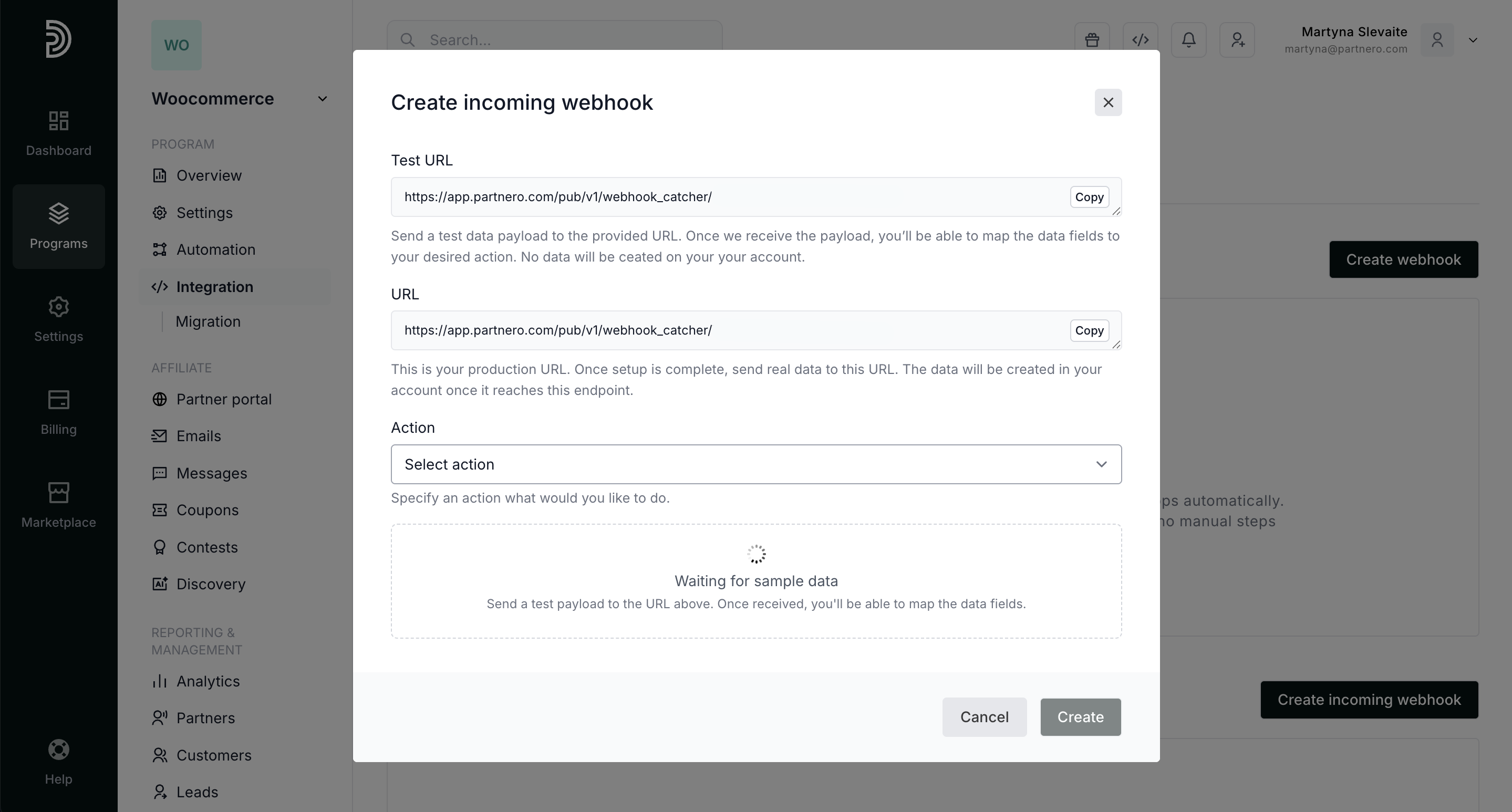 - Production URL: This is your production URL. Once setup is complete, send real data to this URL. Any data sent to this endpoint will be processed and created within your Partnero account.