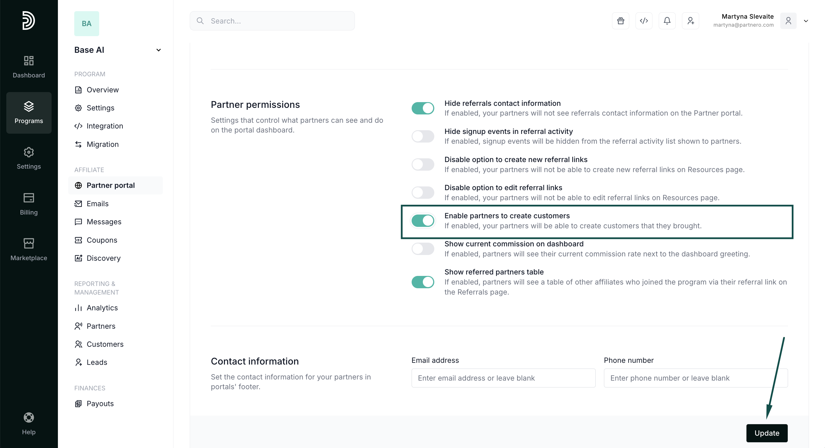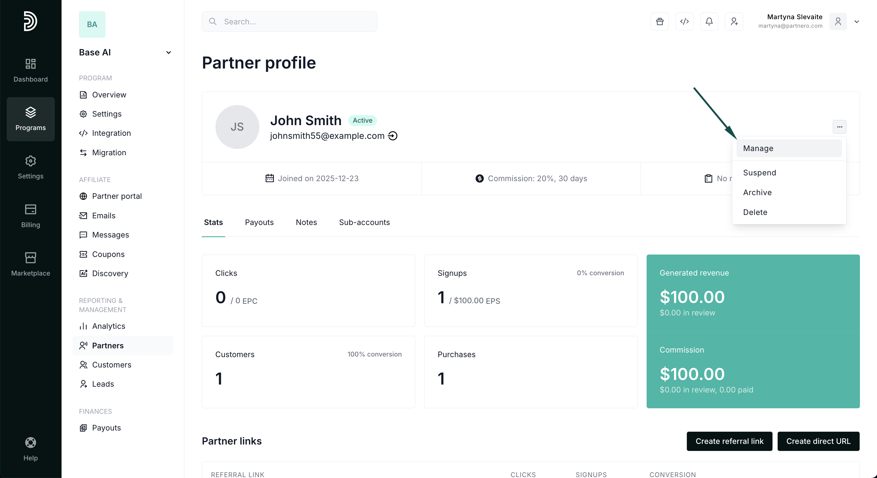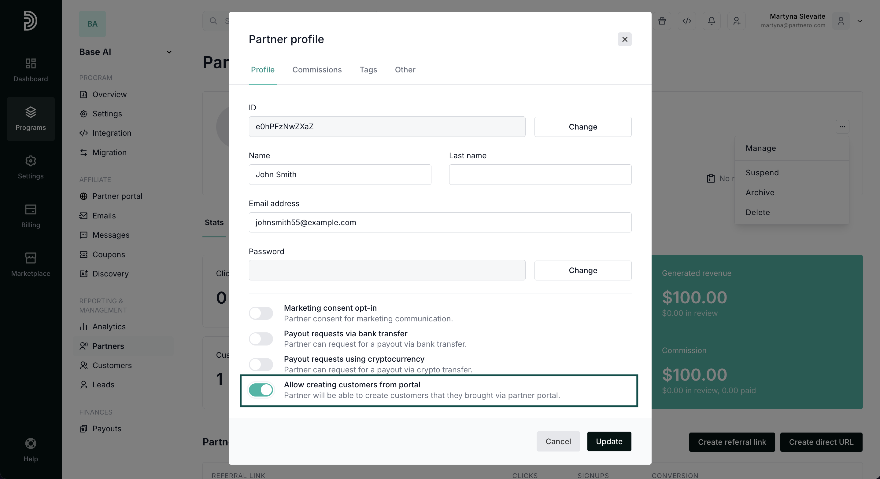 This setting can be enabled for each partner individually or on a program level. We recommend enabling it only for trusted, close-relationship partners.