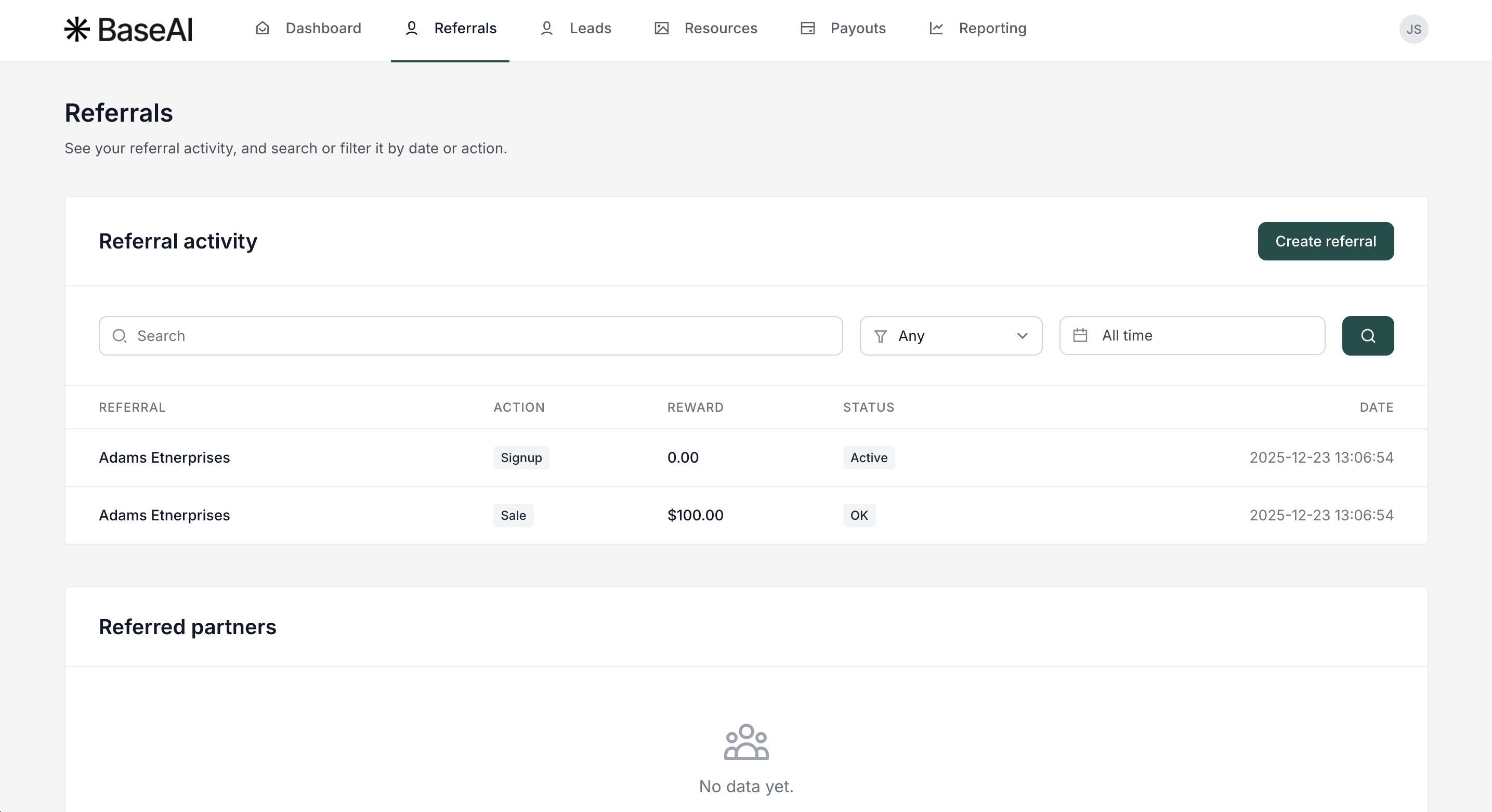 Once the setting is enabled, your partner will have the option to Create referral in the partner portal, the Referrals tab: