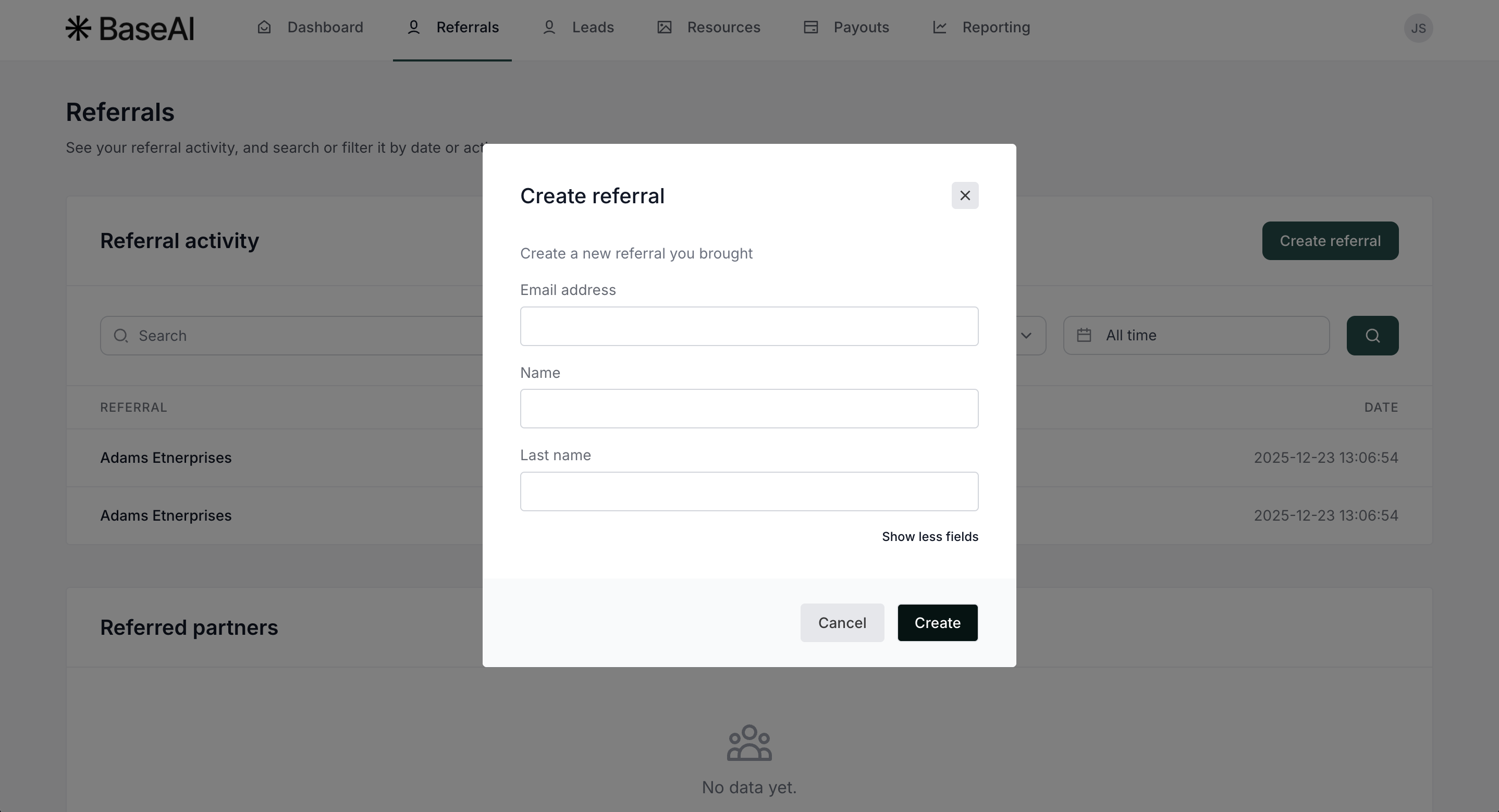 When the partner clicks on the Create referral option, they will be able to provide the new customer's name, last name, and email:
