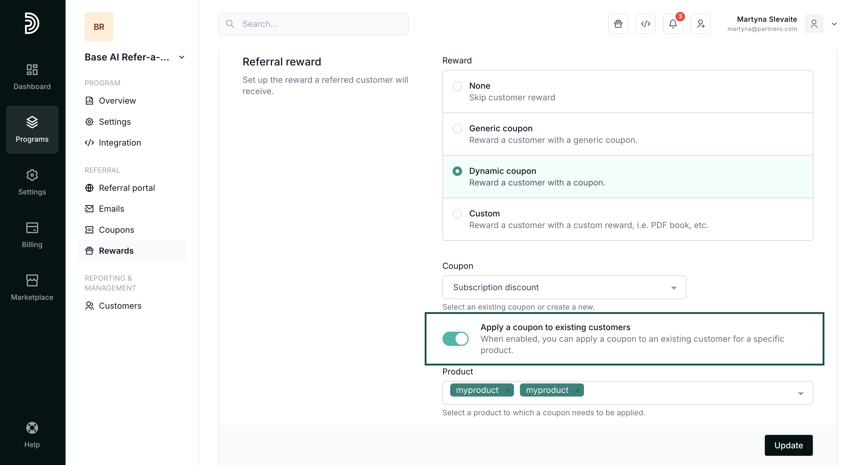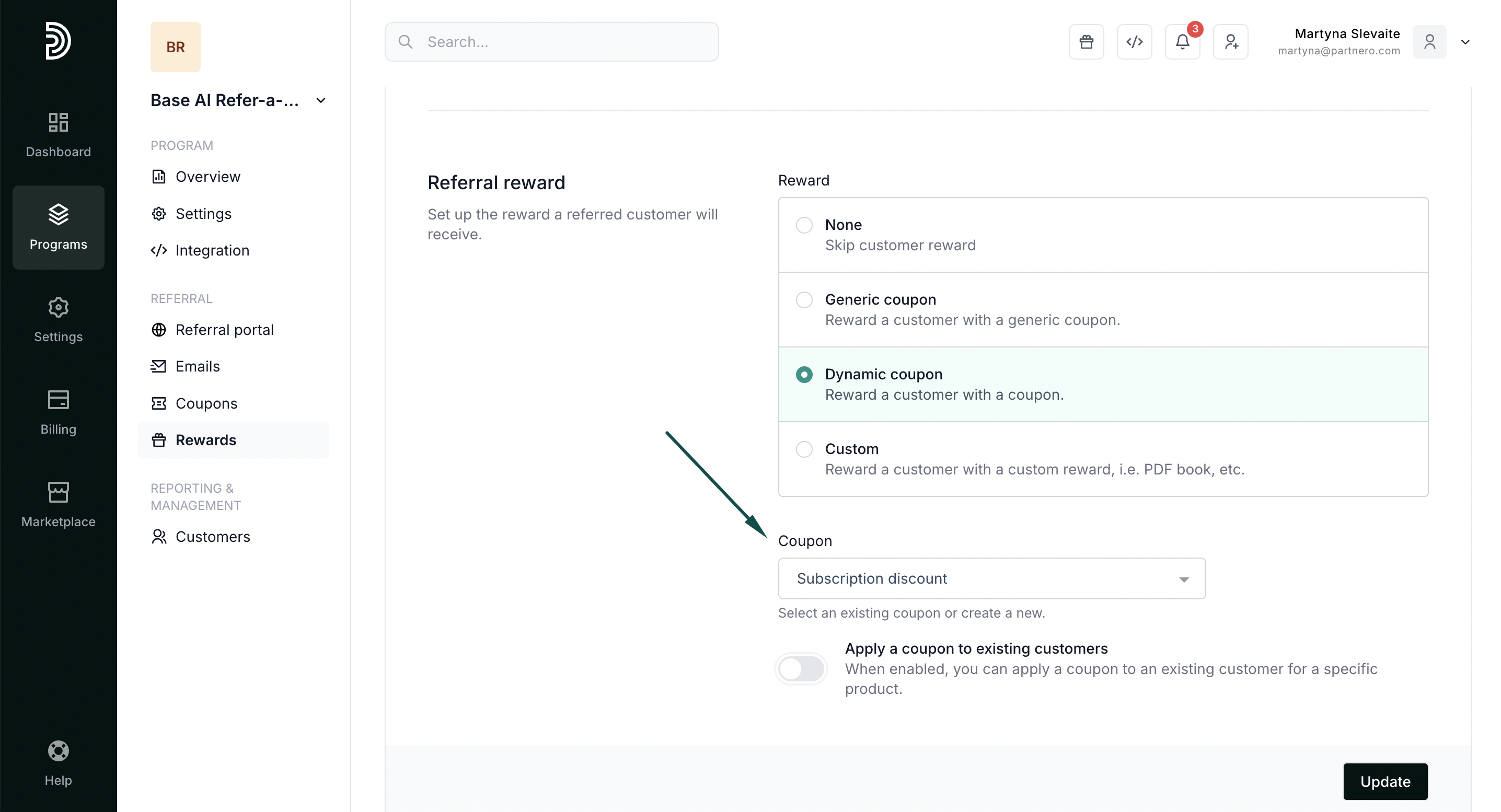 With Refer-a-Friend programs, you can offer dynamic coupons and promotion codes as rewards to your customers. If you're using Stripe as your payment gateway, earned Stripe coupons can be automatically applied to customers' existing subscriptions.