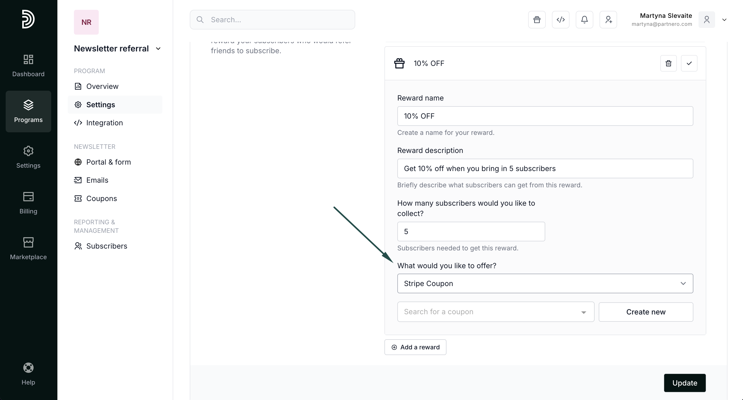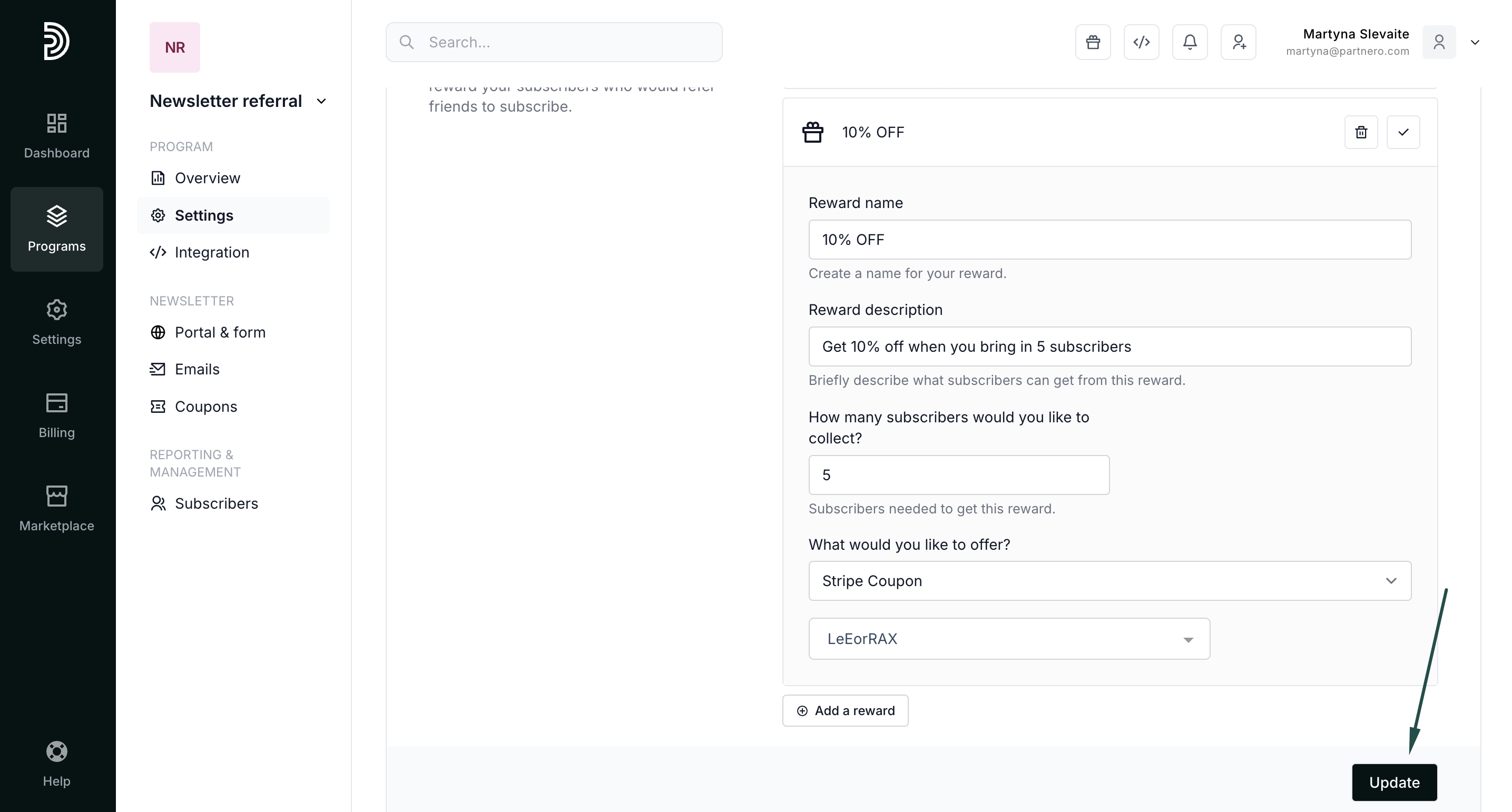 The coupon will be created on Partnero and automatically synced with Stripe. - Click Update to save your reward.