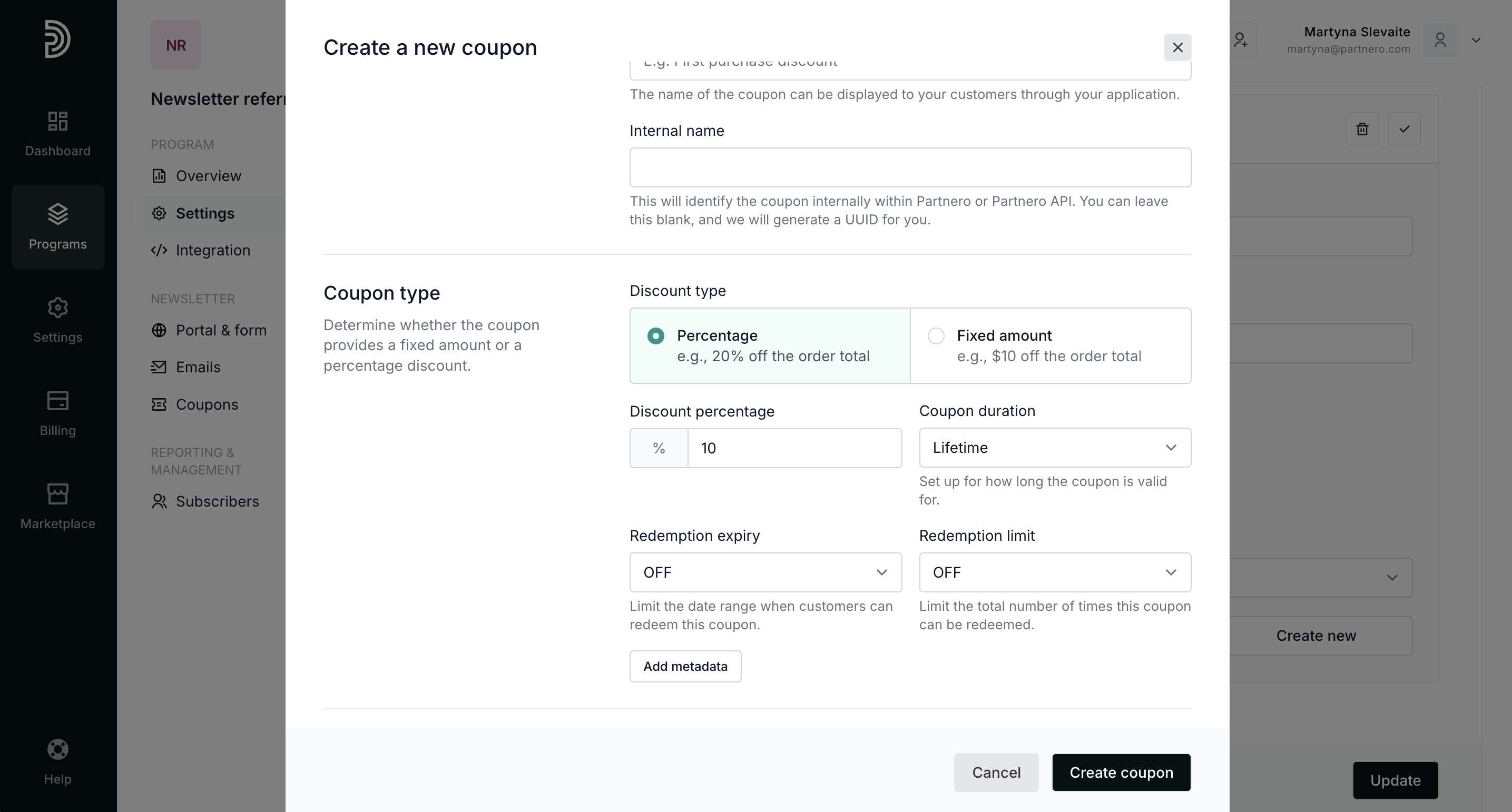 Add the coupon name and configure the discount. In our example, we'll offer a 10% discount.