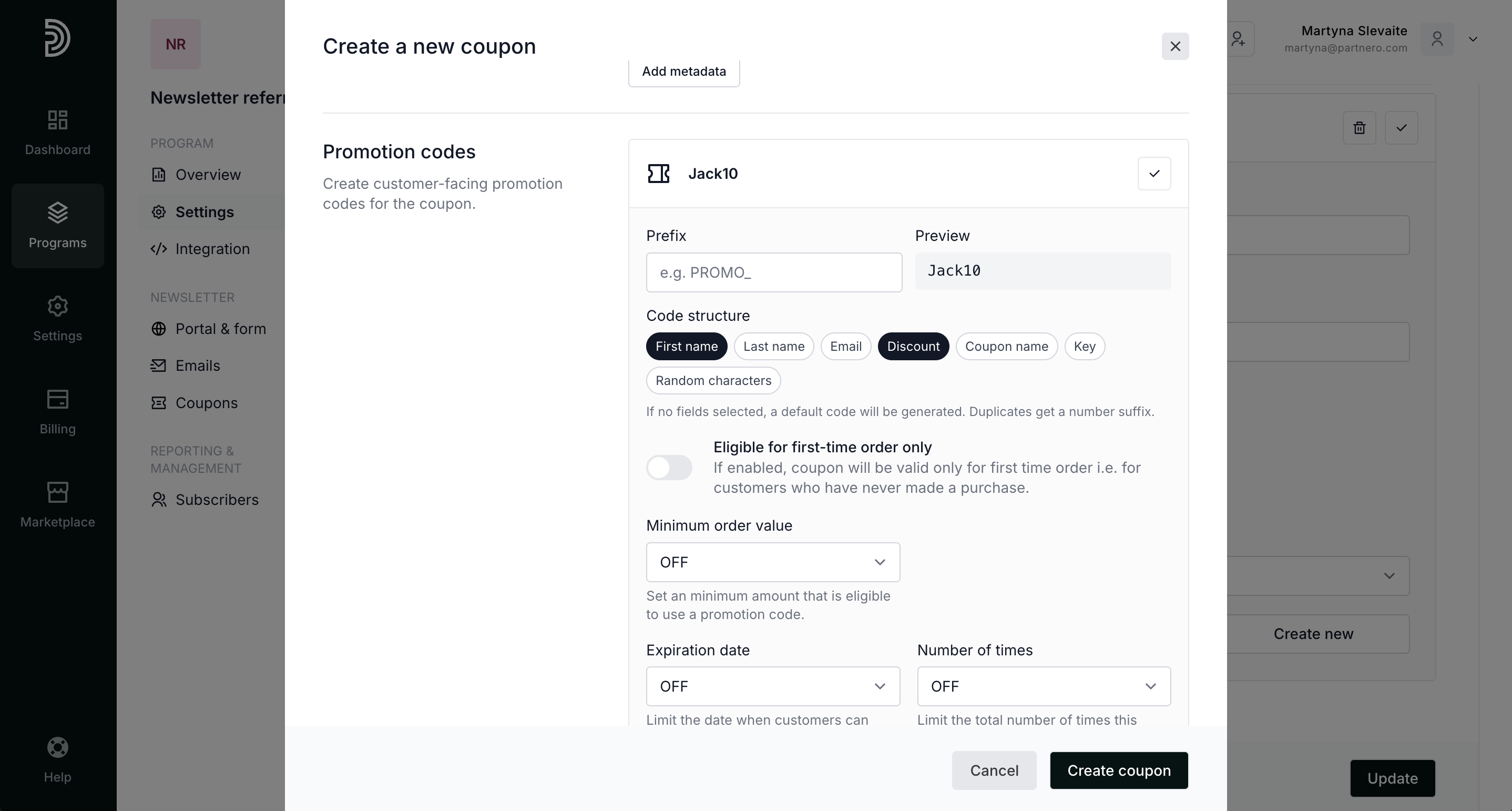 Under Promotion codes, you can customize the unique codes that will be sent to your subscribers. For example, the code can include the subscriber's name and the discount amount: