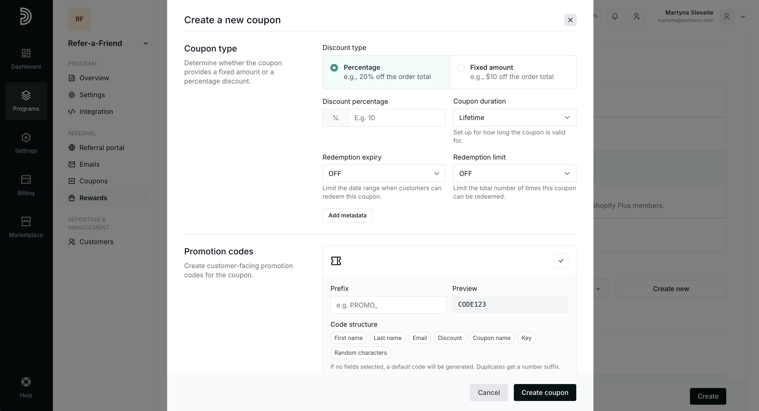 Once the coupon is created, it will also be available under Referral > Coupons: