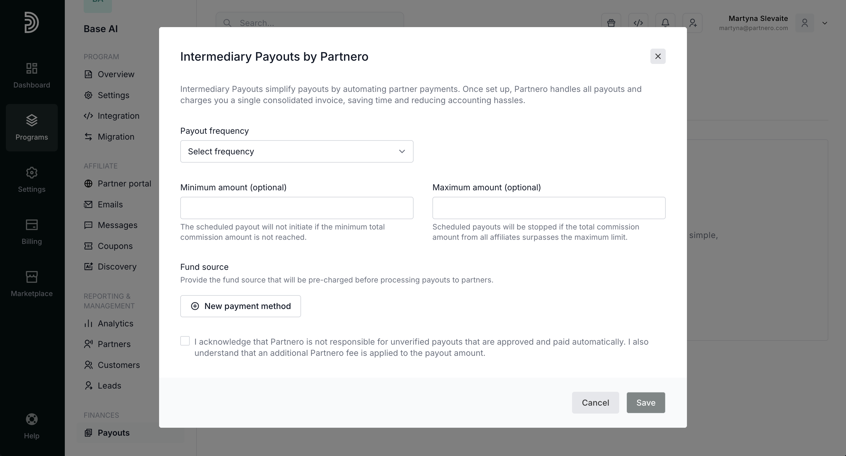 - Fund source: add a fund source Partnero will pre-charge before processing payouts. - Click Save.