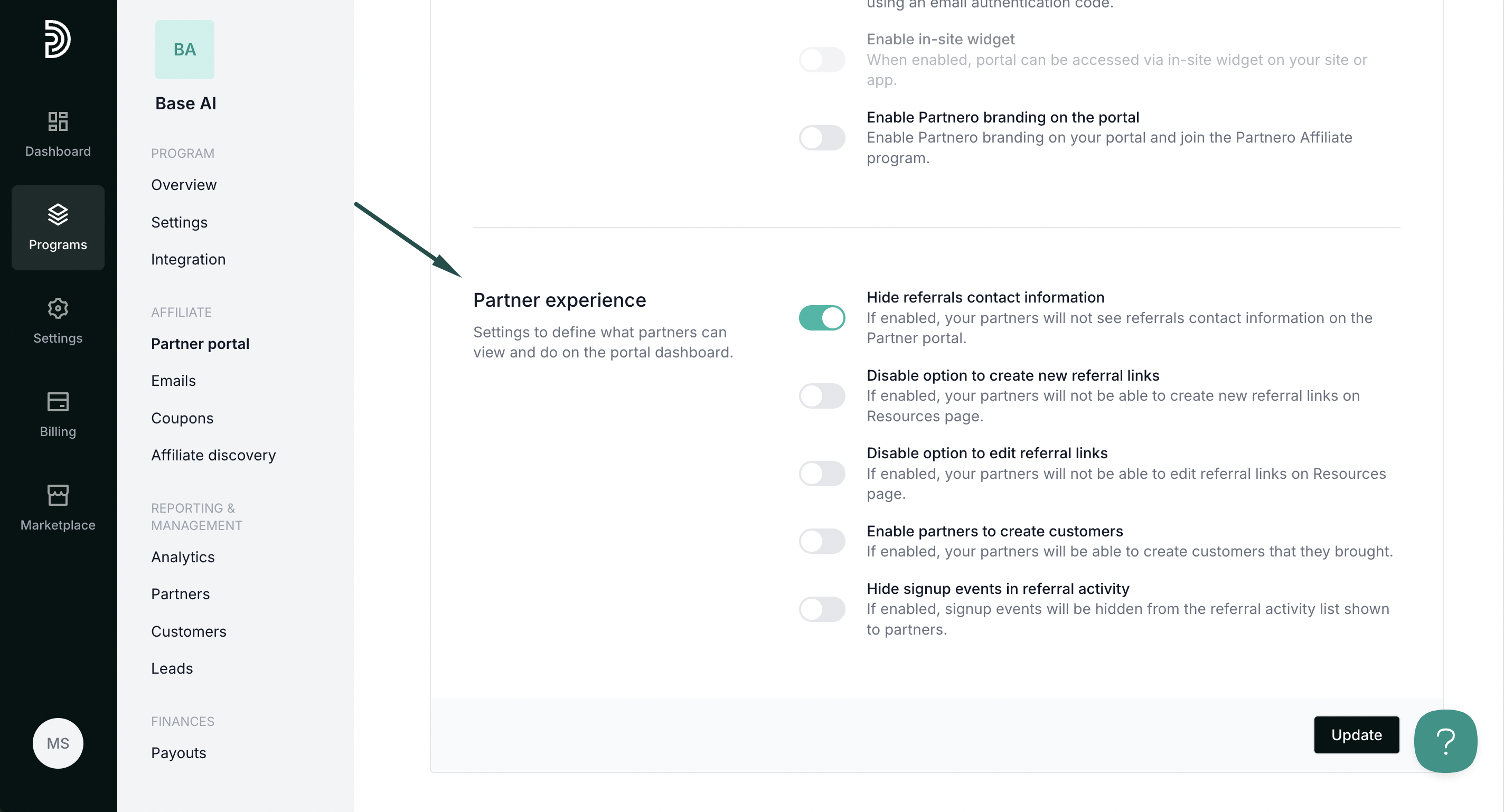- Hide referral contact information: partners will not see referral contact information on their portal if enabled.