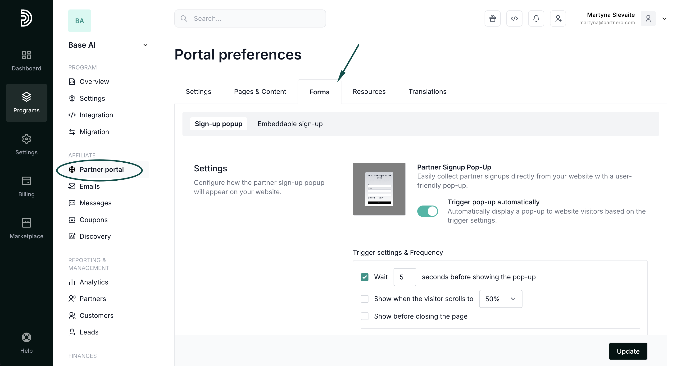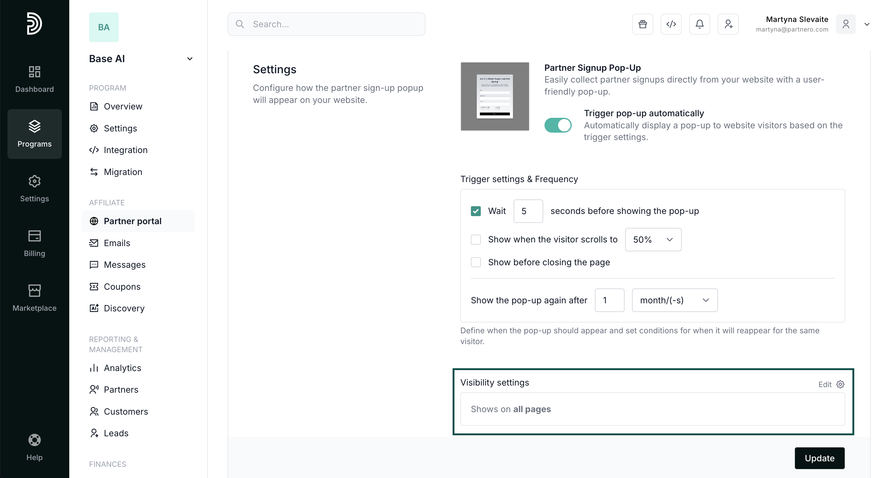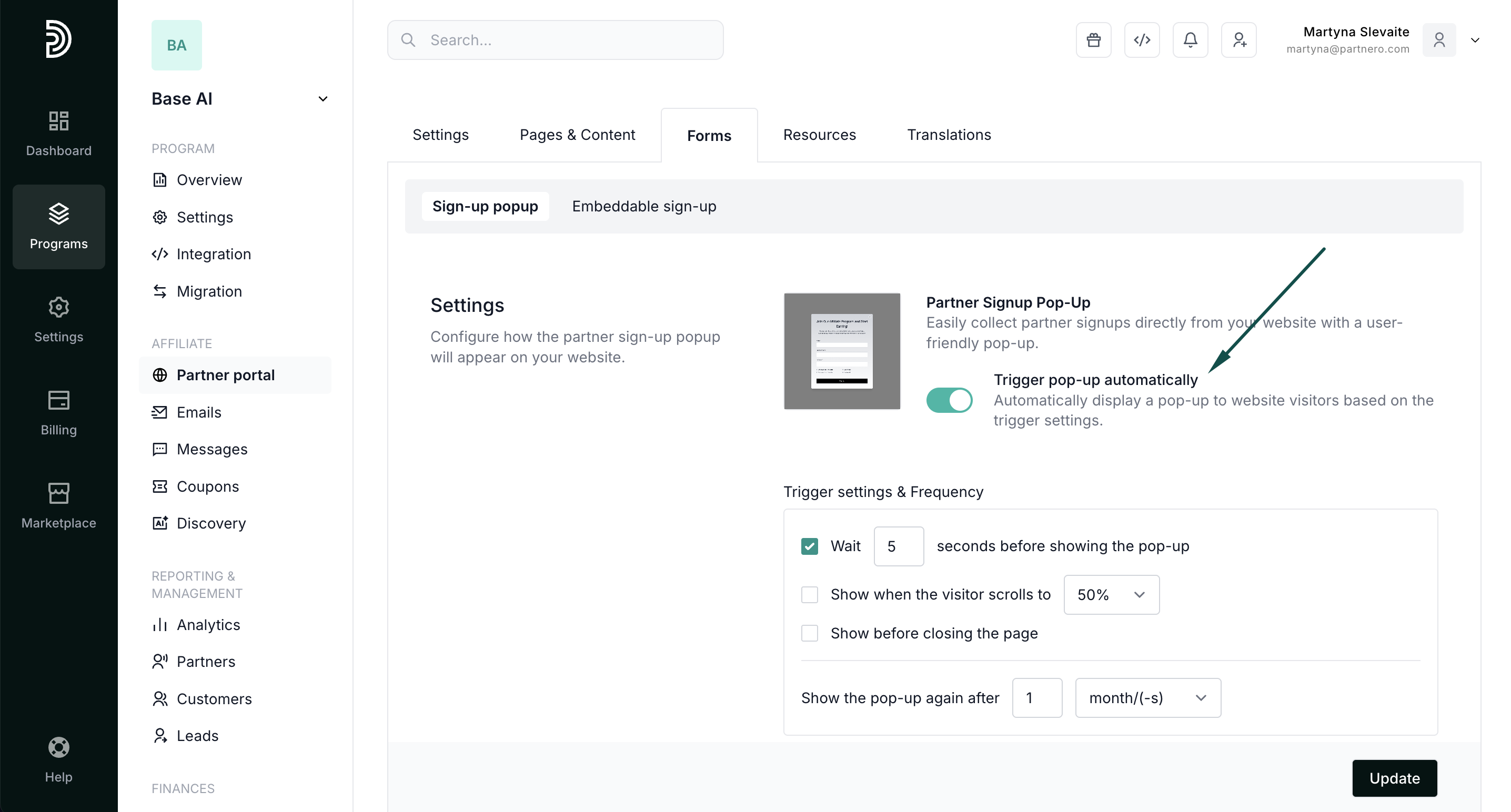 Partnero’s customizable registration pop-ups let you add a dynamic sign-up form to your website to collect new affiliate partners. You have complete control over its timing, placement, and design.