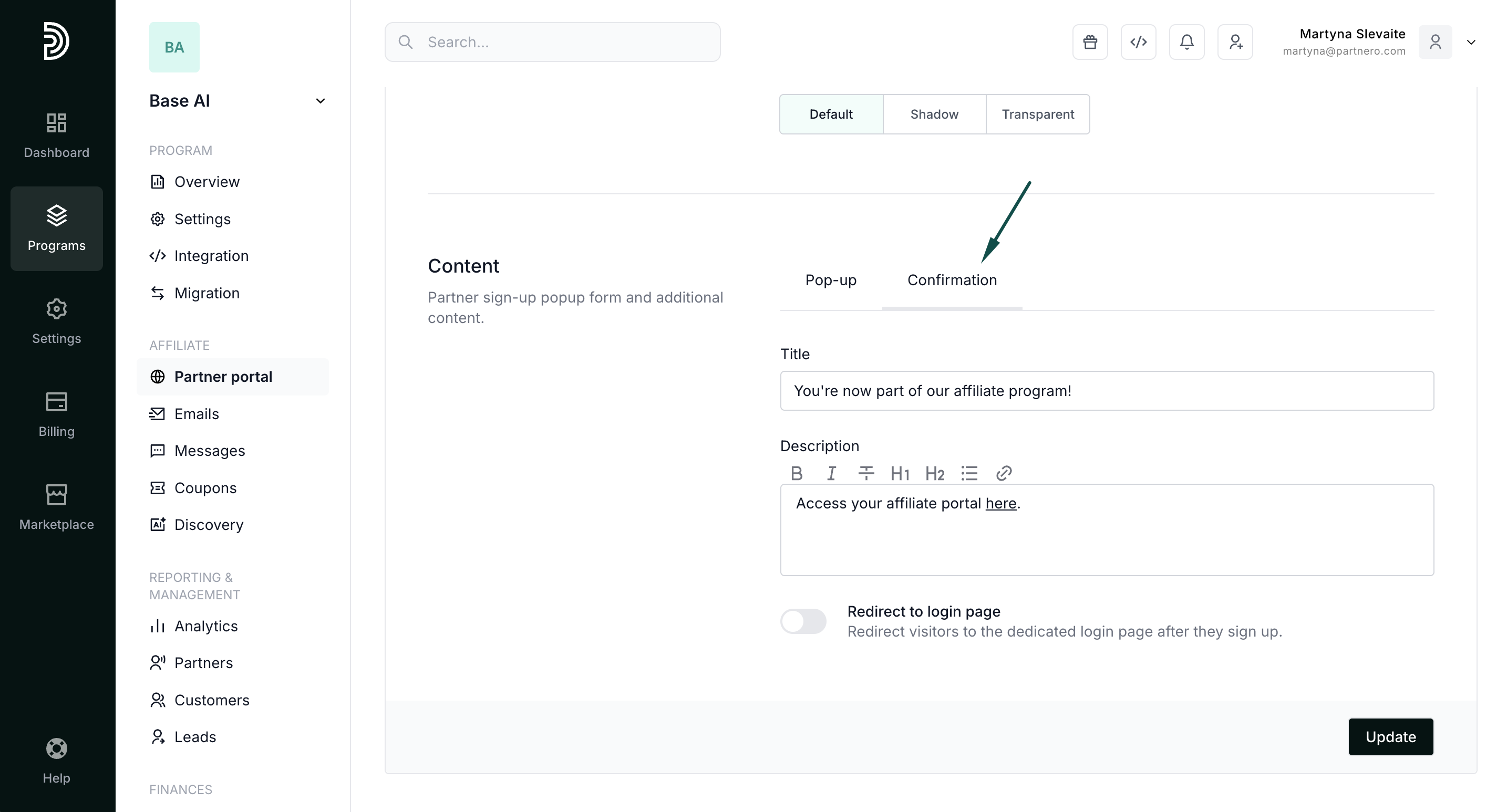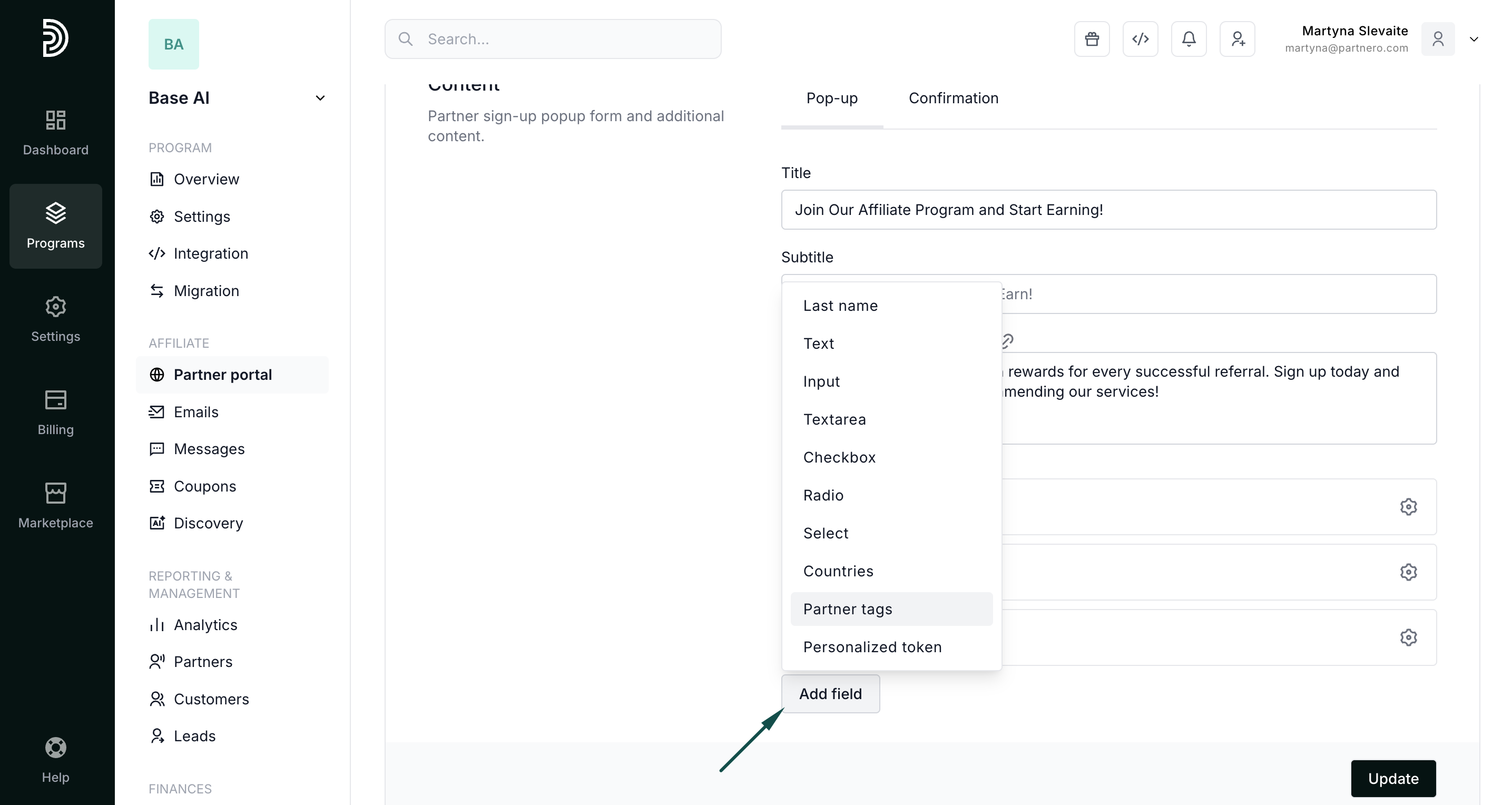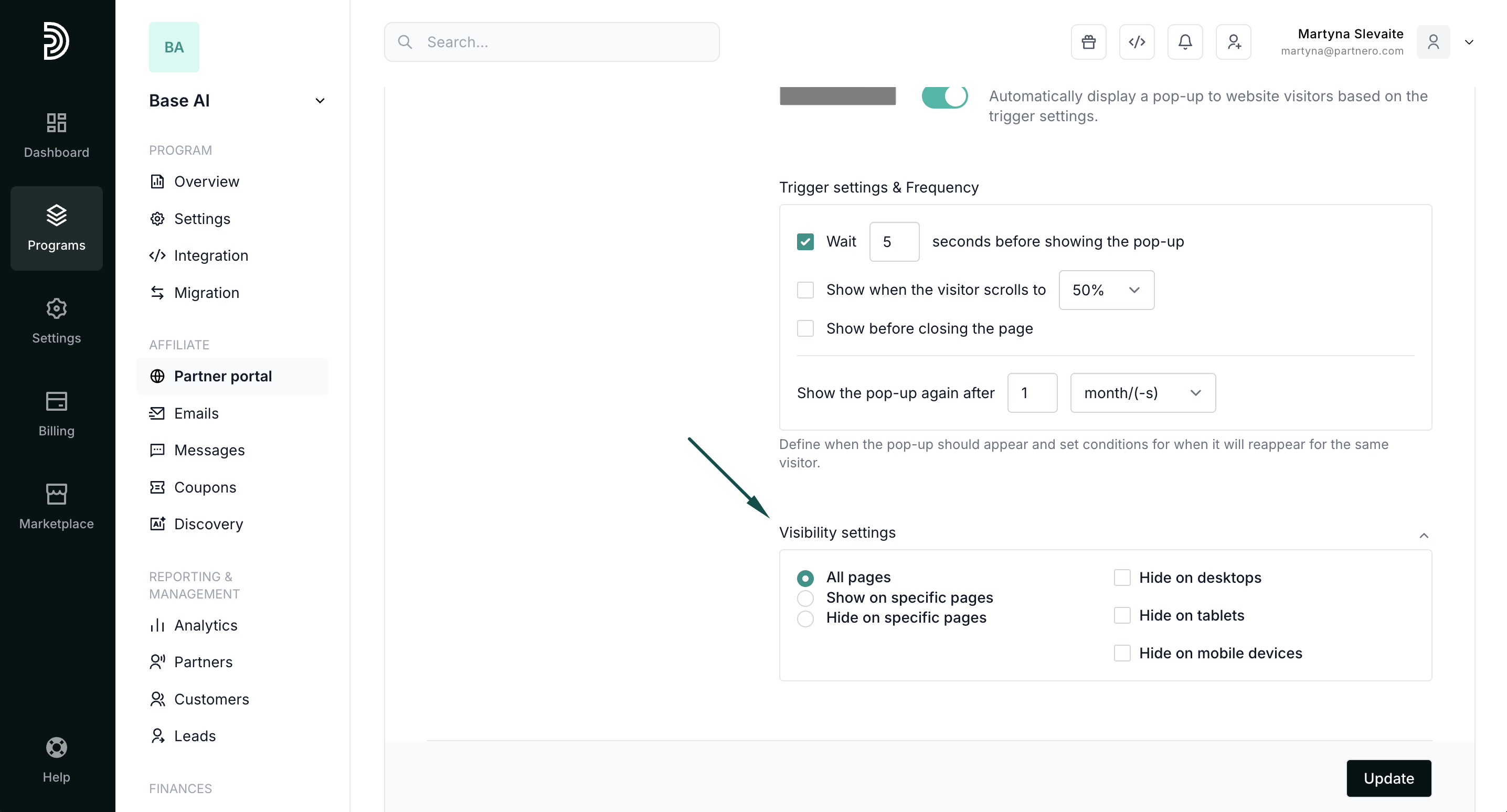 Partnero’s customizable registration pop-ups let you add a dynamic sign-up form to your website to collect new affiliate partners. You have complete control over its timing, placement, and design.