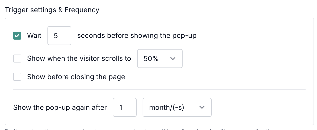 You will then be presented with a settings modal where you can select when and how the pop-up will appear. You have the following options: