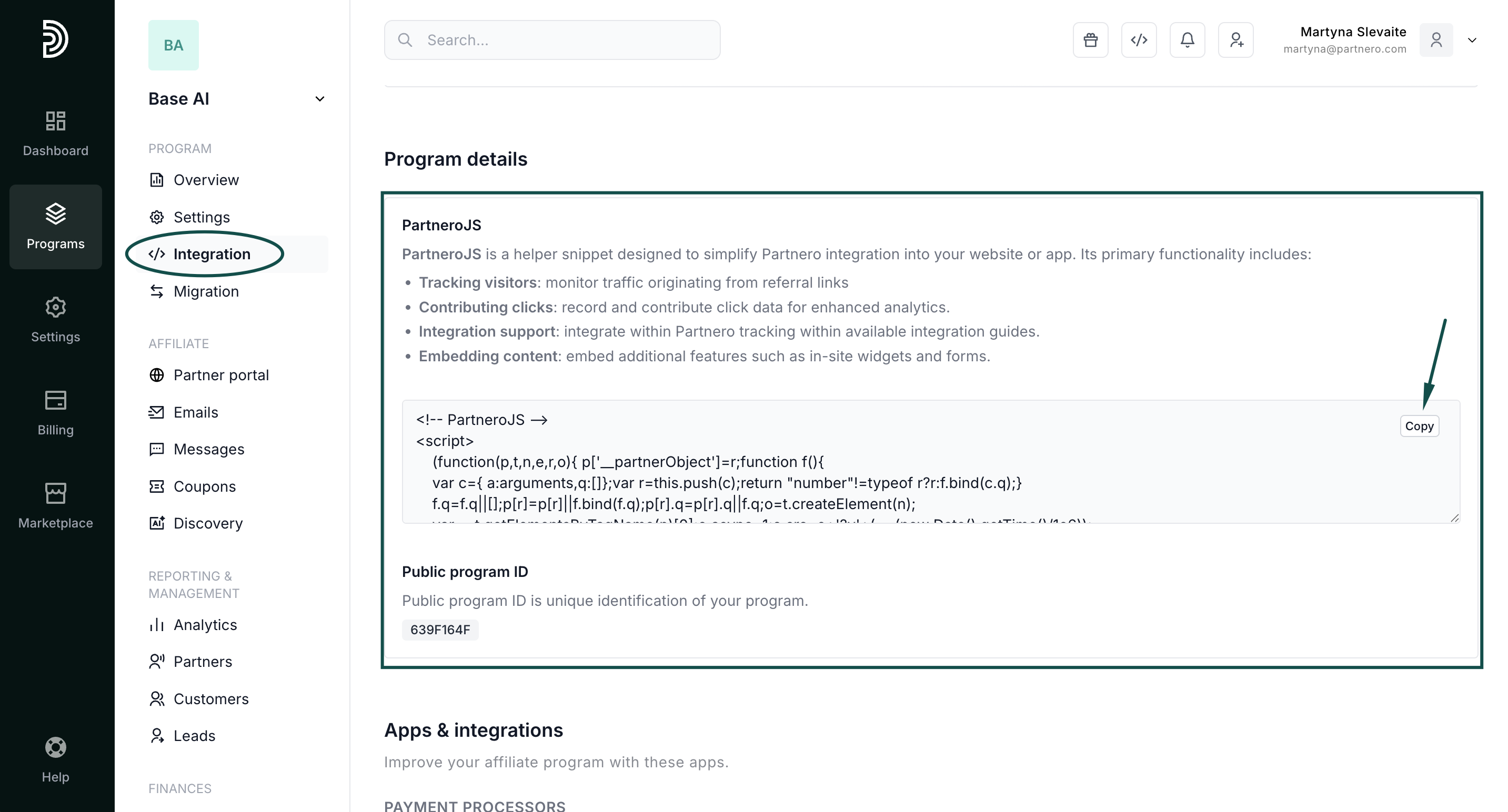 - Scroll down to Program details to locate the PartneroJS snippet: