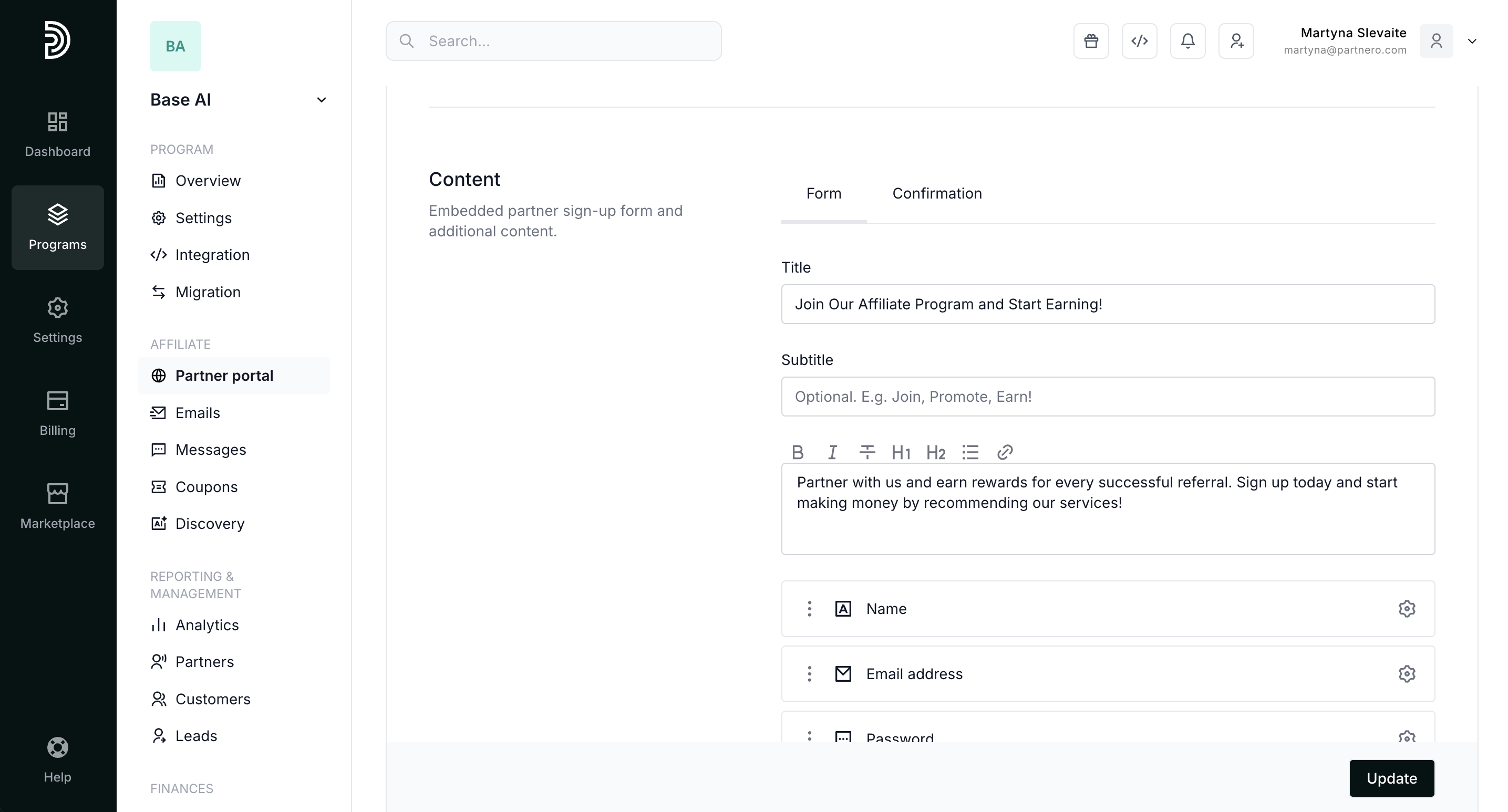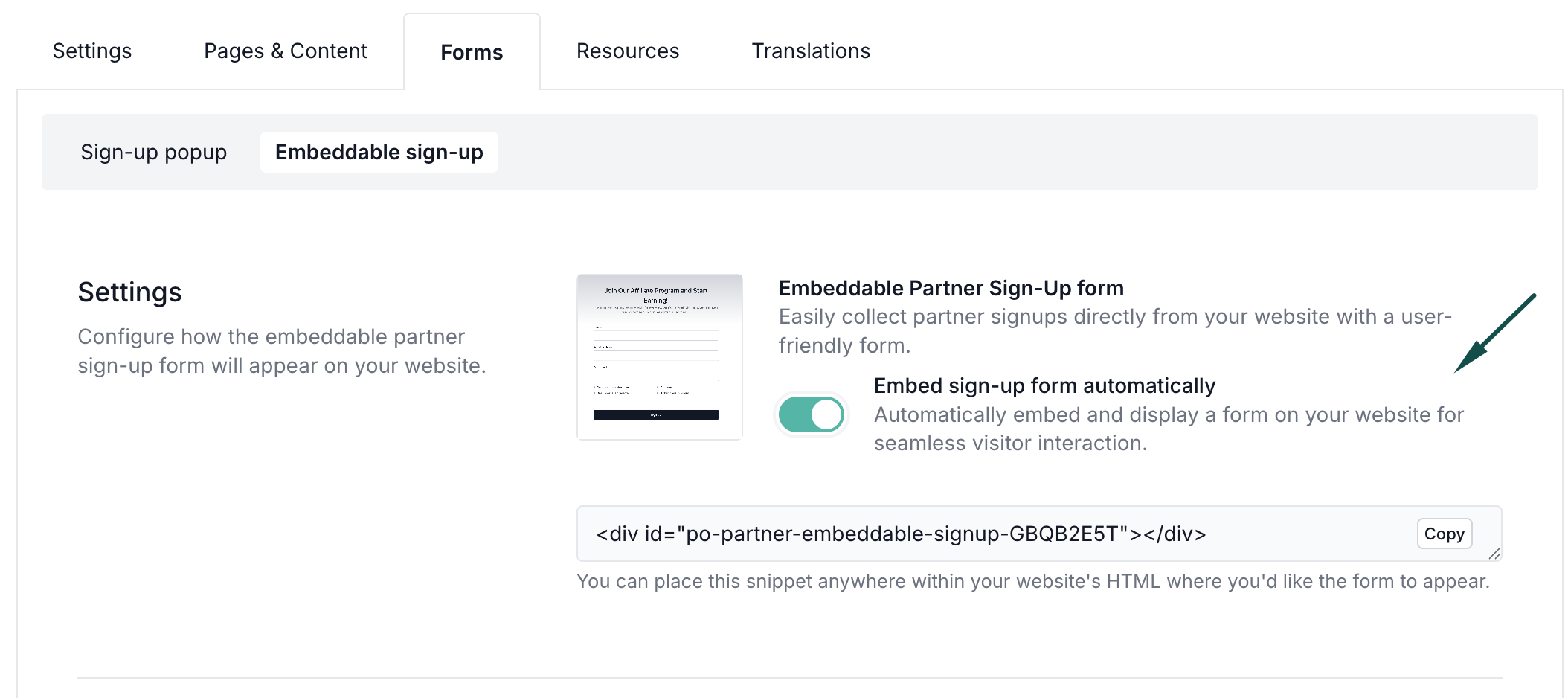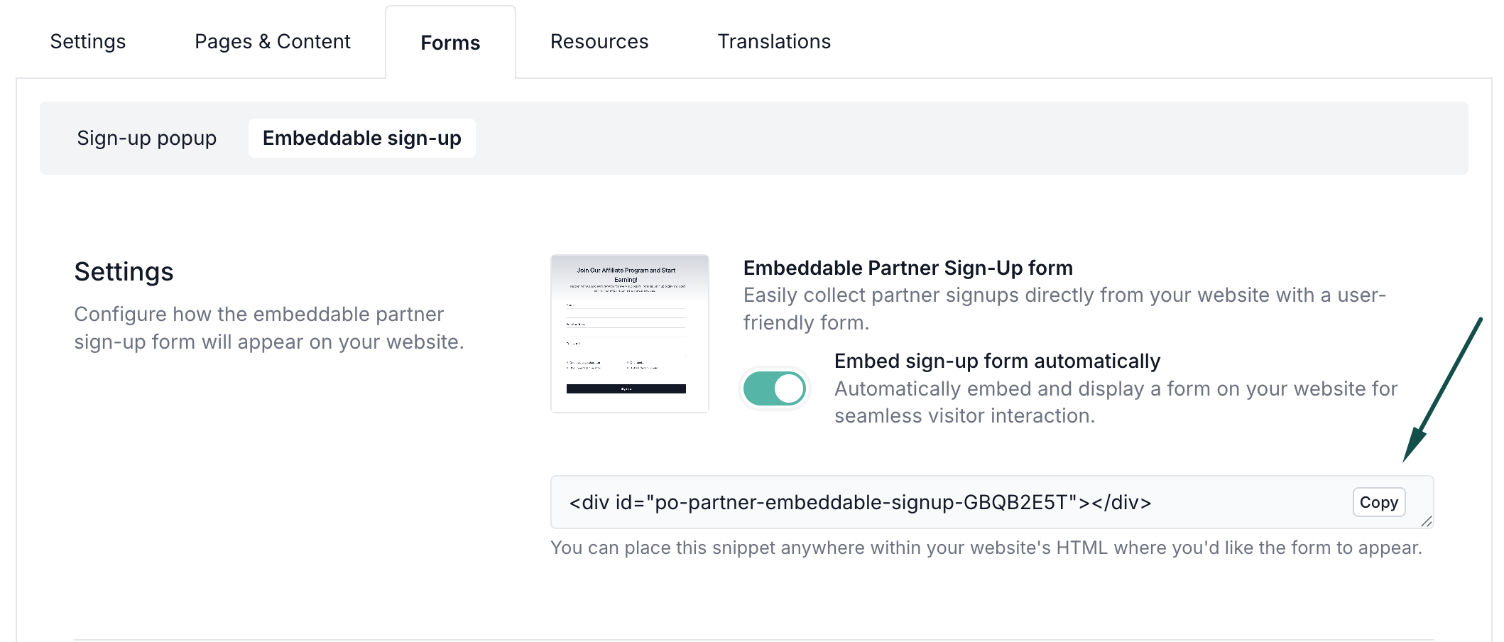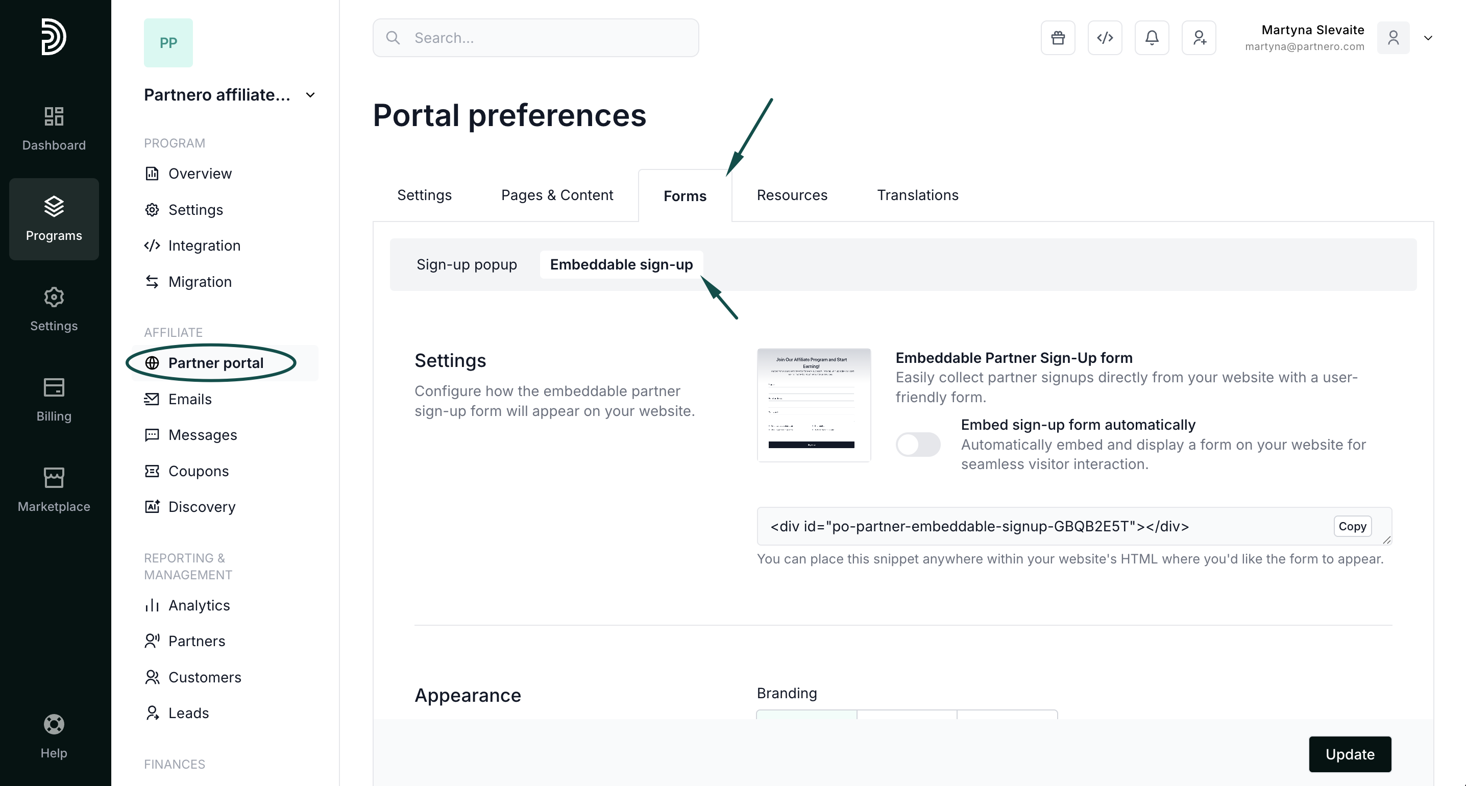 Embeddable partner registration forms let you collect partner signups directly from your own website or landing pages. They simplify the onboarding process, increase conversion rates by meeting partners where they are, and ensure signups are automatically connected to your Partnero program. This article explains how to create and embed these forms.