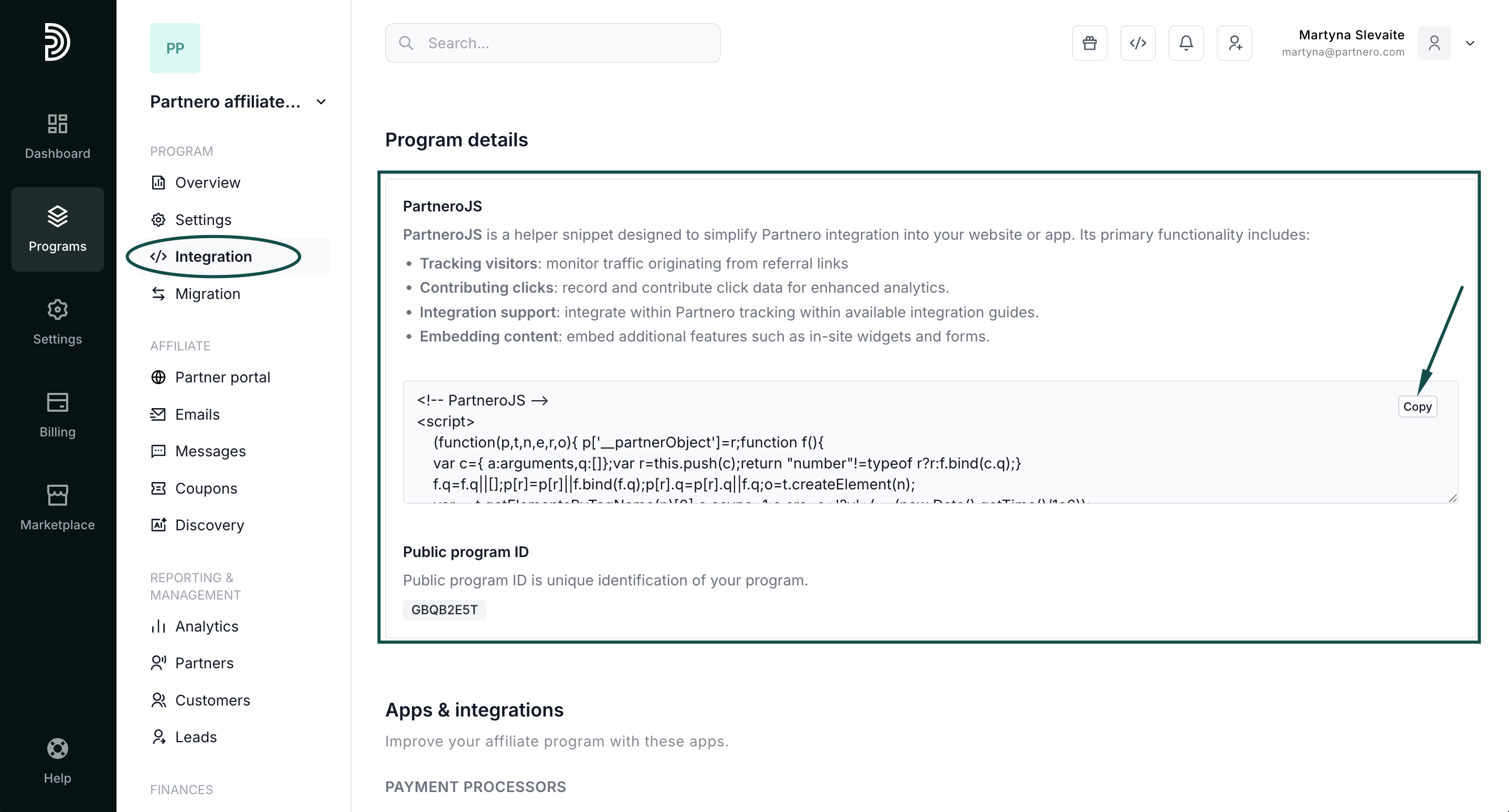 - Scroll down to Program details to locate the PartneroJS snippet: