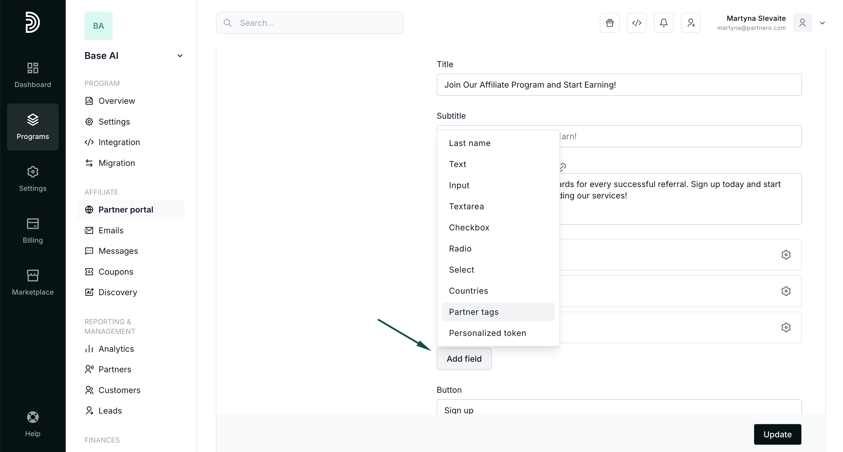 ⚠️ Important: PartneroJS snippet must be inserted on your website for the form to work.