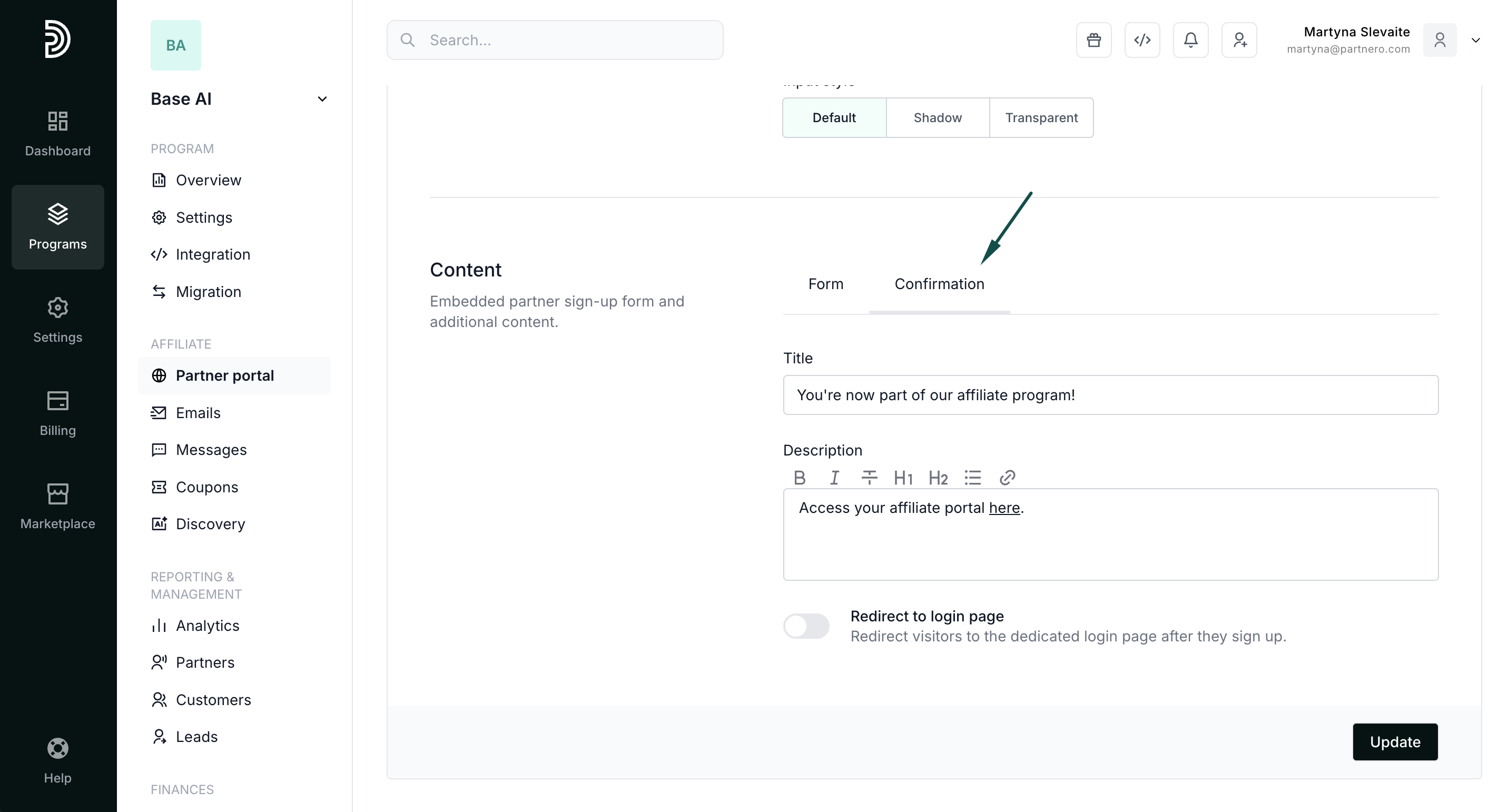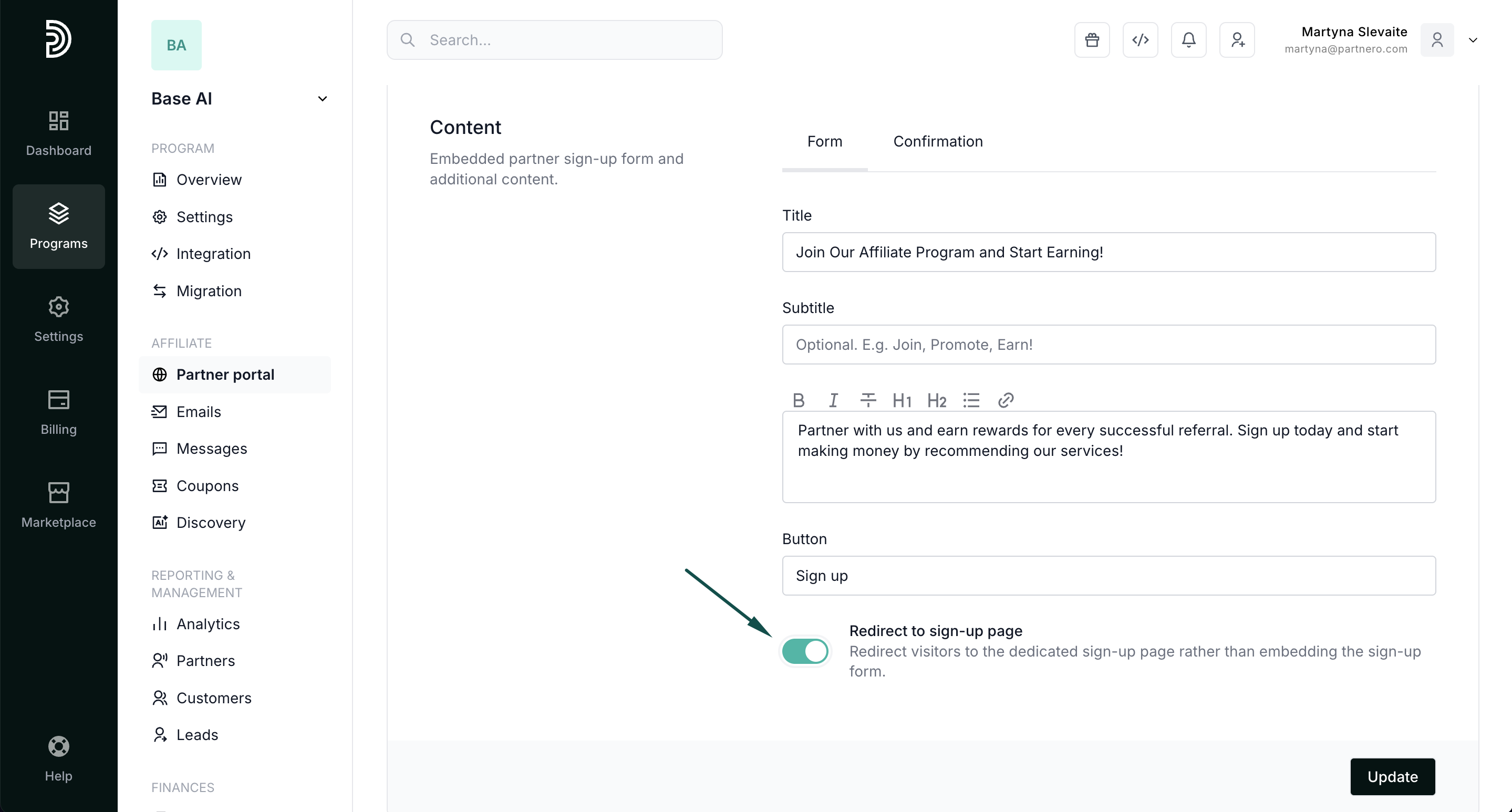 - Select to redirect visitors to a signup page. If you enable this option, the signup form will be removed from the form, and users will be redirected to the standard partner portal signup page upon clicking the CTA.