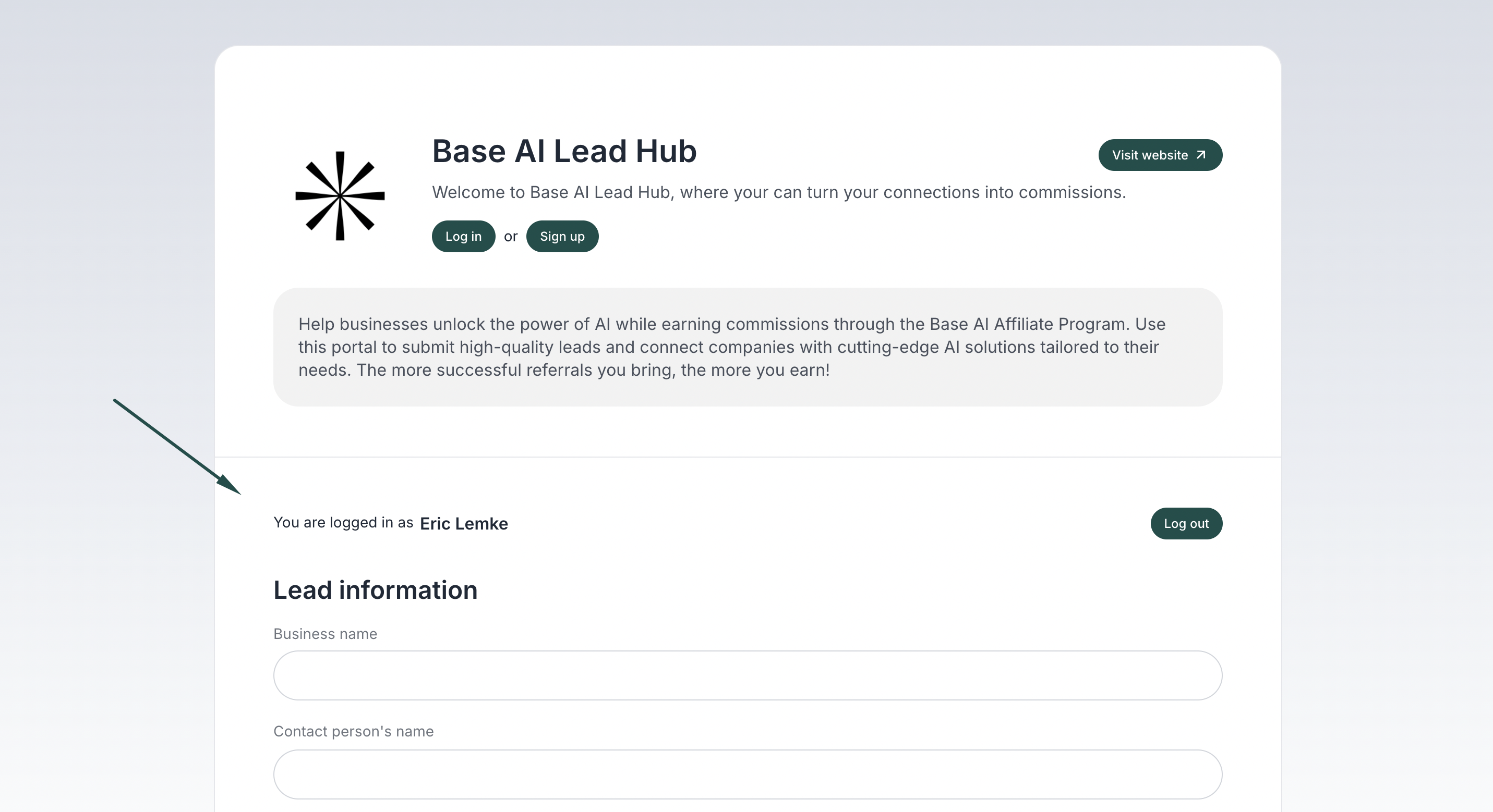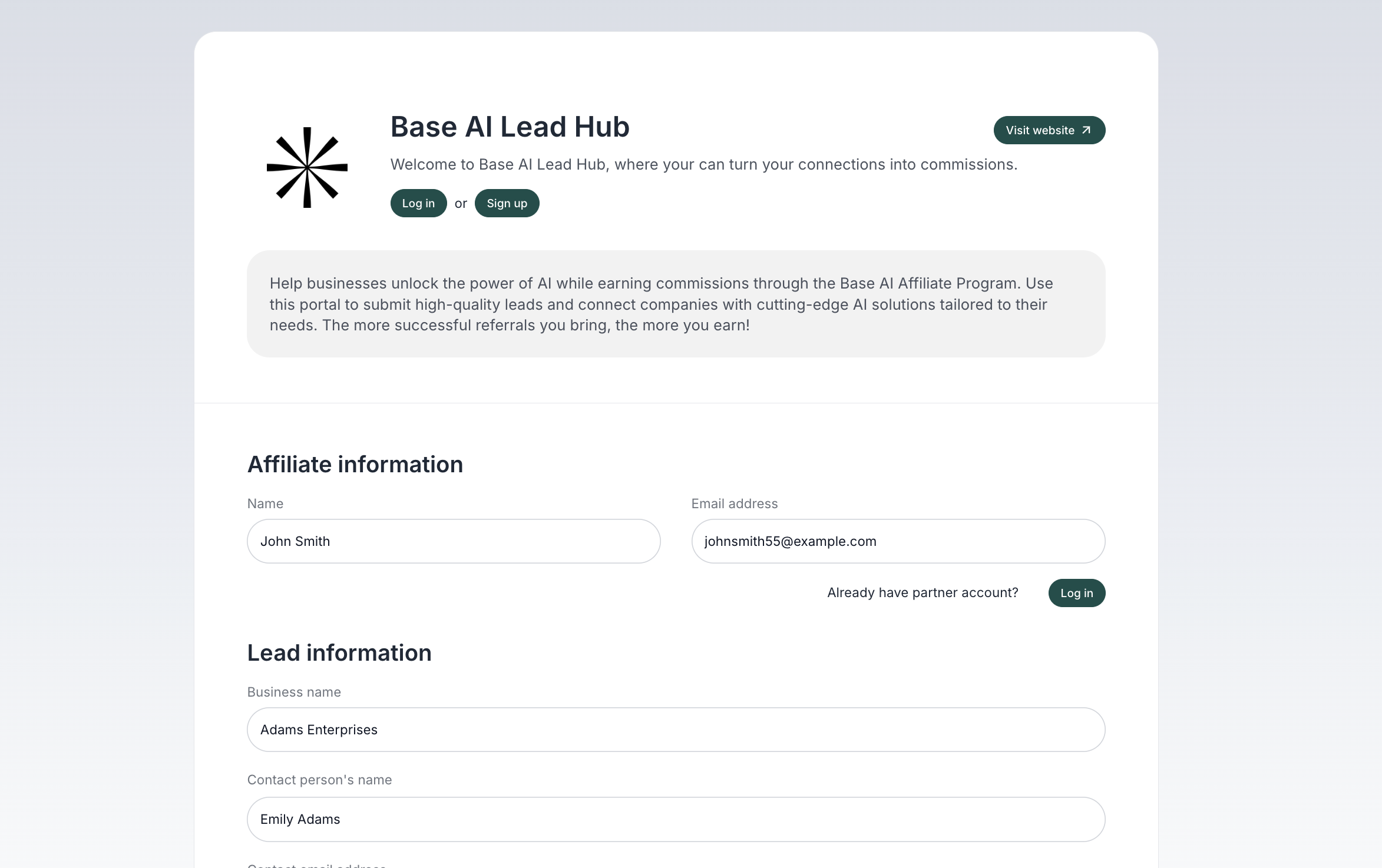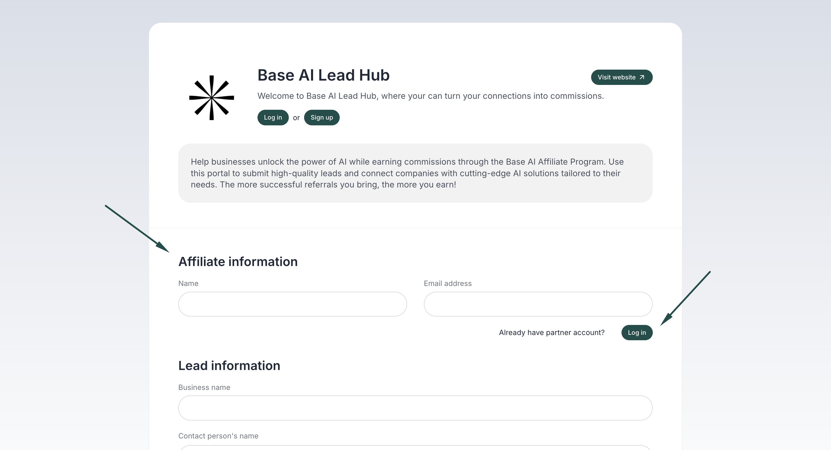 The lead submission page is available without logging in to the partner portal, so anyone can submit leads. Existing partners can choose to log in to the partner portal. New potential partners can either submit the lead by providing their email address and name, or they can choose to sign up for the affiliate program first.