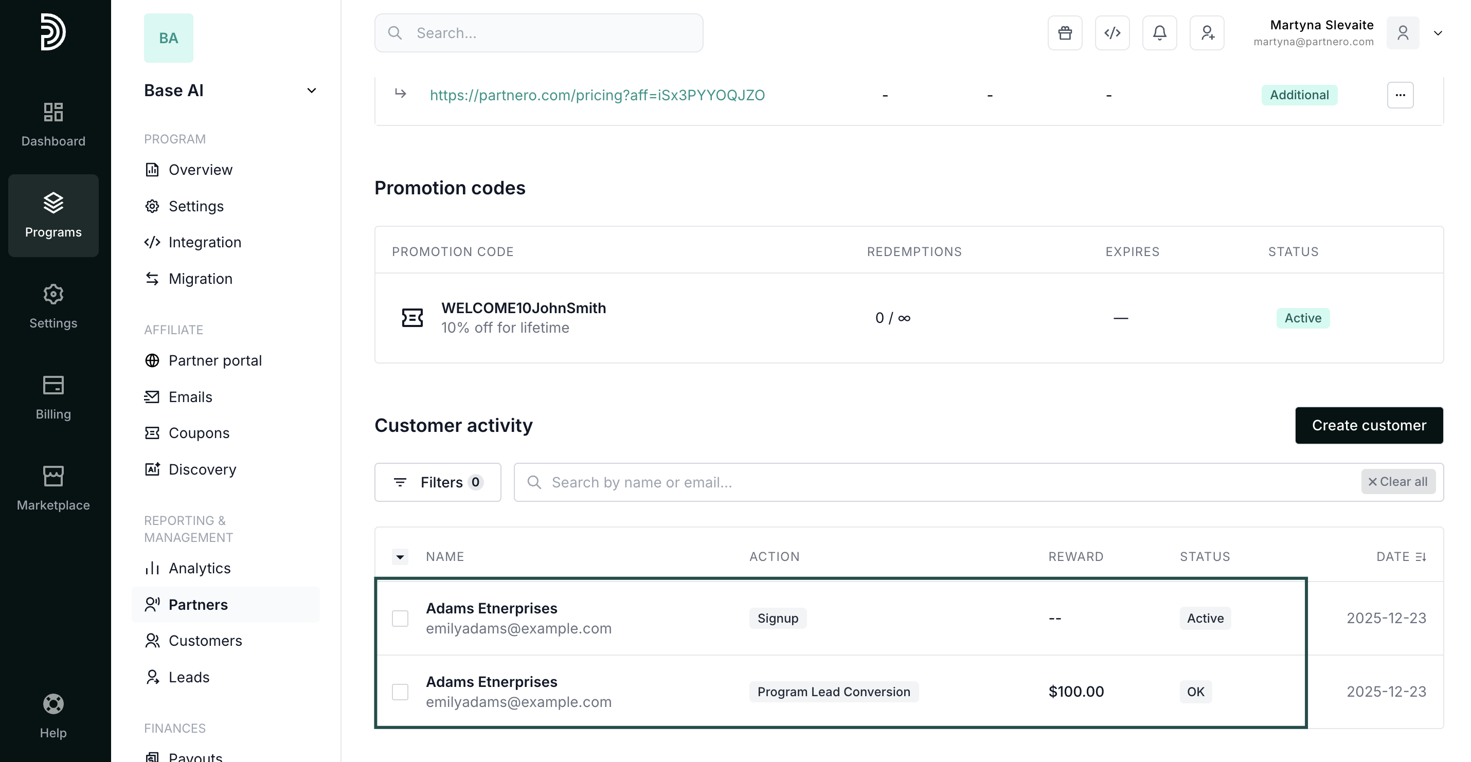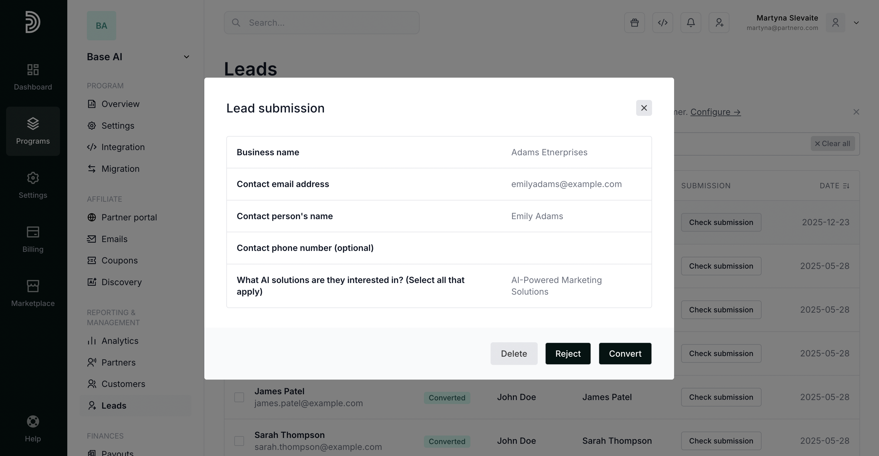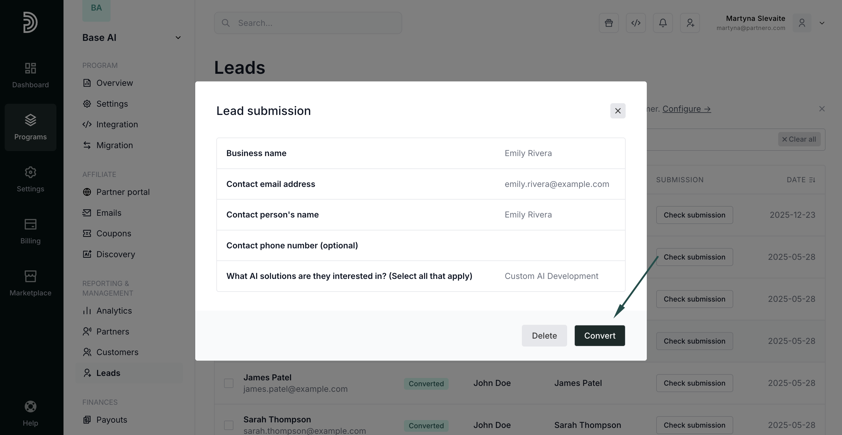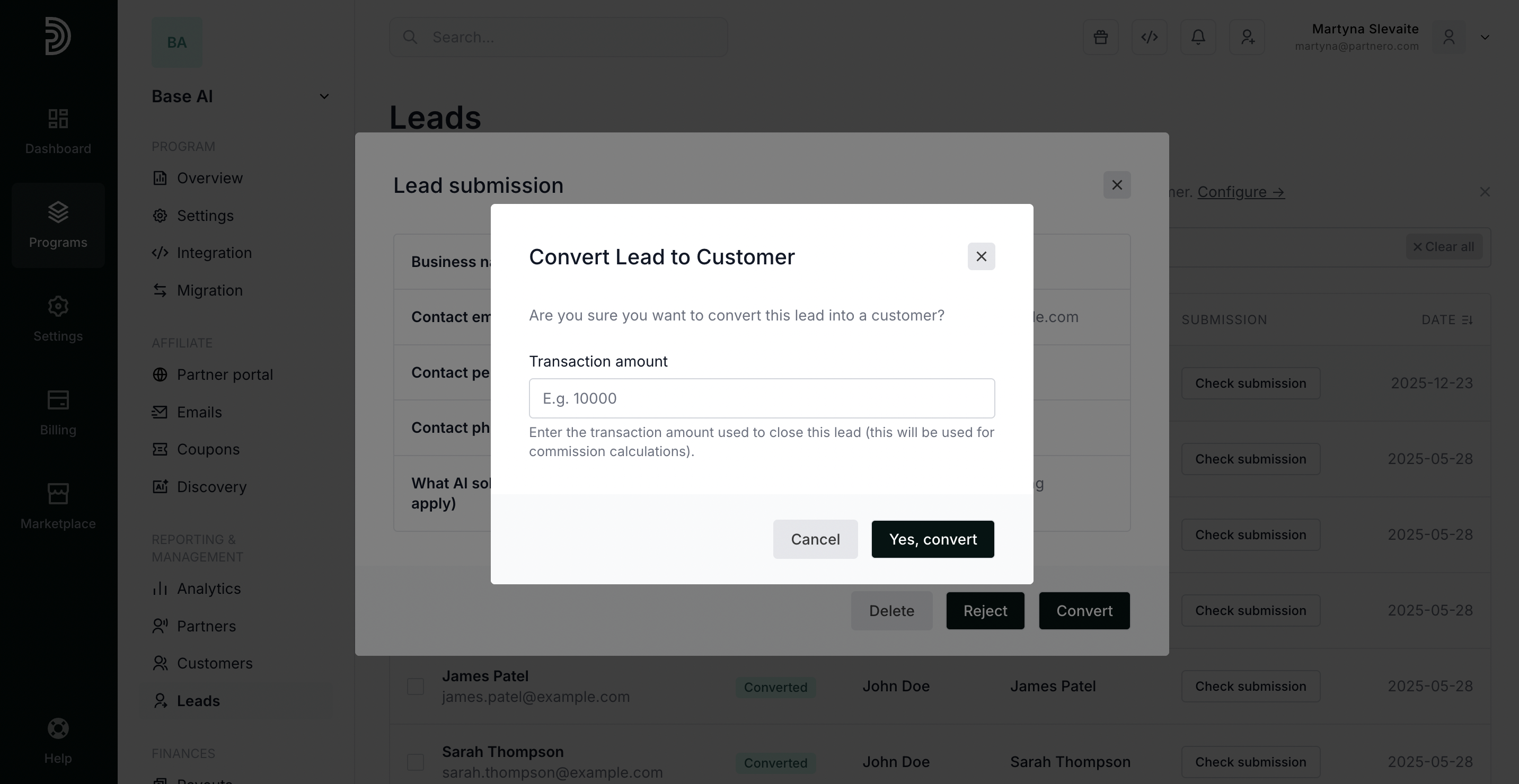 When you click Convert, a lead is turned into a customer, and a reward is generated based on the set commission structure.