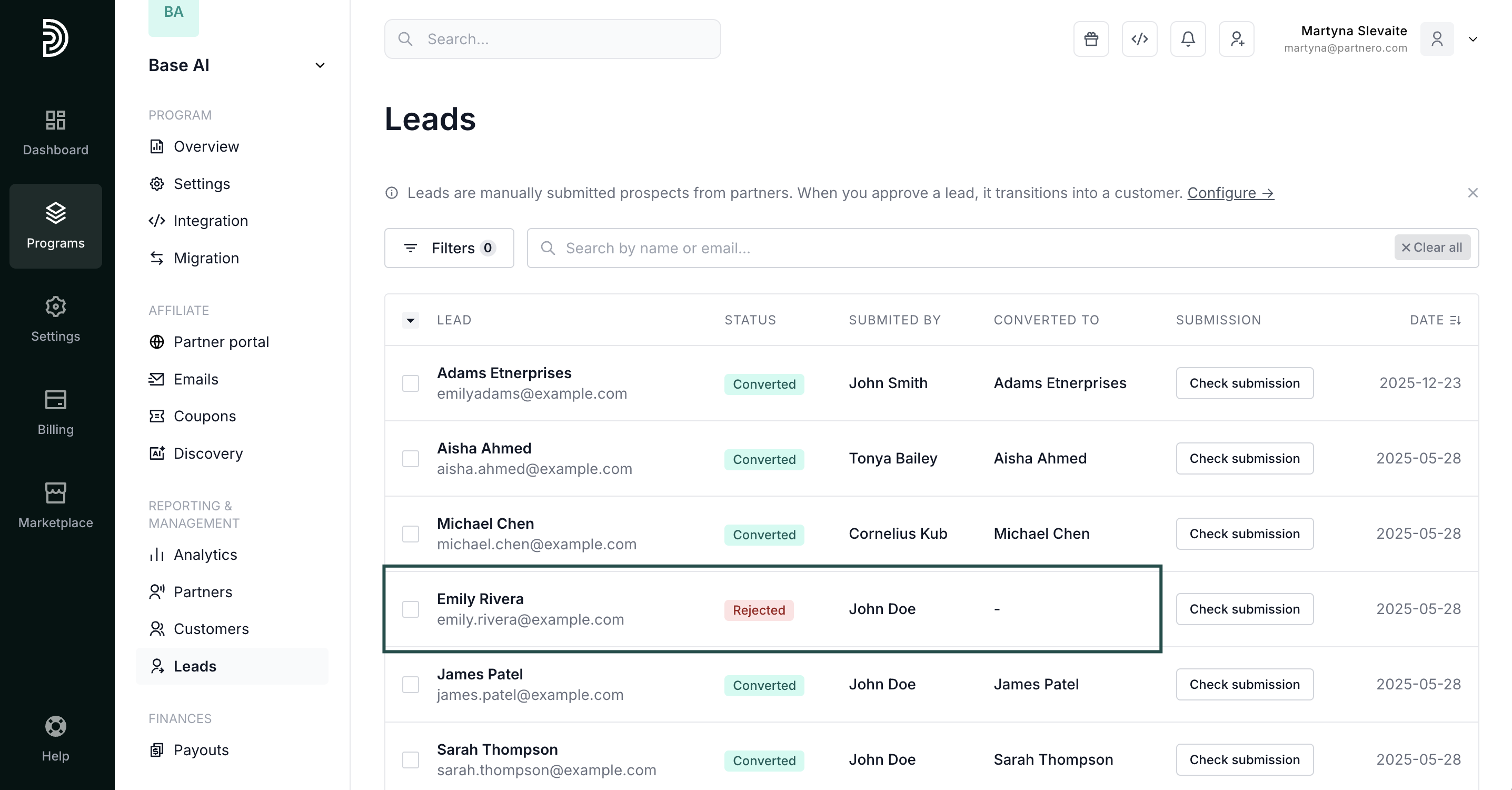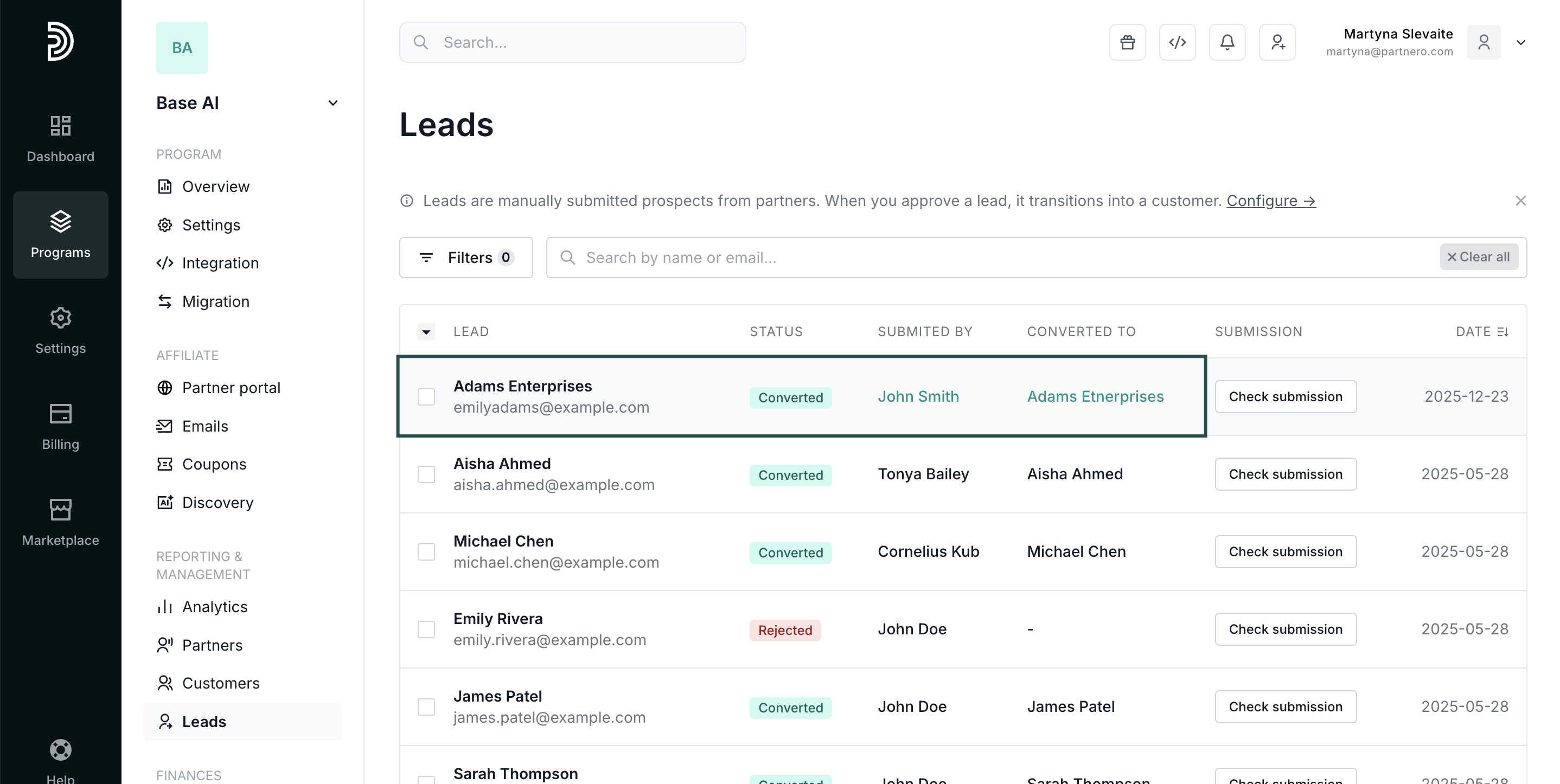 Once you enable the lead submission page, a new Leads option will appear on the left-hand side menu under Reporting & Management. Here, you can view and manage submitted leads.