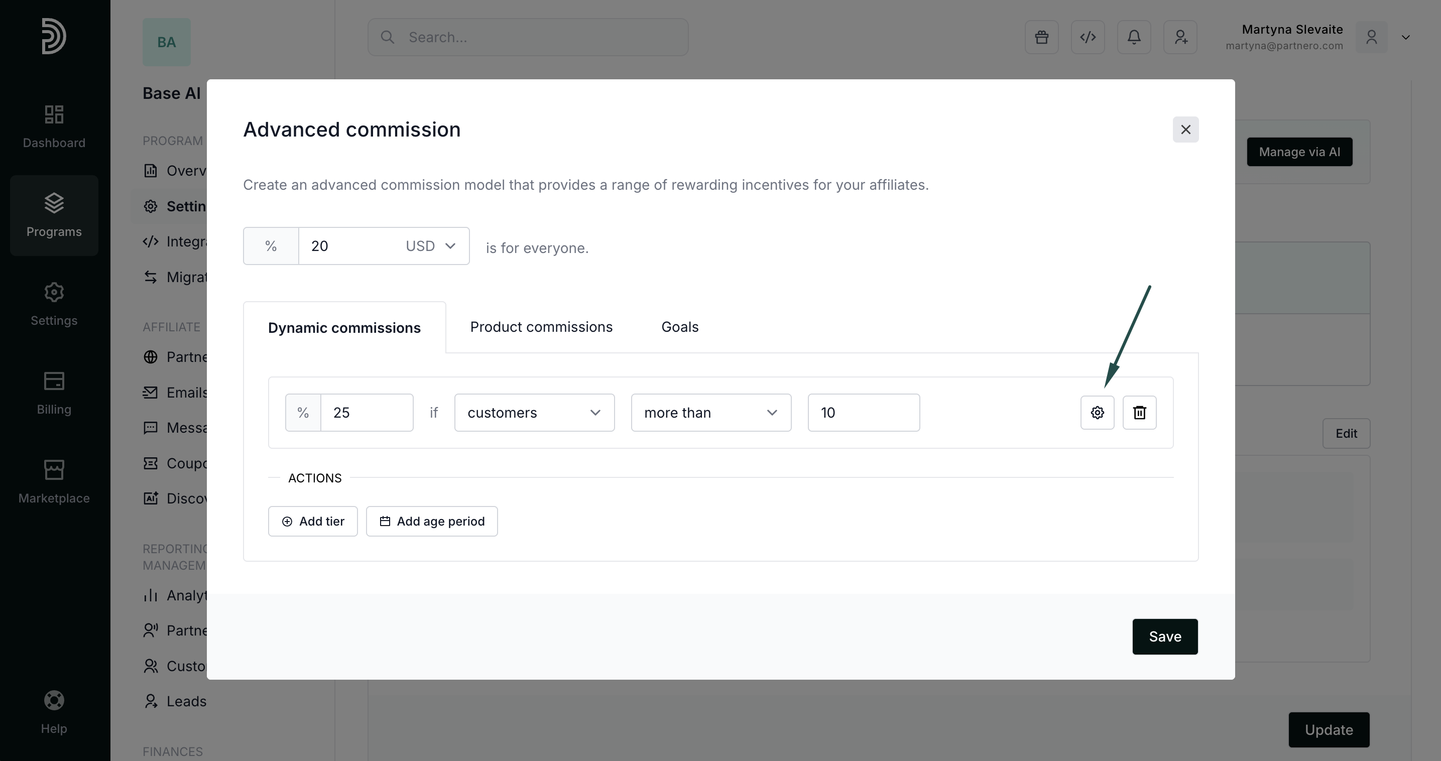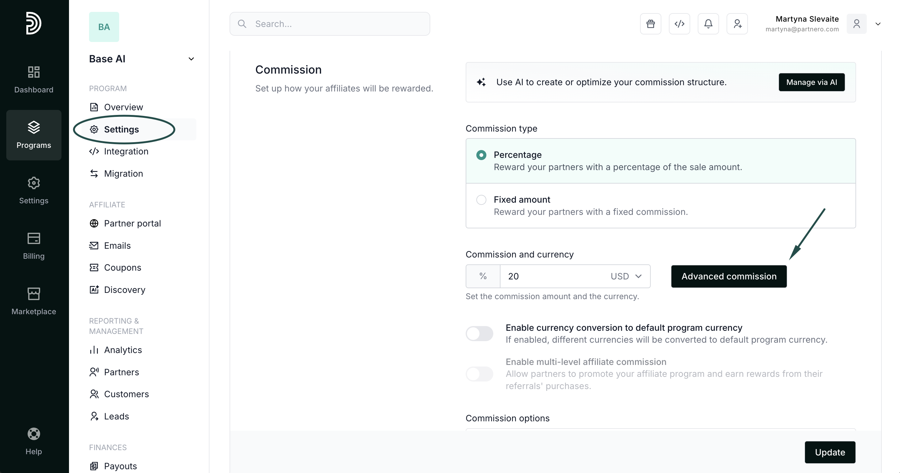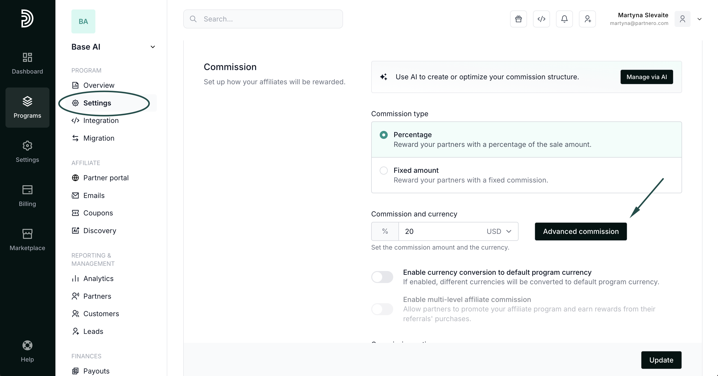 - Open your affiliate program and go to Settings under Program. Scroll down to the Commission section and click on Advanced commission: