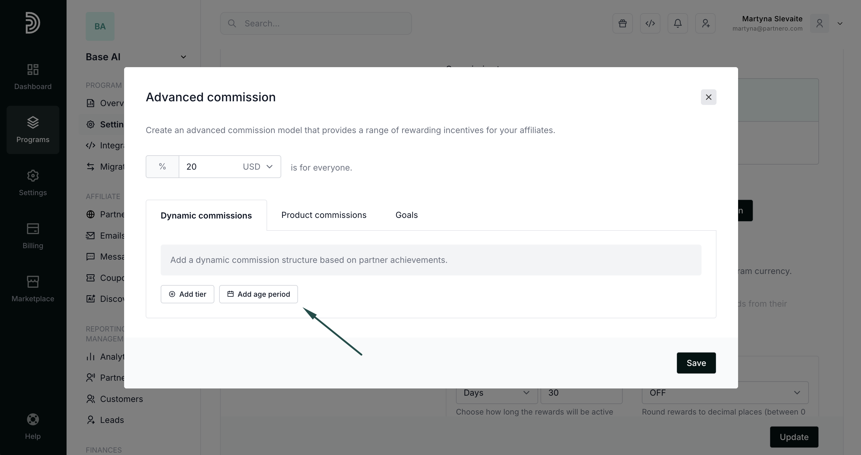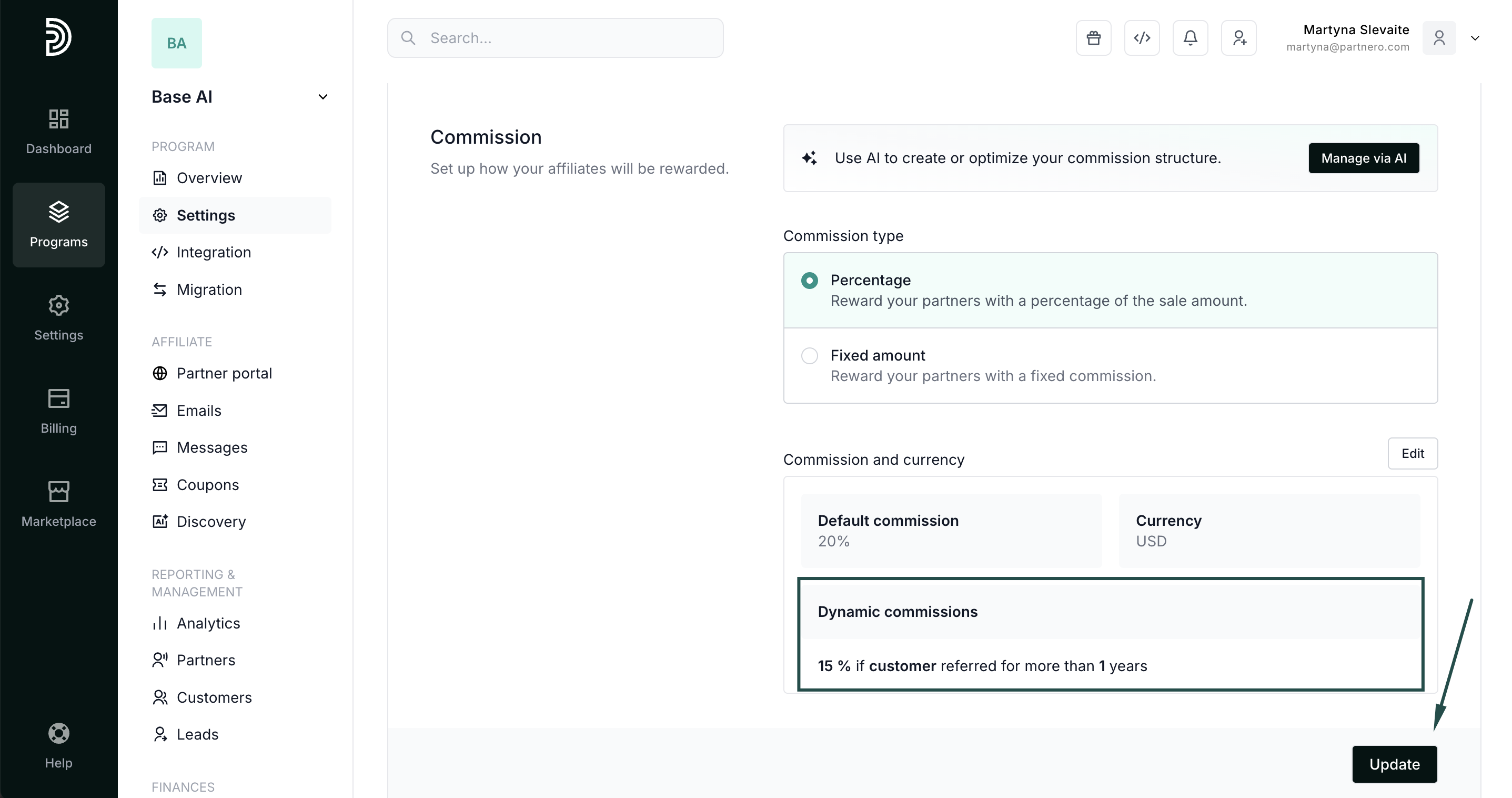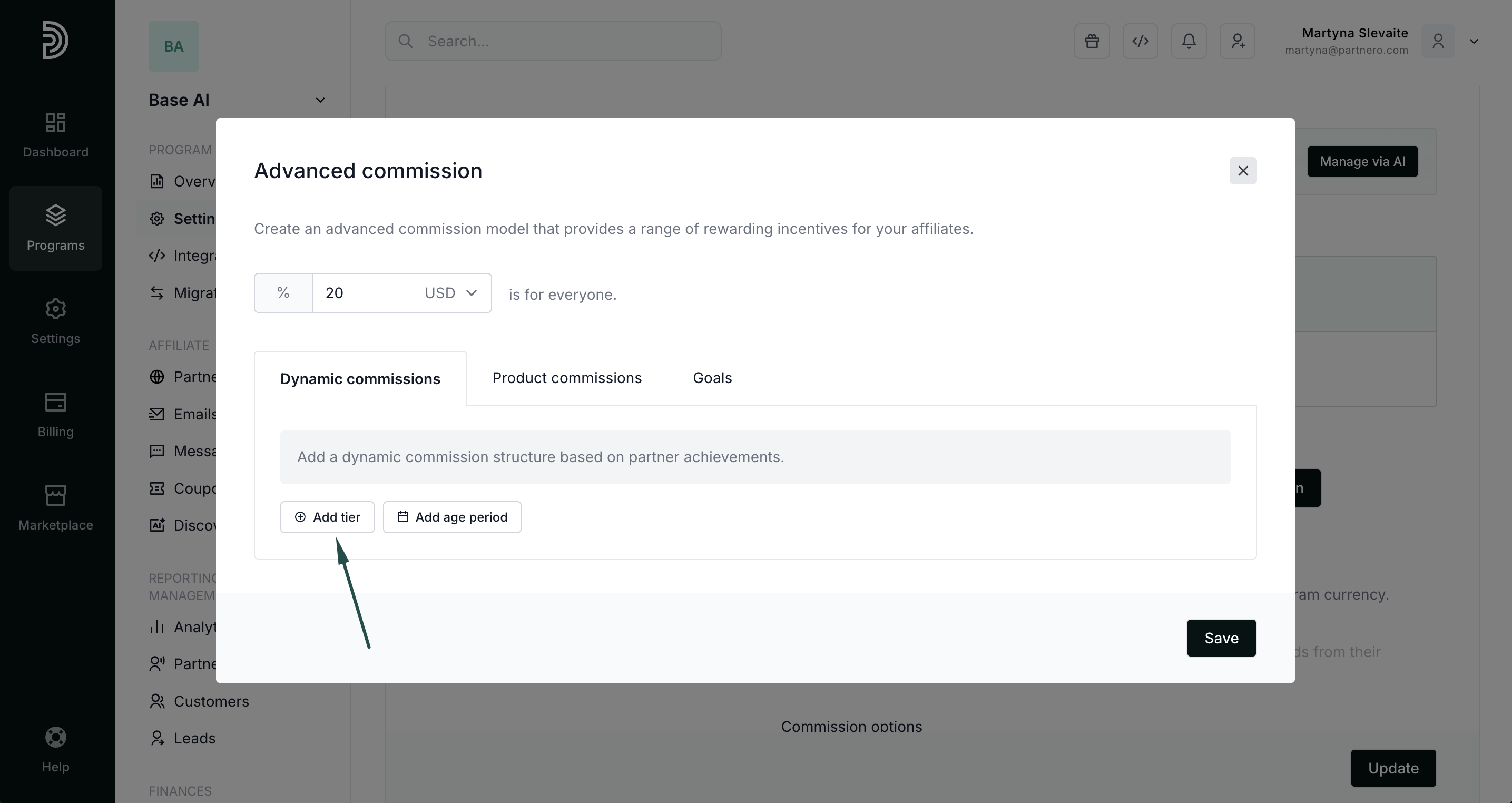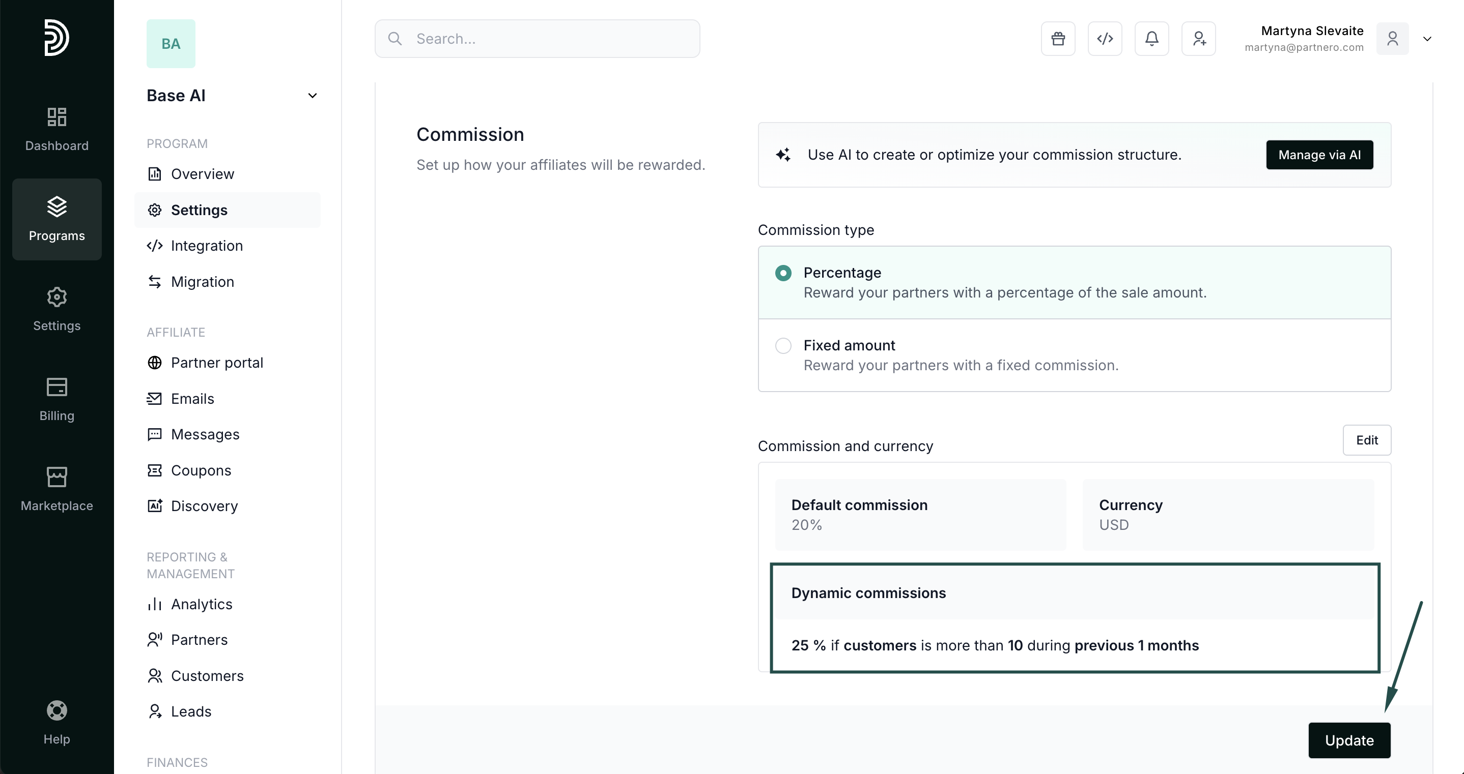 - Open your affiliate program and go to Settings under Program. Scroll down to the Commission section and click on Advanced commission: