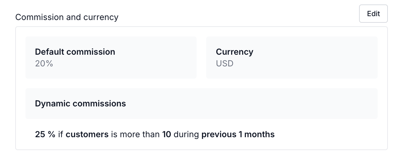 This means that when a referral signs up, the partner will receive a 20% commission for the 1st year of the referral's payments and 15% commission for the remaining time (based on the commission length set for the program). - Click Save. The default and dynamic commissions will be displayed: