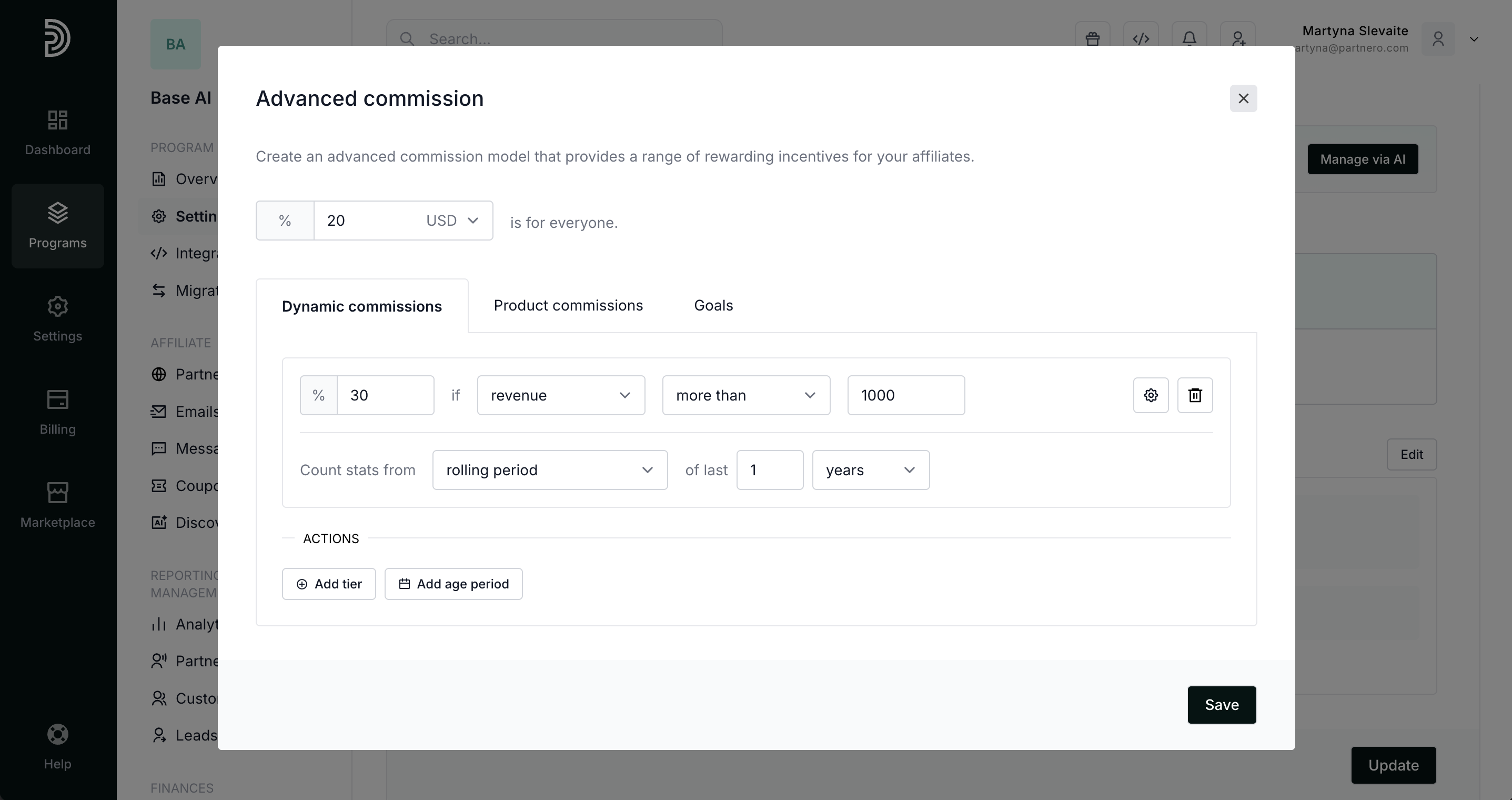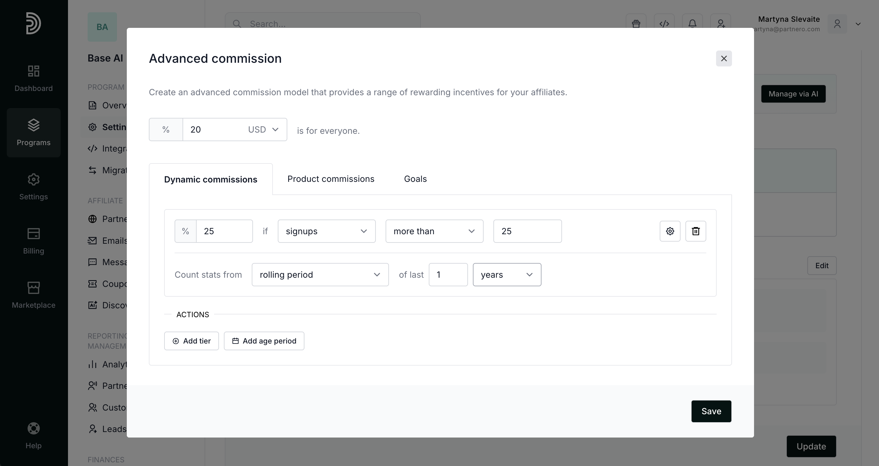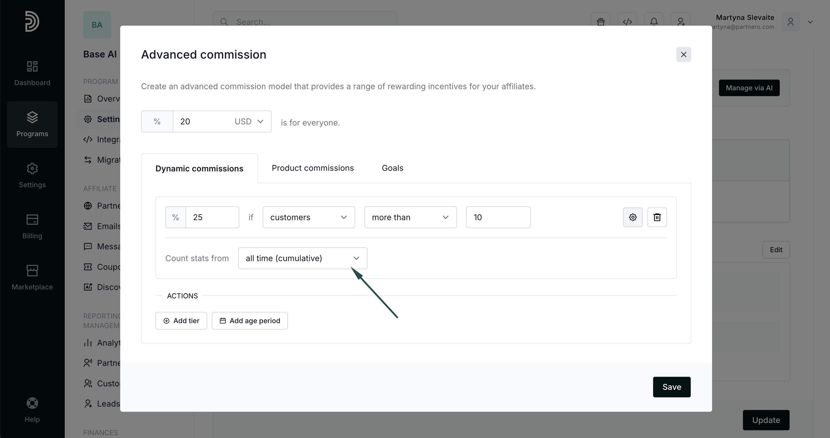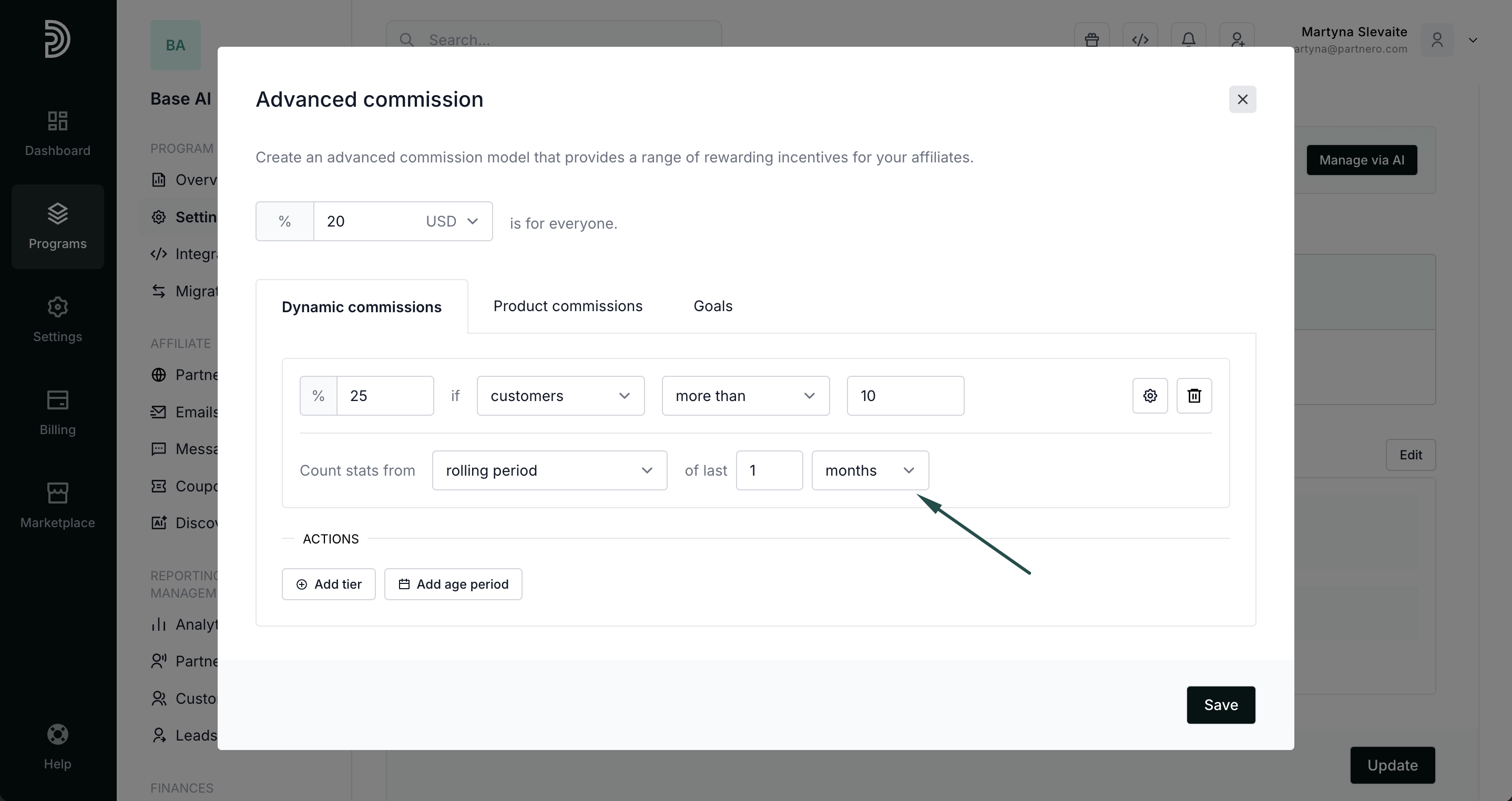With Partnero's advanced rewards, you can set up dynamic commissions based on a specified time period. There are two main settings for specifying the period: