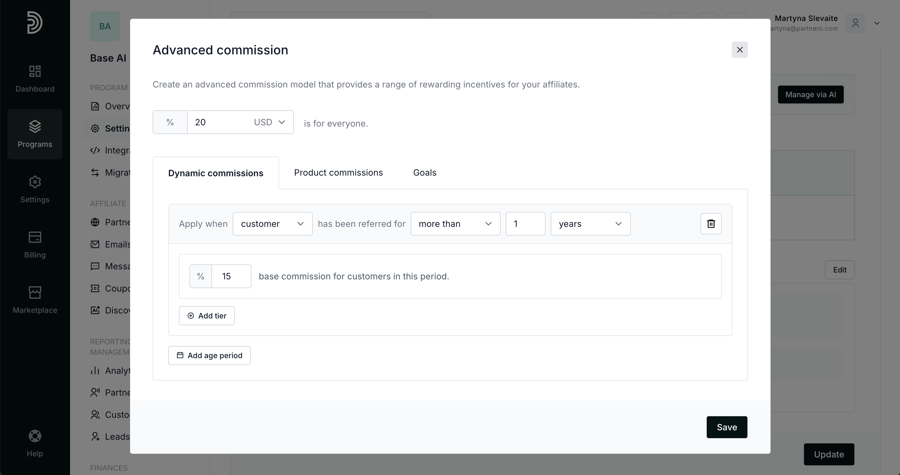 - Adjust the period and the reward. In the example below, the commission for a specific customer is reduced to 15% if they've been referred for more than 1 year: