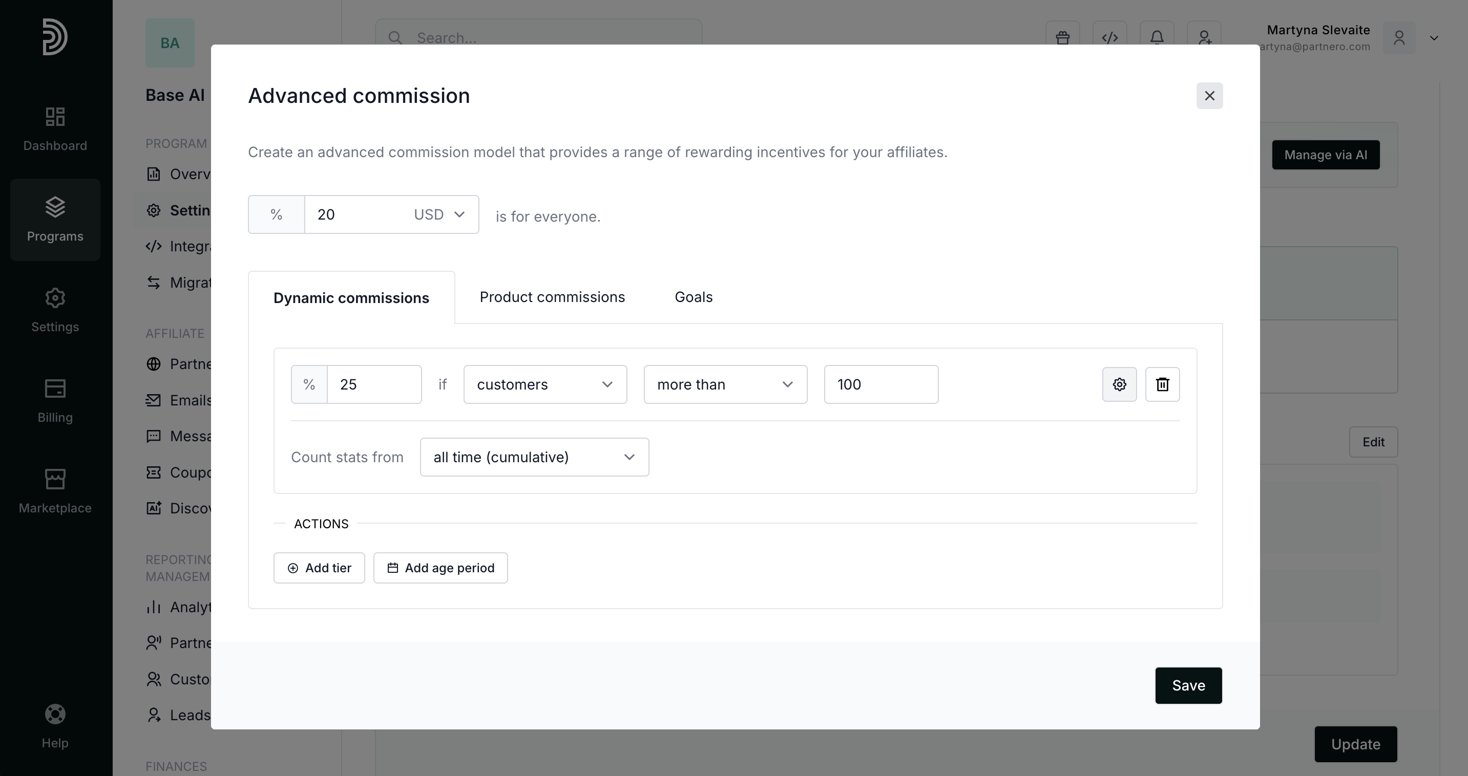 This means that the dynamic reward will trigger IF the condition is met within the set time. So, in this example, a customer will receive 25% commission if they have brought in more than 10 customers last month. - Click Save to close the modal and Update to apply your changes.