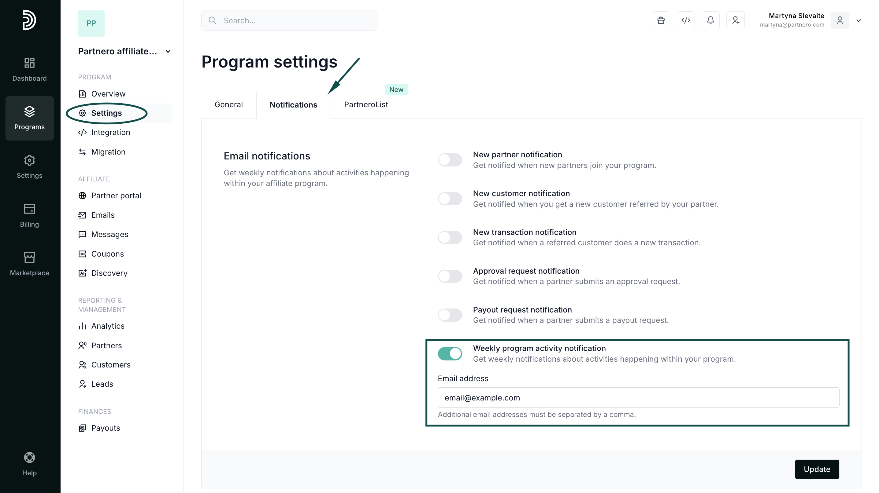 For affiliate and referral programs, you can enable weekly notification emails to be sent to your inbox. The emails will include key program metrics, such as revenue, rewards, and new partners.